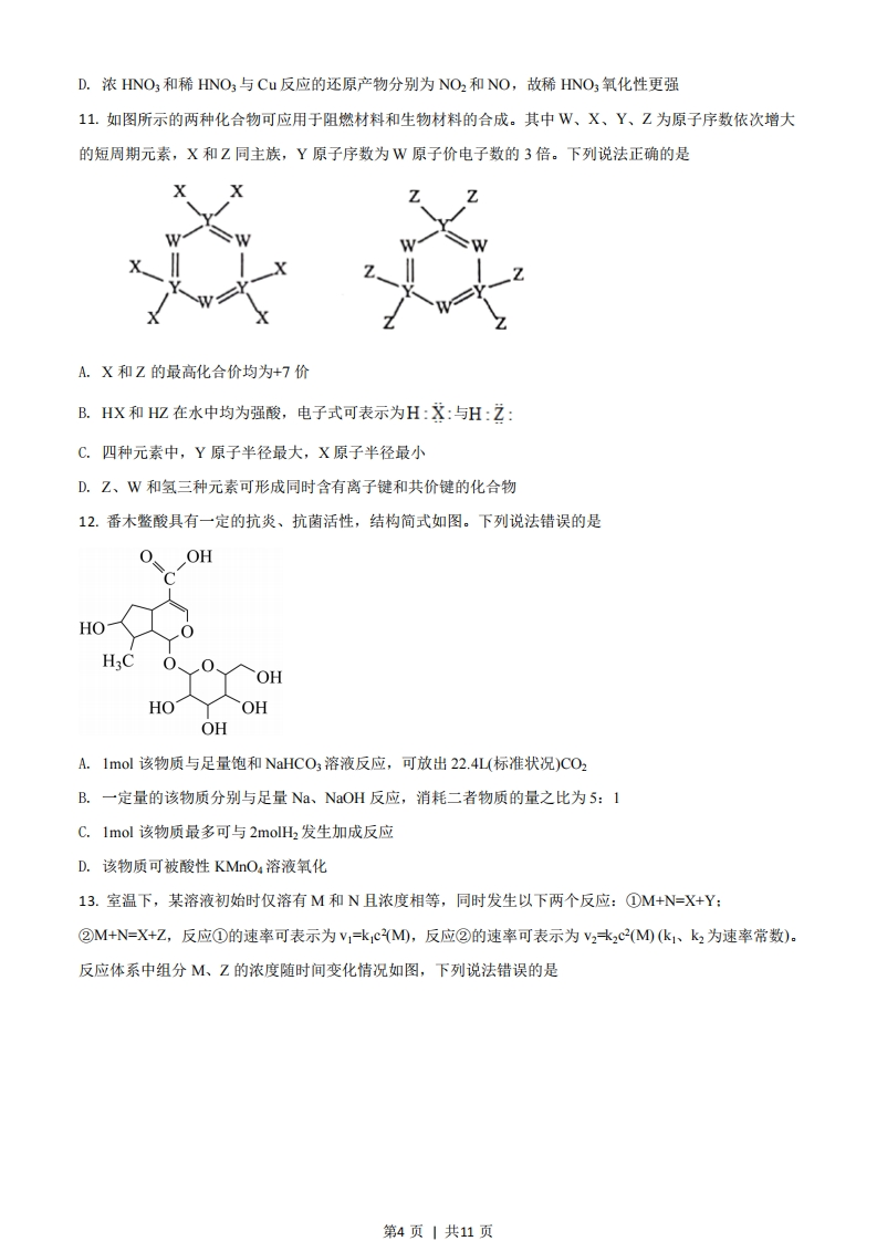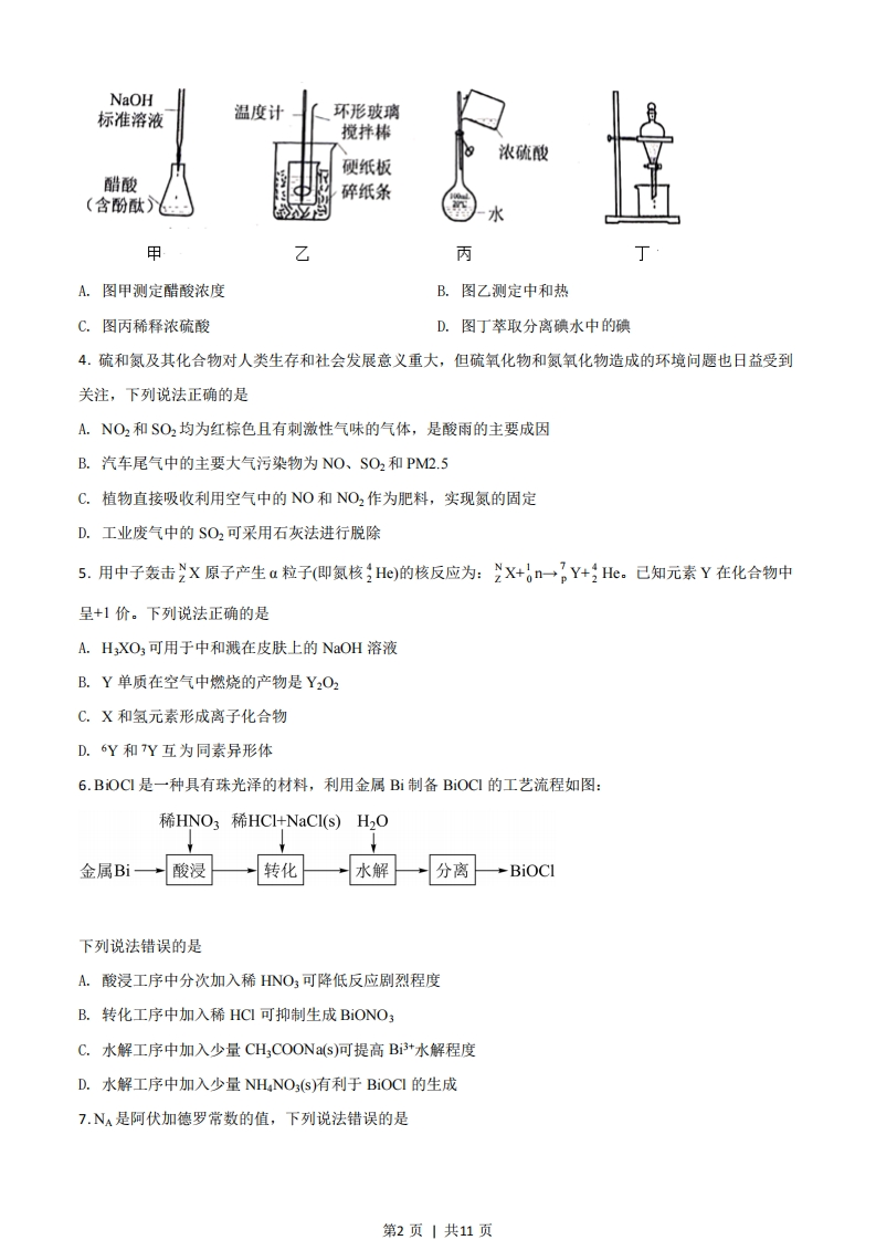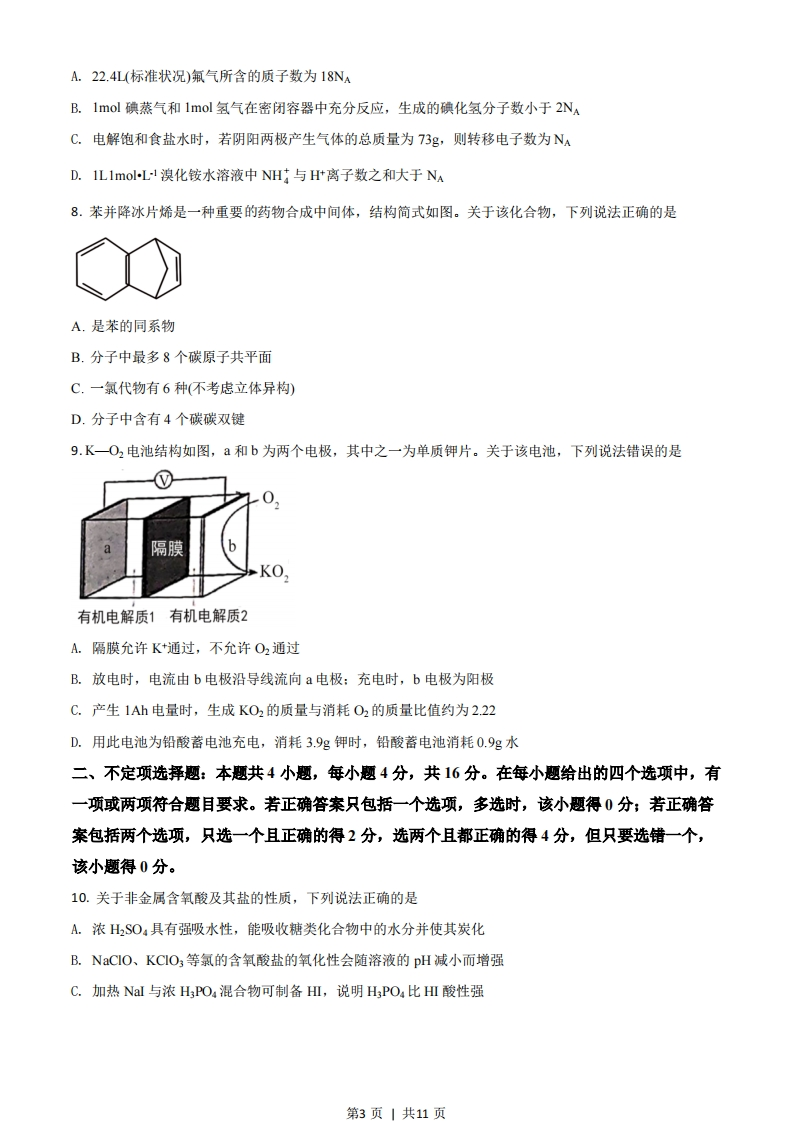 2021年河北省普通高中学业水平选择性考试化学注意事项:1答卷前,考生务必将自已的姓名、考生号、考场号、座位号填写在答题卡上。2.回答选择题时,选出每小题答案后,用铅笔把答题卡上对应题目的答案标号涂黑如需改动,用橡皮擦干净后,再选涂其他答案标号。回答非选择题时,将答案写在答题卡上。写在本试卷上无效。3.考试结束后,将本试卷和答题卡一并交回。可能用到的相对原子质量:H-1Li-7B-11C-120-16Na-23P-31S-32C1-35.5K-39Pb-207一、单项选择题:本题共9小题,每小题3分,共27分。在每小题给出的四个选项中,只有一项是符合题目要求的。1.“灌钢法”是我国古代劳动人民对钢铁冶炼技术的重大贡献,陶弘景在其《本草经集注》中提到“钢铁是杂炼生鍒作刀镰者”。“灌钢法”主要是将生铁和熟铁(含碳量约01%)混合加热,生铁熔化灌入熟铁,再锻打成钢。下列说法错误的是A.钢是以铁为主的含碳合金B.钢的含碳量越高,硬度和脆性越大C.生铁由于含碳量高,熔点比熟铁高D.冶炼铁的原料之一赤铁矿的主要成分为F©zO32.高分子材料在生产生活中应用广泛。下列说法错误的是A.芦苇可用于制造黏胶纤维,其主要成分为纤维素B.聚氯乙烯通过加聚反应制得,可用于制作不粘锅的耐热涂层C.淀粉是相对分子质量可达几十万的天然高分子物质D.大豆蛋白纤维是一种可降解材料3.下列操作规范且能达到实验目的的是第1页1共11页NaOH标准溶液温度计环形玻璃搅拌棒浓硫酸硬纸板醋酸碎纸条(含酚酞)甲乙丙A.图甲测定醋酸浓度B.图乙测定中和热C.图丙稀释浓硫酸D.图丁萃取分离碘水中的碘4.硫和氮及其化合物对人类生存和社会发展意义重大,但硫氧化物和氮氧化物造成的环境问题也日益受到关注,下列说法正确的是A.NO2和SO2均为红棕色且有刺激性气味的气体,是酸雨的主要成因B.汽车尾气中的主要大气污染物为NO、SO2和PM2.5C.植物直接吸收利用空气中的NO和O2作为肥料,实现氮的固定D.工业废气中的SO2可采用石灰法进行脱除5.用中子轰击义X原子产生a粒子(即氮核He)的核反应为:YX+。n一}Y+He。已知元素Y在化合物中呈+1价。下列说法正确的是A.H,XO3可用于中和溅在皮肤上的NaOH溶液B.Y单质在空气中燃烧的产物是Y2O2C.X和氢元素形成离子化合物D.6Y和Y互为同素异形体6.BOCI是一种具有珠光泽的材料,利用金属Bi制备BiOCl的工艺流程如图:稀HNO3稀HC+NaCl(s)H2O金属Bi一酸浸转化水解分离BiOCI下列说法错误的是A.酸浸工序中分次加入稀HNO3可降低反应剧烈程度B.转化工序中加入稀HCI可抑制生成BiONO3C.水解工序中加入少量CH COON(s)可提高B3+水解程度D.水解工序中加入少量NHNO3(s)有利于BiOC的生成7.NA是阿伏加德罗常数的值,下列说法错误的是第2页|共11页A.22.4L(标准状况)氟气所含的质子数为18NAB.lmol碘蒸气和1mol氢气在密闭容器中充分反应,生成的碘化氢分子数小于2NC.电解饱和食盐水时,若阴阳两极产生气体的总质量为73g,则转移电子数为NAD.1 LImol-L1溴化铵水溶液中NH与H离子数之和大于NA8.苯并降冰片烯是一种重要的药物合成中间体,结构简式如图。关于该化合物,下列说法正确的是A.是苯的同系物B.分子中最多8个碳原子共平面C.一氯代物有6种(不考虑立体异构)D.分子中含有4个碳碳双键9.K一O,电池结构如图,a和b为两个电极,其中之一为单质钾片。关于该电池,下列说法错误的是0隔膜b-KO有机电解质1有机电解质2A.隔膜允许K+通过,不允许O2通过B.放电时,电流由b电极沿导线流向a电极:充电时,b电极为阳极C.产生1Ah电量时,生成KO2的质量与消耗O2的质量比值约为2.22D.用此电池为铅酸蓄电池充电,消耗3.9g钾时,铅酸蓄电池消耗0.9g水二、不定项选择题:本题共4小题,每小题4分,共16分。在每小题给出的四个选项中,有一项或两项符合题目要求。若正确答案只包括一个选项,多选时,该小题得0分;若正确答案包括两个选项,只选一个且正确的得2分,选两个且都正确的得4分,但只要选错一个,该小题得0分。10.关于非金属含氧酸及其盐的性质,下列说法正确的是A.浓H2SO4具有强吸水性,能吸收糖类化合物中的水分并使其炭化B.NaCIO、KCIO3等氯的含氧酸盐的氧化性会随溶液的pH减小而增强C.加热Nal与浓HPO,混合物可制备HⅢ,说明HPO4比HⅢ酸性强第3页|共11页