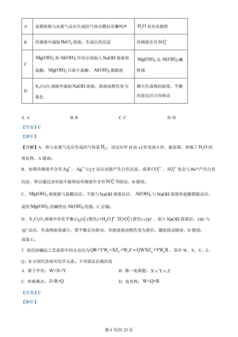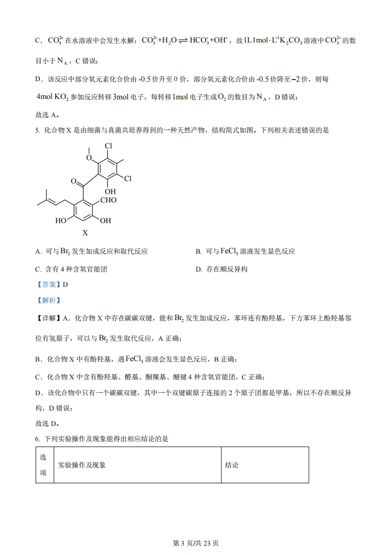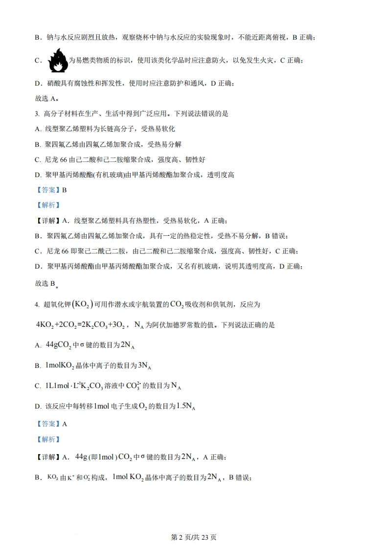 2024年普通高中学业水平选择性考试(河北卷)化学本试卷满分100分,考试时间75分钟。可能用到的相对原子质量:H-1C-120-16F-19C1-35.5K-39Cr-52Br-80Bi-209一、选择题:本题共14小题,每小题3分,共42分。在每)小题给出的四个选项中,只有一项是符合题目要求的。1.燕赵大地历史悠久,文化灿烂。对下列河北博物院馆藏文物的说法错误的是战国宫门青铜铺首西汉透雕白玉臂五代彩绘石质浮雕元青花釉里红瓷盖耀A.青铜铺首主要成分是铜锡合金B.透雕白玉璧主要成分是硅酸盐C.石质浮雕主要成分是碳酸钙D.青花釉里红瓷盖罐主要成分是硫酸钙【答案】D【解析】【详解】A.青铜铺首是青铜器,青铜的主要成分是铜锡合金,A正确:B.透雕白玉璧是玉石,玉石的主要成分是硅酸盐,B正确:C.石质浮雕是汉白玉,汉白玉的主要成分是碳酸钙,C正确:D.青花釉里红瓷盖罐是陶瓷,陶瓷的主要成分是硅酸盐,D错误:故选D。2.关于实验室安全,下列表述错误的是A.BaSO,等钡的化合物均有毒,相关废弃物应进行无害化处理B.观察烧杯中钠与水反应的实验现象时,不能近距离俯视C.具有标识的化学品为易燃类物质,应注意防火D.硝酸具有腐蚀性和挥发性,使用时应注意防护和通风【答案】A【解析】【详解】A.BSO,性质稳定,不溶于水和酸,可用作“钡餐”说明对人体无害,无毒性,A错误:第1页供23页B.钠与水反应剧烈且放热,观察烧杯中钠与水反应的实验现象时,不能近距离俯视,B正确:为易燃类物质的标识,使用该类化学品时应注意防火,以免发生火灾,C正确:D.硝酸具有腐蚀性和挥发性,使用时应注意防护和通风,D正确:故选A。3.高分子材料在生产、生活中得到广泛应用。下列说法错误的是A.线型聚乙烯塑料为长链高分子,受热易软化B.聚四氟乙烯由四氟乙烯加聚合成,受热易分解C.尼龙66由己二酸和己二胺缩聚合成,强度高、韧性好D.聚甲基丙烯酸酯(有机玻璃)由甲基丙烯酸酯加聚合成,透明度高【答案】B【解析】【详解】A,线型聚乙烯塑料具有热塑性,受热易软化,A正确:B.聚四氟乙烯由四氟乙烯加聚合成,具有一定的热稳定性,受热不易分解,B错误:C.尼龙66即聚己二酰己二胺,由己二酸和己二胺缩聚合成,强度高、韧性好,C正确:D.聚甲基丙烯酸酯由甲基丙烯酸酯加聚合成,又名有机玻璃,说明其透明度高,D正确:故选B。4.超氧化钾(KO2)可用作潜水或宇航装置的CO2吸收剂和供氧剂,反应为4KO2+2CO2=2K,CO3+3O2,N。为阿伏加德罗常数的值。下列说法正确的是A.44gC0,中o键的数目为2NB.1 molKO2晶体中离子的数目为3NC.1L1mol.LK,CO3溶液中CO的数目为NAD.该反应中每转移1mol电子生成O2的数目为l1.5N【答案】A【解析】【详解】A.44g(即1mol)CO2中c键的数目为2Na,A正确:B.KO2由K和O构成,1 mol KO2晶体中离子的数目为2NA,B错误:第2页供23页C.CO在水溶液中会发生水解:CO+H,O≥HCO+OH,故1L1 mol.LK,CO3溶液中CO3的数目小于NA,C错误:D.该反应中部分氧元素化合价由-0.5价升至0价,部分氧元素化合价由-0.5价降至-2价,则每4 mol KO2参加反应转移3mol电子,每转移1mol电子生成O2的数目为NA,D错误:故选A。5.化合物X是由细菌与真菌共培养得到的一种天然产物,结构简式如图。下列相关表述错误的是CIOHCHOHOOHXA.可与Br,发生加成反应和取代反应B.可与FeCl3溶液发生显色反应C.含有4种含氧官能团D.存在顺反异构【答案】D【解析】【详解】A.化合物X中存在碳碳双键,能和B红发生加成反应,苯环连有酚羟基,下方苯环上酚羟基邻位有氢原子,可以与B红发生取代反应,A正确:B.化合物X中有酚羟基,遇FCl3溶液会发生显色反应,B正确:C.化合物X中含有酚羟基、醛基、酮羰基、醚键4种含氧官能团,C正确:D.该化合物中只有一个碳碳双键,其中一个双键碳原子连接的2个原子团都是甲基,所以不存在顺反异构,D错误:故选D。6.下列实验操作及现象能得出相应结论的是选实验操作及现象结论项第3页供23页