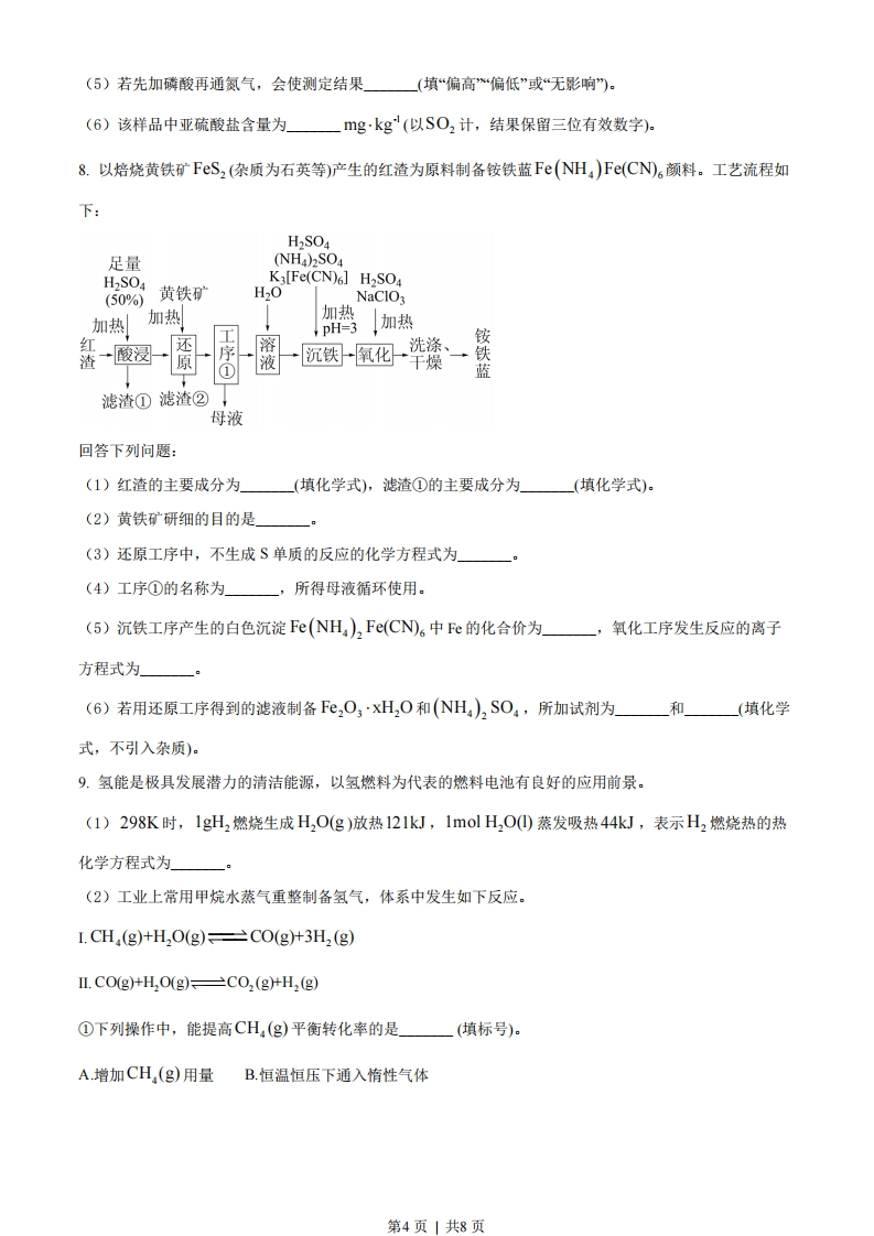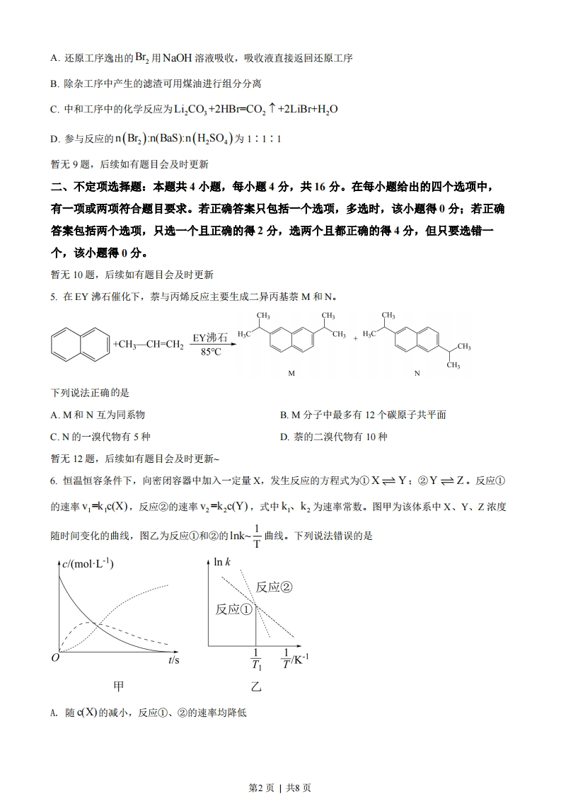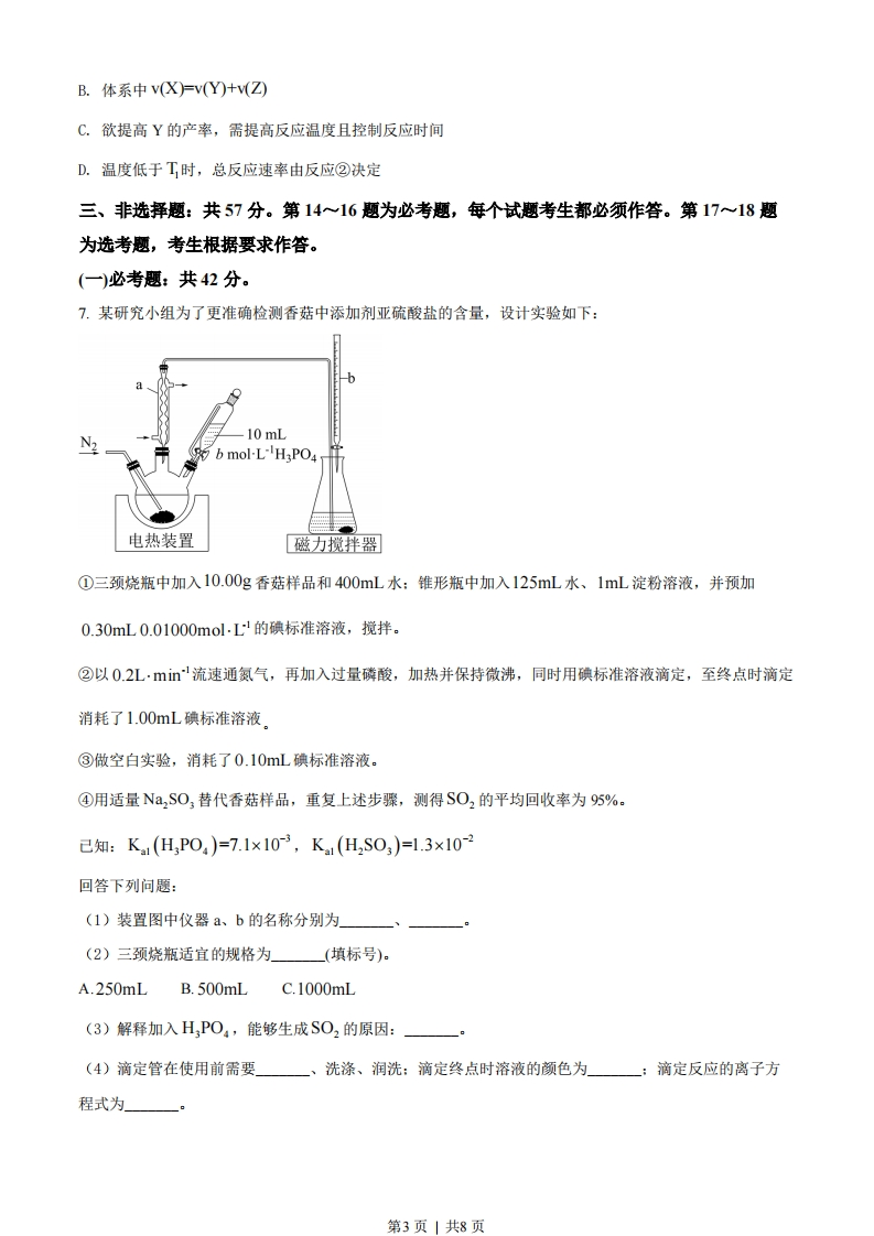河北省2022年普通高中学业水平选择性考试化学本试卷满分100分,考试时间75分钟。可能用到的相对原子质量:H-1N-140-16Na-23Mg-24A-27Si-28S-32一、单项选择题:本题共9小题,每小题3分,共27分。在每小题给出的四个选项中,只有一项是符合题目要求的。1.定窑是宋代五大名窑之一,其生产的白瓷闻名于世。下列说法正确的是A.传统陶瓷是典型的绝缘材料B.陶瓷主要成分为SiO,和MgOC.陶瓷烧制的过程为物理变化D.白瓷的白色是因铁含量较高2.茯苓新酸DM是从中药茯苓中提取的一种化学物质,具有一定生理活性,其结构简式如图。关于该化合物,下列说法不正确的是HOOCOHOHH.COOOA.可使酸性KMnO,溶液褪色B.可发生取代反应和加成反应C.可与金属钠反应放出H2D.分子中含有3种官能团3.化学是材料科学的基础。下列说法错误的是A.制造5G芯片的氮化铝晶圆属于无机非金属材料B.制造阻燃或防火线缆的橡胶不能由加聚反应合成C.制造特种防护服的芳纶纤维属于有机高分子材料D.可降解聚乳酸塑料的推广应用可减少“白色污染”暂无47题,后续如有题目会及时更新4.LBr溶液可作为替代氟利昂的绿色制冷剂。合成LBr工艺流程如下:BaSH2S04 Li2CO3HB(少量Br)→还原一除杂一中和一浓缩…→LBr滤渣气体下列说法错误的是第1页」共8页A.还原工序逸出的Br,用NaOH溶液吸收,吸收液直接返回还原工序B.除杂工序中产生的滤渣可用煤油进行组分分离C.中和工序中的化学反应为Li,CO,+2HB=CO,个+2LB+H,OD.参与反应的n(Br2)n(BaS):n(H2SO,)为1:1:1暂无9题,后续如有题目会及时更新二、不定项选释题:本题共4小题,每小题4分,共16分。在每小题给出的四个选项中,有一项或两项符合题目要求。若正确答案只包括一个选项,多选时,该小题得0分;若正确答案包括两个选项,只选一个且正确的得2分,选两个且都正确的得4分,但只要选错一个,该小题得0分。暂无10题,后续如有题目会及时更新5.在EY沸石催化下,萘与丙烯反应主要生成二异丙基萘M和N。CH3CH3CH3+CH3-CH=CH2EY沸石H,CCH85℃CH:下列说法正确的是A.M和N互为同系物B.M分子中最多有12个碳原子共平面C.N的一溴代物有5种D.萘的二溴代物有10种暂无12题,后续如有题目会及时更新~6.恒温恒容条件下,向密闭容器中加入一定量X,发生反应的方程式为①X三Y:②YZ。反应①的速率V,C(X),反应②的速率V2=k,C(Y),式中k1k2为速率常数。图甲为该体系中X、Y、Z浓度随时间变化的曲线,图乙为反应O和②的1k~二曲线。下列说法错误的是+c/(mol-L-1)In反应②反应①T甲乙A.随c(X)的减小,反应①、②的速率均降低第2页|共8页B.体系中vX)-v(Y)+v(ZC.欲提高Y的产率,需提高反应温度且控制反应时间D.温度低于T时,总反应速率由反应②决定三、非选择题:共57分。第14~16题为必考题,每个试题考生都必须作答。第17~18题为选考题,考生根据要求作答。(一)必考题:共42分。7.某研究小组为了更准确检测香菇中添加剂亚硫酸盐的含量,设计实验如下:b10 mLb mol-L-HPO电热装置磁力搅拌器①三颈烧瓶中加入10.00g香菇样品和400mL水:锥形瓶中加入125mL水、1mL淀粉溶液,并预加0.30mL0.01000mol.L的碘标准溶液,搅拌。②以0.2L·mi流速通氮气,再加入过量磷酸,加热并保持微沸,同时用碘标准溶液滴定,至终点时滴定消耗了1.00mL碘标准溶液」③做空白实验,消耗了0.10mL碘标准溶液。④用适量NaSO,替代香菇样品,重复上述步骤,测得SO2的平均回收率为95%。己知:K1(HP04)=7.1×103,K,(H2S03)=1.3×10-2回答下列问题:(1)装置图中仪器a、b的名称分别为(2)三颈烧瓶适宜的规格为(填标号)A.250mLB.500mLC.1000mL(3)解释加入HPO4,能够生成SO2的原因:(4)滴定管在使用前需要」、洗涤、润洗:滴定终点时溶液的颜色为滴定反应的离子方程式为第3页|共8页