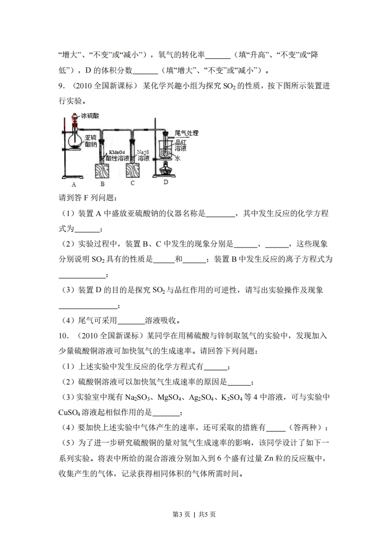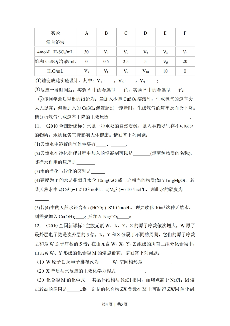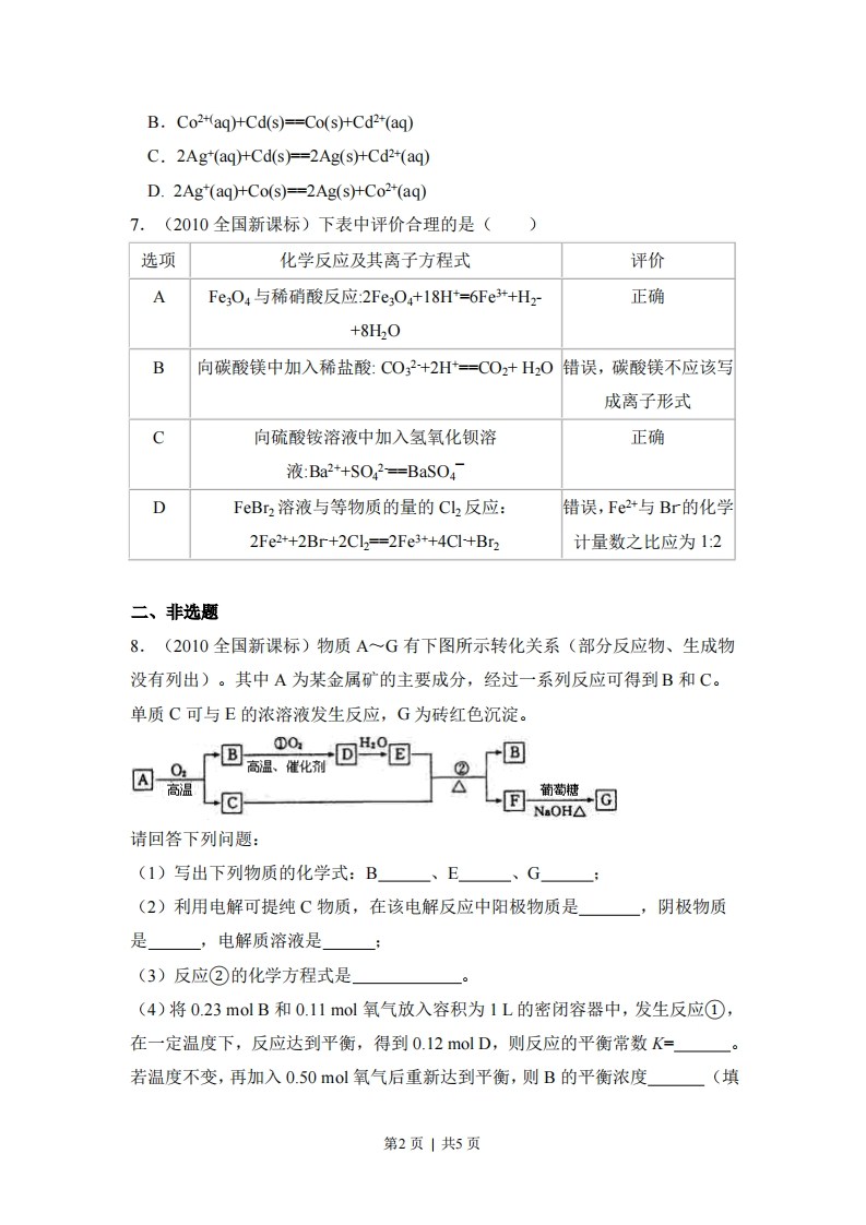 2010年高考全国新课标(宁夏、吉林、黑龙江理综化学试卷一、选择题1.(2010全国新课标)下列各项表达中正确的是()A.Na2O2的电子式为Na:δ:NaB.106g的乙醇和丙醇混合液完全燃烧生成的CO2为112L(标准状况)C.在氮原子中,质子数为7而中子数不一定为7D.Cr的结构示意图为⊙2.(2010新课标)分子式为CHC2的同分异构体共有(不考虑立体异构)()A.3种B.4种C.5种D.6种3.(2010全国新课标)下列各组中的反应,属于同一反应类型的是()A.由溴丙烷水解制丙醇:由丙烯与水反应制丙醇B.由甲苯硝化制对硝基甲苯:由甲苯氧化制苯甲酸C.由氯代环己烷消去制环己烯:由丙烯加溴制1,2-二溴丙烷D.由乙酸和乙醇制乙酸乙酯:由苯甲酸乙酯水解制苯甲酸和乙醇4.(2010全国新课标)把500mL有BaC2和KCl的混合溶液分成5等份,取一份加入含amol硫酸钠的溶液,恰好使钡离子完全沉淀:另取一份加入含bmol硝酸银的溶液,恰好使氯离子完全沉淀。则该混合溶液中钾离子浓度为()A.0.1(b-2a)mol/LB.10(2a-b)mol/LC.10(b-a)mol/LD.10(b-2a)mol/L5.010全国新课标)己知HCN(aq)与NaOH(aq)反应的△H=-l2.1kJ/mol:HCl(aq)与NaOH(aq)反应的△H=-55.6 kJ/mol。.则HCN在水溶液中电离的△H等于()A.-67.7 kJ/mol B.-43.5 kJ/molC.+43.5 kJ/molD.+67.7kJ/mol6.(2010全国新课标)根据下图,可判断出下列离子方程式中错误的是()CdCo-(aqCo(aq)Ag(aqA.2Ag(s)+Cd2+(aq)==2Ag(aq)+Cd(s)第1页|共5页B.Co2+(ag)+Cd(s)==Co(s)+Cd2*(aq)C.2Ag*(aq)+Cd(s)==2Ag(s)+Cd2+(aq)D.2Ag*(aq)+Co(s)==2Ag(s)+Co2+(aq)7.(2010全国新课标)下表中评价合理的是(选项化学反应及其离子方程式评价AFeO4与稀硝酸反应:2FeO4+18H+=6Fe3+H2正确+8H2OB向碳酸镁中加入稀盐酸:C032+2H=C02+H20错误,碳酸镁不应该写成离子形式C向硫酸铵溶液中加入氢氧化钡溶正确液:Ba2+SO42=BaS04DFeBr2溶液与等物质的量的Cl2反应:错误,Fe2+与Br的化学2Fe2++2Br+2Cl==2Fe3++4Cl+Br2计量数之比应为1:2二、非选题8.(2010全国新课标)物质A~G有下图所示转化关系(部分反应物、生成物没有列出)。其中A为某金属矿的主要成分,经过一系列反应可得到B和C。单质C可与E的浓溶液发生反应,G为砖红色沉淀。①0高温、催化剂回9B0高温@葡萄糖⊙NaOH△请回答下列问题:(1)写出下列物质的化学式:B、E、G(2)利用电解可提纯C物质,在该电解反应中阳极物质是阴极物质是,电解质溶液是(3)反应②的化学方程式是(4)将0.23molB和0.11mol氧气放入容积为1L的密闭容器中,发生反应①,在一定温度下,反应达到平衡,得到0.12molD,则反应的平衡常数K=一。若温度不变,再加入0.50mol氧气后重新达到平衡,则B的平衡浓度(填第2页|共5页“增大”、“不变”或“减小”),氧气的转化率(填“升高”、“不变”或“降低”),D的体积分数(填“增大”、“不变”或减小”)。9.(2010全国新课标)某化学兴趣小组为探究S02的性质,按下图所示装置进行实验。A浓硫酸尾气处理亚硫酸钠品红KMn04Na2S溶液酸性溶液溶液请到答F列问题:(1)装置A中盛放亚硫酸钠的仪器名称是其中发生反应的化学方程式为(2)实验过程中,装置B、C中发生的现象分别是,这些现象分别说明SO2具有的性质是和:装置B中发生反应的离子方程式为(3)装置D的目的是探究SO2与品红作用的可逆性,请写出实验操作及现象(4)尾气可采用溶液吸收。10.(2010全国新课标)某同学在用稀硫酸与锌制取氢气的实验中,发现加入少量硫酸铜溶液可加快氢气的生成速率。请回答下列问题:(1)上述实验中发生反应的化学方程式有;(2)硫酸铜溶液可以加快氢气生成速率的原因是(3)实验室中现有N2SO3、MgSO4、Ag2SO4、KSO4等4中溶液,可与实验中CuSO4溶液起相似作用的是(4)要加快上述实验中气体产生的速率,还可采取的措旌有(答两种):(5)为了进一步研究硫酸铜的量对氢气生成速率的影响,该同学设计了如下一系列实验。将表中所给的混合溶液分别加入到6个盛有过量Z粒的反应瓶中,收集产生的气体,记录获得相同体积的气体所需时间。第3页|共5页