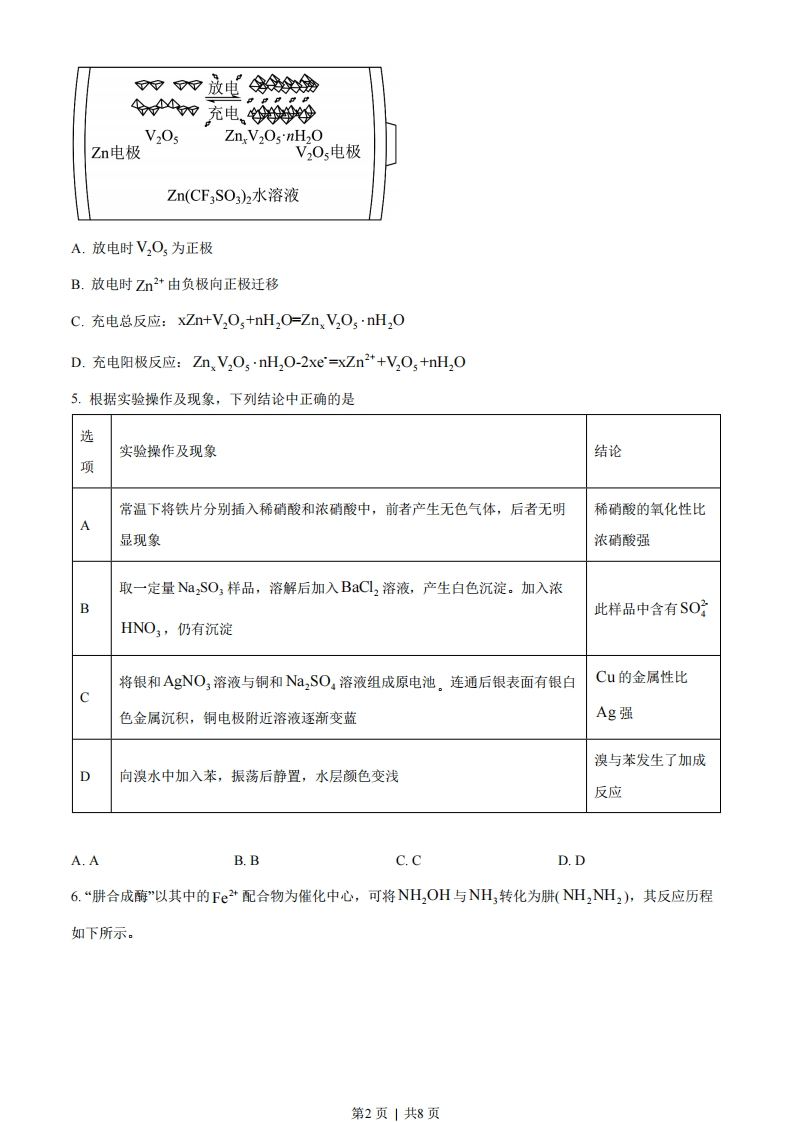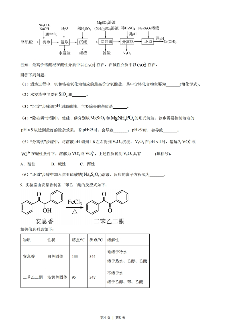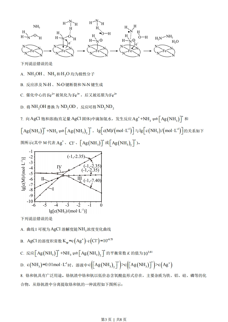 2023年普通高等学校招生全国统一考试(新课标卷)理科综合化学学科1.化学在文物的研究和修复中有重要作用。下列说法错误的是A.竹简的成分之一纤维素属于天然高分子B.龟甲的成分之一羟基磷灰石属于无机物C.古陶瓷修复所用的熟石膏,其成分为C(OH2D.古壁画颜料中所用的铁红,其成分为F©2O32.光学性能优良的高分子材料聚碳酸异山梨醇酯可由如下反应制备。n HO+(2n-I)X异山梨醇碳酸二甲酯聚碳酸异山梨醇酯下列说法错误的是A.该高分子材料可降解B.异山梨醇分子中有3个手性碳C.反应式中化合物X为甲醇D.该聚合反应为缩聚反应3.一种可吸附甲醇的材料,其化学式为C(NH,)3],B(OCH)4C,部分晶体结构如下图所示,其中[C(NH2)]为平面结构。下列说法正确的是A.该晶体中存在NH…O氢键B.基态原子的第一电离能:CNcAg(NH,)J)>c(Ag)8.铬和钒具有广泛用途。铬钒渣中铬和钒以低价态含氧酸盐形式存在,主要杂质为铁、铝、硅、磷等的化合物,从铬钒渣中分离提取铬和钒的一种流程如下图所示:第3页」共8页