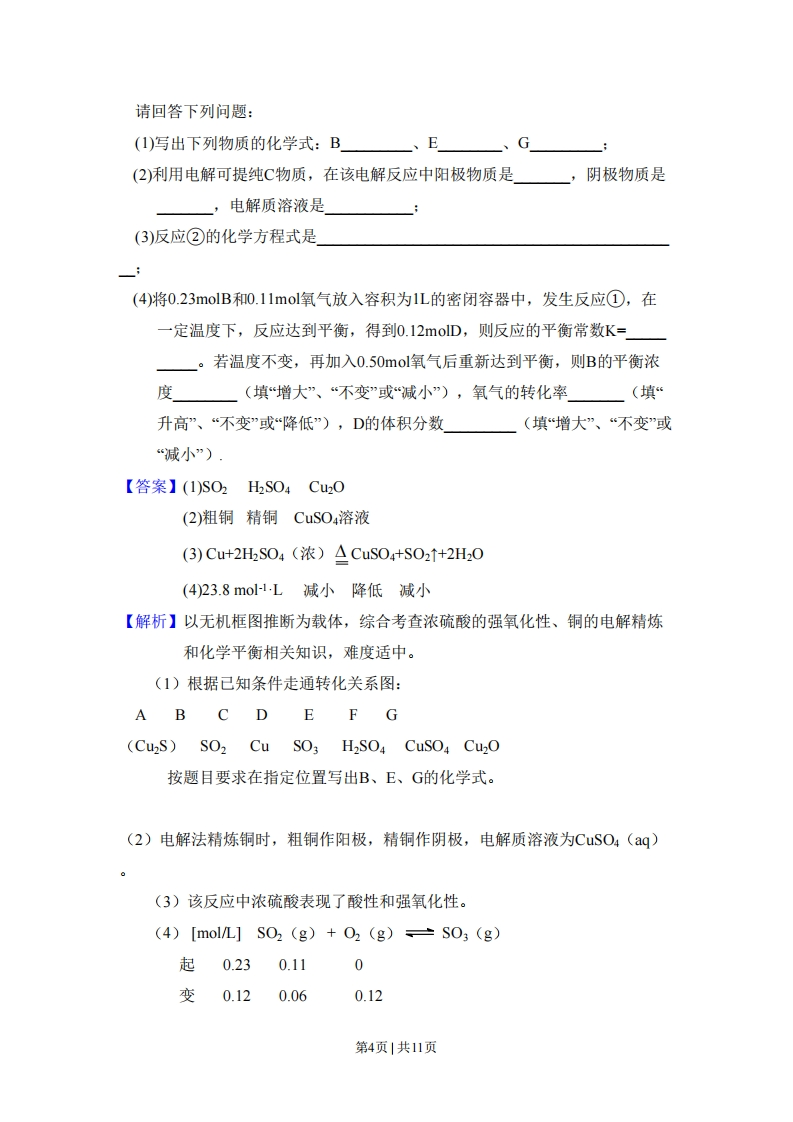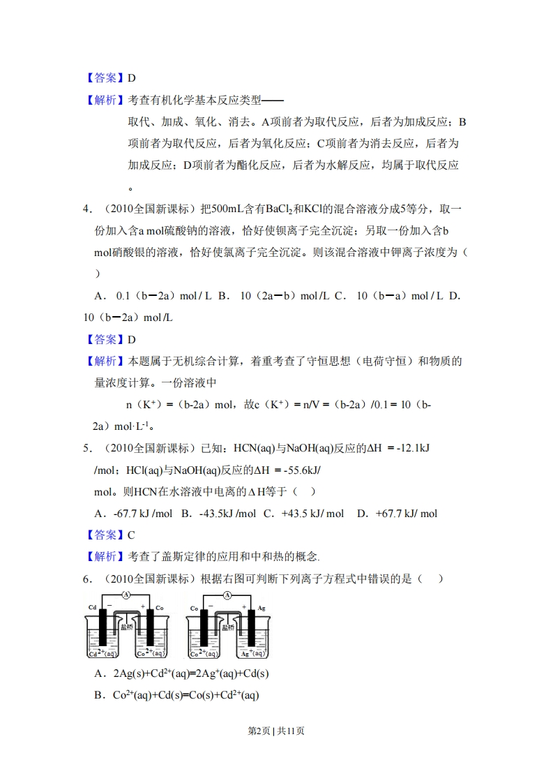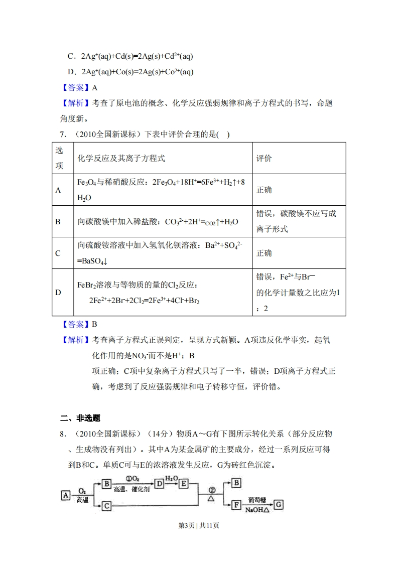 2010年全国统一高考化学试卷(新课标)◆者答案与试抛解折可能用到的相对原子质量:H一1B一11C一12N一14O一16Na一23S-32C1-35.5Ca-40Cu-64一、选择题1.(2010全国新课标)下列各项表达中正确的是()A.Na2O2的电子式为Na:ǒ:δNaB.106g的乙醇和丙醇混合液完全燃烧生成的CO2为112L(标准状况)C.在氮原子中,质子数为7而中子数不一定为7D.C叶的结构示意图为水@287【答案】C【解析】本题综合性强,考点属于化学基本概念既考查了重要化学用语电子式、微粒结构示意图、原子组成符号和同位素的概念,同时也考查了Vm的概念、混合的法则和守恒思想。B选项干扰性较强,它成立的前提是乙醇和丙醇按1:1的物质的量比混合。2.(2010全国新课标)分子式为CH。C2的同分异构体共有(不考虑立体异构)()A.3种B.4种C.5种D.6种【答案】B【解析】考查同分异构体的书写。CH:CH2CH的氢原子环境有两种,由此可知二氯取代发生在同一碳原子上和不同谈原子上的异构体各有2种,即2+2=43.(2010全国新课标)下列各组中的反应,属于同一反应类型的是()A.由溴丙烷水解制丙醇:由丙烯与水反应制丙醇B.由甲苯硝化制对硝基甲苯:由甲苯氧化制苯甲酸C.由氯代环己烷消去制环己烯:由丙烯加溴制1,2一二溴丙烷D.由乙酸和乙醇制乙酸乙酯:由苯甲酸乙酯水解制苯甲酸和乙醇第1页1共11页【答案】D【解析】考查有机化学基本反应类型取代、加成、氧化、消去。A项前者为取代反应,后者为加成反应:B项前者为取代反应,后者为氧化反应:C项前者为消去反应,后者为加成反应:D项前者为酯化反应,后者为水解反应,均属于取代反应4.(2010全国新课标)把500mL含有BaCl2和KCl的混合溶液分成5等分,取一份加入含amol硫酸钠的溶液,恰好使钡离子完全沉淀:另取一份加入含bmol硝酸银的溶液,恰好使氯离子完全沉淀。则该混合溶液中钾离子浓度为()A.0.1 (b-2a)mol/L B.10 (2a-b)mol/L C.10 (b-a)mol/L D.10 (b-2a)mol/L【答案】D【解析】本题属于无机综合计算,着重考查了守恒思想(电荷守恒)和物质的量浓度计算。一份溶液中n(K+)=(b-2a)mol,故c(K+)=n/W=(b-2a)/0.1=10(b-2a)molL-I。5.(2010全国新课标)已知:HCN(aq)与NaOH(aq)反应的△H=-12.1kJ/mol;HCl(aq)与NaOH(aq)反应的△H=-55.6kJ/mol。则HCN在水溶液中电离的△H等于()A.-67.7 kJ /mol B.-43.5kJ/mol C.+43.5 kJ/mol D.+67.7 kJ/mol【答案】C【解析】考查了盖斯定律的应用和中和热的概念6.(2010全国新课标)根据右图可判断下列离子方程式中错误的是()A.2Ag(s)+Cd2(aq)=2Ag"(aq)+Cd(s)B.Co2(ag)+Cd(s)=Co(s)+Cd2*(aq)第2页1共11页C.2Ag*(aq)+Cd(s)=2Ag(s)+Cd2*(aq)D.2Ag+(aq)+Co(s)=2Ag(s)+Co2+(aq)【答案】A【解析】考查了原电池的概念、化学反应强弱规律和离子方程式的书写,命题角度新。7.(2010全国新课标)下表中评价合理的是()选化学反应及其离子方程式评价项FeO4与稀硝酸反应:2Fe3O4+18H=6Fe3+H↑+8A正确H20错误,碳酸镁不应写成B向碳酸镁中加入稀盐酸:C032+2H=co2↑+H20离子形式向硫酸铵溶液中加入氢氧化钡溶液:Ba2+S042正确=BaSO4错误,Fe2+与BFeBr2溶液与等物质的量的Cl2反应:D的化学计量数之比应为12Fe2++2Br+2Cl2=2Fe*+4CI+Br2:2【答案】B【解析】考查离子方程式正误判定,呈现方式新颖。A项违反化学事实,起氧化作用的是NO而不是H;B项正确:C项中复杂离子方程式只写了一半,错误:D项离子方程式正确,考虑到了反应强弱规律和电子转移守恒,评价错。二、非选题8.(2010全国新课标)(14分)物质A~G有下图所示转化关系(部分反应物、生成物没有列出)。其中A为某金属矿的主要成分,经过一系列反应可得到B和C。单质C可与E的浓溶液发生反应,G为砖红色沉淀。①0回高温、催化甜B②高温菌萄糖一⊙NaOH△第3页1共11页