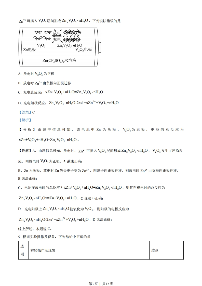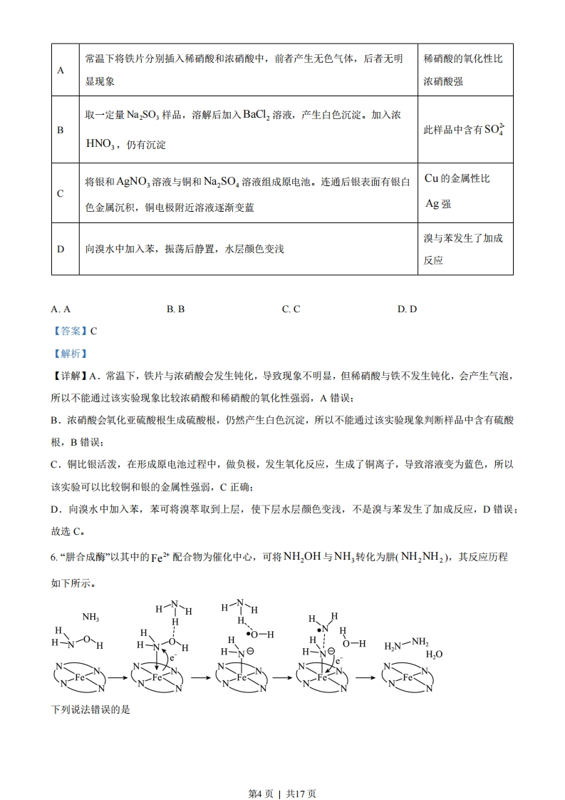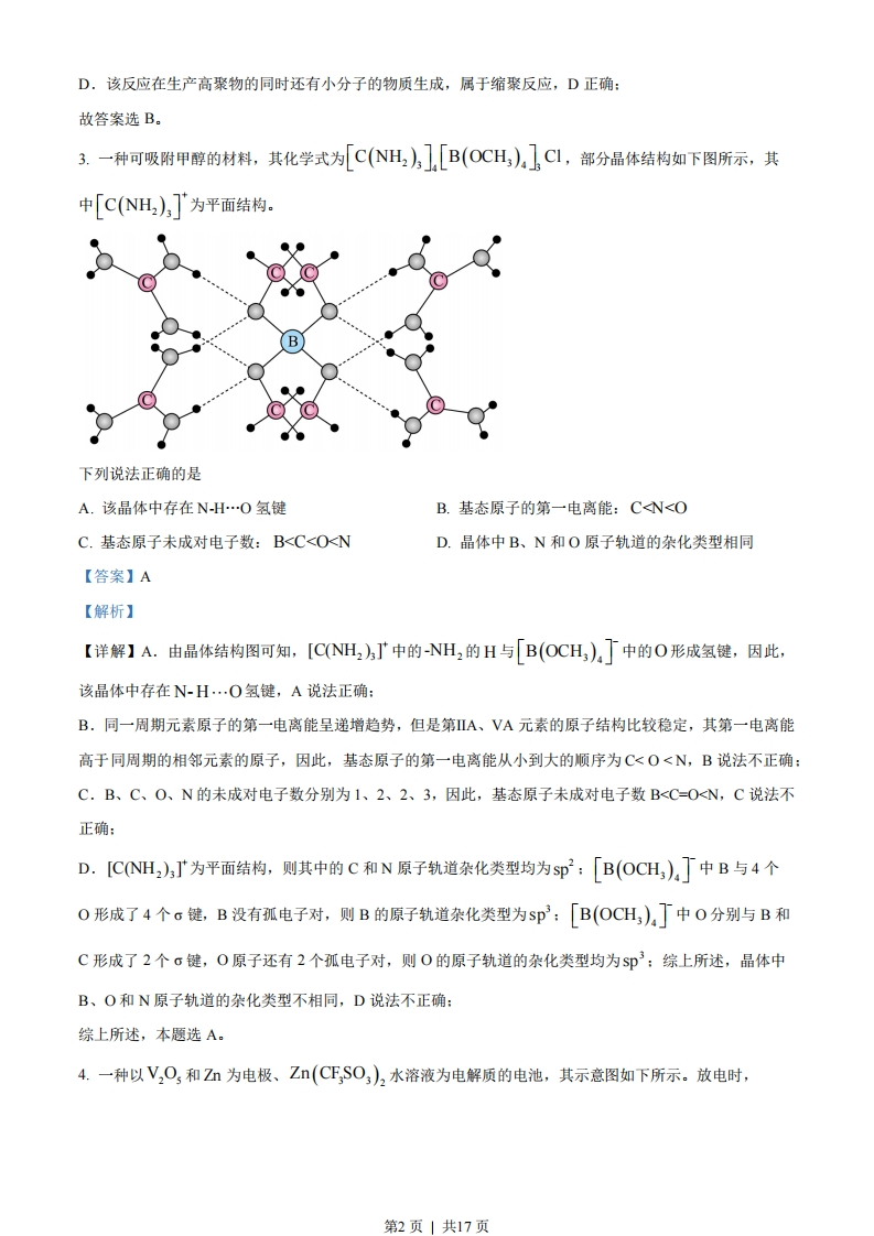 2023年普通高等学校招生全国统一考试(新课标卷)理科综合化学学科1.化学在文物的研究和修复中有重要作用。下列说法错误的是A.竹简的成分之一纤维素属于天然高分子B.龟甲的成分之一轻基磷灰石属于无机物C.古陶瓷修复所用的熟石膏,其成分为C(OH2D.古壁画颜料中所用的铁红,其成分为F©2O3【答案】C【解析】【详解】A.纤维素是一种天然化合物,其分子式为(CHoO5),其相对分子质量较高,是一种天然高分子,A正确:B.羟基磷灰石又称又称羟磷灰石、碱式磷酸钙,其化学式为C1o(PO4)(OH2],属于无机物,B正确:C.熟石膏是主要成分为2 CaSOH2O,Ca(OH2为熟石灰的主要成分,C错误:D.FeO3为红色,常被用于油漆、涂料、油墨和橡胶的红色颜料,俗称铁红,D正确:故答案选C。2.光学性能优良的高分子材料聚碳酸异山梨醇酯可由如下反应备。n HO+2n-1)X异山梨醇碳酸二甲酯聚碳酸异山梨醇酯下列说法错误的是A.该高分子材料可降解B.异山梨醇分子中有3个手性碳C.反应式中化合物X为甲醇D.该聚合反应为缩聚反应【答案】B【解析】【详解】A.该高分子材料中含有酯基,可以降解,A正确:OHB,异山梨醇中四处的碳原子为手性碳原子,故异山梨醇分子中有4个手性碳,B错误:C.反应式中异山梨醇释放出一个羟基与碳酸二甲酯释放出的甲基结合生成甲醇,故反应式中X为甲醇,C正确:第1页」共17页D.该反应在生产高聚物的同时还有小分子的物质生成,属于缩聚反应,D正确:故答案选B。3.一种可吸附甲醇的材料,其化学式为C(NH2),[B(OCH)4]C1,部分晶体结构如下图所示,其中[C(NH2),]为平面结构。下列说法正确的是A.该晶体中存在NH…O氢键B.基态原子的第一电离能:CN