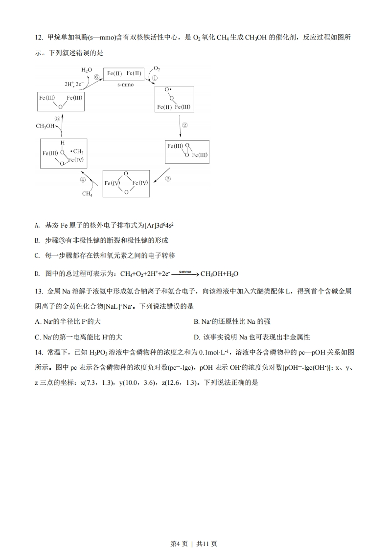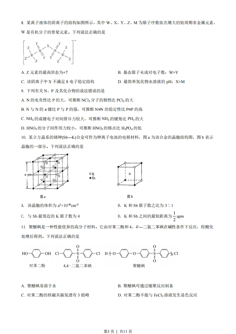 2021年湖北省普通高中学业水平选择性考试化学可能用到的相对原子质量:H-1C-12N-140-16F-19S-32C1-35.5K-39Ga-70In-115Sb-122一、选择题:本题共15小题,每小题3分,共45分。在每小题给出的四个选项中,只有一项是符合题目要求的。1.“碳中和”有利于全球气候改善。下列有关C02的说法错误的是A.CO2是V形的极性分子B.CO,可催化还原为甲酸C.CO2晶体可用于人工增雨D.CO2是侯氏制碱法的原料之一2.“乌铜走银”是我国非物质文化遗产之一。该工艺将部分氧化的银丝镶嵌于铜器表面,艺人用手边捂边揉搓铜器,铜表面逐渐变黑,银丝变得银光闪闪。下列叙述错误的是A.铜的金属活动性大于银B.通过揉搓可提供电解质溶液C.银丝可长时间保持光亮D.用铝丝代替银丝铜也会变黑3.氢化可的松乙酸酯是一种糖皮质激素,具有抗炎、抗病毒作用,其结构简式如图所示。有关该化合物叙述正确的是OHA.分子式为C23HO6B.能使溴水褪色C不能发生水解反应D.不能发生消去反应4.对于下列实验,不能正确描述其反应的离子方程式是A.向氢氧化钡溶液中加入盐酸:HtOH=HOB.向硝酸银溶液中滴加少量碘化钾溶液:Ag*+H=Agl↓C.向烧碱溶液中加入一小段铝片:2A1+2OH+6H2O=2[AI(OH)]+3H2↑第1页」共11页D.向次氯酸钙溶液中通入少量二氧化碳气体:CIO+CO2+H2O=HCIO+HC0;5.下列实验现象与实验操作不相匹配的是实验操作实验现象将盛有F©(OHD3胶体的烧杯置于暗处,用红色激光笔照射烧杯在与光束垂直的方向看到一条光A中的液体亮的“通路”向盛有少量Mg(O2沉淀的试管中加入适量饱和NH,CI溶液,B白色沉淀溶解振荡C向盛有3.0mL无水乙醇的试管中加人一小块金属钠有气泡产生向盛有2.0mL甲苯的试管中加人3滴酸性KMnO4,溶液,用紫色不变力振荡A.AB.BC.CD.D6.NA为阿伏加德罗常数的值。下列说法错误的是A.23 gCH;CH2OH中sp3杂化的原子数为NAB.0.5 molXeF.4中氙的价层电子对数为3NaC.1mol[Cu(H2O)]2+中配位键的个数为4NAD.标准状况下,112LC0和H2的混合气体中分子数为0.5NA7.某兴趣小组为制备1一氯一2一甲基丙烷(沸点69℃),将2一甲基一1一丙醇和P0Cl3溶于CH2C2中,加热回流(伴有HCI气体产生)。反应完全后倒入冰水中分解残余的POCl3,分液收集CH2C2层,无水MgSO4干燥,过滤、蒸馏后得到目标产物。上述过程中涉及的装置或操作错误的是(夹持及加热装置略)NaOH溶液BD.A.AB.BC.CD.D第2页1共11页8.某离子液体的阴离子的结构如图所示,其中W、X、Y、Z、M为原子序数依次增大的短周期非金属元素,W是有机分子的骨架元素。下列说法正确的是A.Z元素的最高价态为+7B.基态原子未成对电子数:W>YC.该阴离子中X不满足8电子稳定结构D.最简单氢化物水溶液的pH:X>M9.下列有关N、P及其化合物的说法错误的是A.N的电负性比P的大,可推断NC3分子的极性比PC3的大B.N与N的π键比P与P的强,可推断NN的稳定性比P=P的高C.NH3的成键电子对间排斥力较大,可推断NH的键角比PH3的大D.HNO3的分子间作用力较小,可推断HNO3的熔点比HPO4的低10.某立方晶系的锑钾(Sb一K)合金可作为钾离子电池的电极材料,图a为该合金的晶胞结构图,图b表示晶胞的一部分。下列说法正确的是OK●Sb图a图bA.该晶胞的体积为a3×10cm3B.K和Sb原子数之比为3:1C.与Sb最邻近的K原子数为4D.K和Sb之间的最短距离为2pm11.聚醚砜是一种性能优异的高分子材料。它由对苯二酚和4,4一二氯二苯砜在碱性条件下反应,经酸化处理后得到。下列说法正确的是对苯二酚4.4-二氯二苯砜聚醚砜A.聚醚讽易溶于水B.聚醚讽可通过缩聚反应制备C.对苯二酚的核磁共振氢谱有3组峰D.对苯二酚不能与FeCl3溶液发生显色反应第3页」共11页