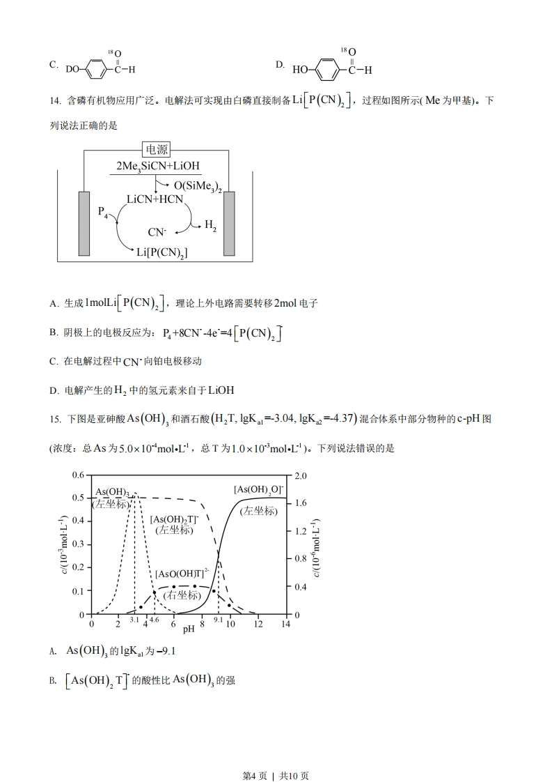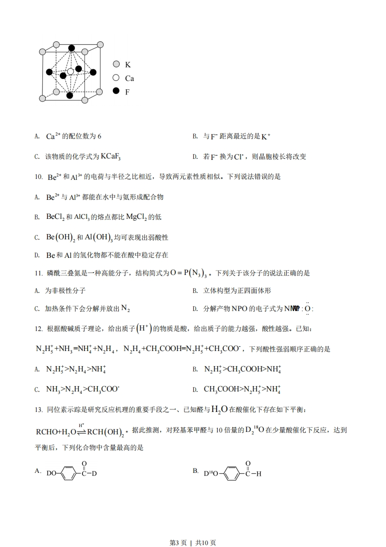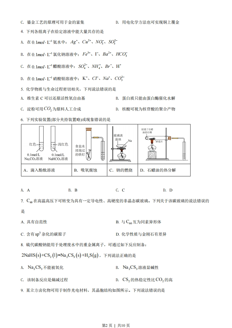 湖北省2022年普通高中学业水平选择性考试化学本试卷共8页,19题。全卷满分100分。考试用时75分钟。★祝考试顺利女注意事项:1答题前,先将自已的姓名、准考证号、考场号、座位号填写在试卷和答题卡上,并认真核准准考证号条形码上的以上信息,将条形码粘贴在答题卡上的指定位置。2.请按题号顺序在答题卡上各题目的答题区域内作答,写在试卷、草稿纸和答题卡上的非答题区域均无效。3.选择题用2B铅笔在答题卡上把所选答秦的标号涂黑;非选择题用黑色签宇笔在答题卡上作答;字体工整,笔迹清楚。4考试结束后,请将试卷和答题卡一并上交。可能用到的相对原子质量:H1Li7C12016Mg24A27Ca40本卷涉及的实验均须在专业人士指导和李余得到充分保障的条件下完成。一、选择题:本题共15小题,每小题3分,共45分。在每小题给出的四个选项中,只有一项是符合题目要求的。1.化学与生活密切相关,下列不涉及化学变化的是A.加入明矾后泥水变澄清B.北京冬奥会用水快速制冰C.炖排骨汤时加点醋味道更鲜D.切开的茄子放置后切面变色2.莲藕含多酚类物质,其典型结构简式如图所示。下列有关该类物质的说法错误的是OHHOOHCOORA.不能与溴水反应B.可用作抗氧化剂C.有特征红外吸收峰D.能与Fe+发生显色反应3.武当山金殿是铜铸婆金大殿。传统婆金工艺是将金溶于汞中制成“金汞漆”,涂在器物表面,然后加火除汞,使金附着在器物表面。下列说法错误的是A.婆金工艺利用了汞的挥发性B.婆金工艺中金发生了化学反应第1页」共10页C.婆金工艺的原理可用于金的富集D.用电化学方法也可实现铜上覆金4.下列各组离子在给定溶液中能大量共存的是A.在0.1mol.L1氨水中:Ag、C2+、NO、SOB.在0.1mol.Ll氯化钠溶液中:Fe+、I、Ba2+、HCOC.在0.1mol.L醋酸溶液中:SO、NH、Br、HD.在0.1mol.Ll硝酸银溶液中:K+、CT、Na、CO5.化学物质与生命过程密切相关,下列说法错误的是A.维生素C可以还原活性氧自由基B.蛋白质只能由蛋白酶催化水解C.淀粉可用CO2为原料人工合成D.核酸可视为核苷酸的聚合产物6.下列实验装置(部分夹持装置略)或现象错误的是浸透了石蜡油的石棉玻璃表红色卡浅红色食盐水浸泡过0.1mol/L0.1mol/L的铁钉NazCO,溶液NaHCO,溶液A.滴入酚酞溶液B.吸氧腐蚀C.钠的燃烧D.石蜡油的热分解A.AB.BC.CD.D7.C在高温高压下可转变为具有一定导电性、高硬度的非晶态碳玻璃。下列关于该碳玻璃的说法错误的是A.具有自范性B.与C60互为同素异形体C.含有Sp杂化的碳原子D.化学性质与金刚石有差异8.硫代碳酸钠能用于处理废水中的重金属离子,可通过如下反应制备:2NaHS(s)+CS2(I)=Na,CS,(s)+H,S(g),下列说法正确的是A.Na,CS3不能被氧化B.Na,CS3溶液显碱性C.该制备反应是熵减过程D.CS2的热稳定性比CO2的高9.某立方卤化物可用于制作光电材料,其晶胞结构如图所示。下列说法错误的是第2页|共10页●FA.Ca2+的配位数为6B.与F距离最近的是K+C.该物质的化学式为KCaFD.若F换为C',则晶胞棱长将改变10.B2+和A1+的电荷与半径之比相近,导致两元素性质相似。下列说法错误的是A.Be2+与A1+都能在水中与氨形成配合物B.BeCl,和AICL的熔点都比MgCl2的低C.Be(OH,和Al(OH),均可表现出弱酸性D.Be和AI的氢化物都不能在酸中稳定存在11.磷酰三叠氮是一种高能分子,结构简式为O=P(N)3。下列关于该分子的说法正确的是A.为非极性分子B.立体构型为正四面体形C.加热条件下会分解并放出N2D.分解产物NPO的电子式为NN癯:O:12.根据酸碱质子理论,给出质子(H)的物质是酸,给出质子的能力越强,酸性越强。己知:N,H+NH=NH+N,H,N,H,+CH,COOH=N,H+CH,COO°,下列酸性强弱顺序正确的是A.N,H>N,H>NHB.N,H>CH,COOH>NHC.NH>N,H,>CH.COOD.CH,COOH>N,H:>NH13.同位素示踪是研究反应机理的重要手段之一、己知醛与H,○在酸催化下存在如下平衡:RCHO+H,O三RCH(OH),·据此推测,对羟基苯甲醛与10倍量的D,O在少量酸催化下反应,达到平衡后,下列化合物中含量最高的是A.D0--DB.DO〈C-H第3页」共10页