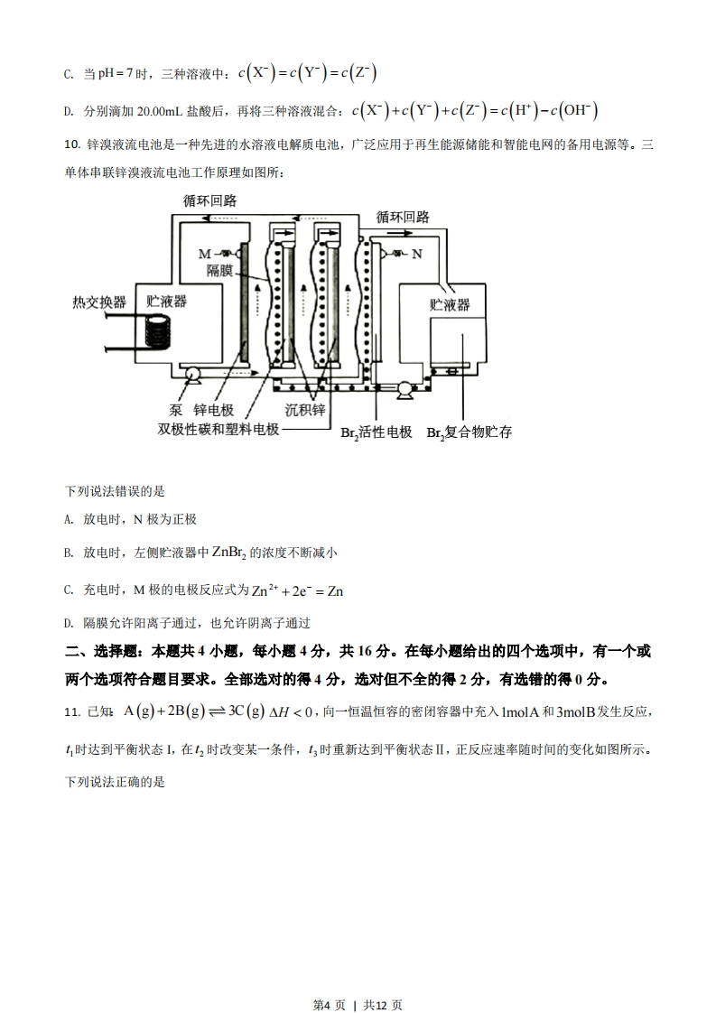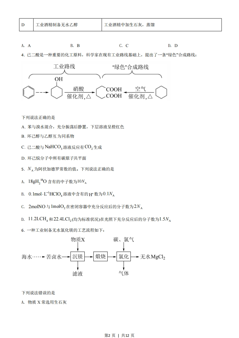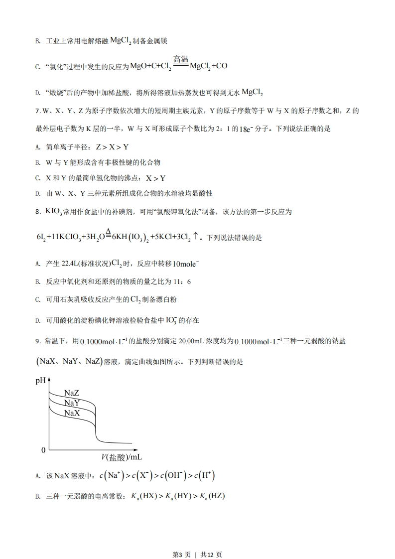 湖南省2021年普通高中学业水平选择性考试化学注意事项:1.答卷前,考生务必将自已的姓名、准考证号填写在本试卷和答题卡上。2.回答选择题时,选出每小题答案后,用铅笔把答题卡上对应题目的答案标号涂黑。如需改动,用橡皮擦干净后,再选涂其他答案标号。回答非选择题时,将答案写在答题卡上。写在本试卷上无效。3.考试结束后,将本试卷和答题卡一并交回。可能用到的相对原子质量:H:1C:12N:140:16F:19Na:23Mg:24Si:28Cl:35.5Ge:73Br:80I:127一、选择题:本题共10小题,每小题3分,共30分。在每小题给出的四个选项中,只有一项是符合题目要求的。1.下列有关湘江流域的治理和生态修复的措施中,没有涉及到化学变化的是A.定期清淤,疏通河道B.化工企业“三废”处理后,达标排放C.利用微生物降解水域中的有毒有害物质D.河道中的垃圾回收分类后,进行无害化处理2.下列说法正确的是A.糖类、蛋白质均属于天然有机高分子化合物B.FeO粉末在空气中受热,迅速被氧化成Fe,O,C.$O2可漂白纸浆,不可用于杀菌、消毒D.镀锌铁皮的镀层破损后,铁皮会加速腐蚀3.下列实验设计不能达到实验目的的是实验目的实验设计检验溶液中FeSO,是否被氧化取少量待测液,滴加KSCN溶液,观察溶液颜色变化B净化实验室制备的Cl?气体依次通过盛有饱和NaCI溶液、浓HSO,的洗气瓶测定NaOH溶液的pH将待测液滴在湿润的pH试纸上,与标准比色卡对照第1页1共12页D工业酒精制备无水乙醇工业酒精中加生石灰,蒸馏A.AB.BC.CD.D4.己二酸是一种重要的化工原料,科学家在现有工业路线基础上,提出了一条“绿色”合成路线:工业路线“绿色"合成路线OH硝酸COOH空气催化剂,△COOH催化剂,△下列说法正确的是A.苯与溴水混合,充分振荡后静置,下层溶液呈橙红色B.环己醇与乙醇互为同系物C.已二酸与NaHCO3溶液反应有CO,生成D.环己烷分子中所有碳原子共平面5.N。为阿伏加德罗常数的值。下列说法正确的是A.18gH,18O含有的中子数为10NAB.0.1mol·LHCIO,溶液中含有的H数为0.1NAC.2molN0与1molO2在密闭容器中充分反应后的分子数为2NAD.11.2LCH,和22.4LC12(均为标准状况)在光照下充分反应后的分子数为1.5VAa6.一种工业制备无水氯化镁的工艺流程如下:物质X碳、氯气海水…一苦卤水→沉镁煅烧氯化→无水MgC2滤液气体下列说法错误的是A.物质X常选用生石灰第2页1共12页B.工业上常用电解熔融MgCl2制备金属镁高温C.“氯化”过程中发生的反应为MgO+C+CL,MgCL+COD.“煅烧”后的产物中加稀盐酸,将所得溶液加热蒸发也可得到无水MgCl27.W、X、Y、Z为原子序数依次增大的短周期主族元素,Y的原子序数等于W与X的原子序数之和,Z的最外层电子数为K层的一半,W与X可形成原子个数比为2:1的18分子。下列说法正确的是A.简单离子半径:Z>X>YB.W与Y能形成含有非极性键的化合物C.X和Y的最简单氢化物的沸点:X>YD.由W、X、Y三种元素所组成化合物的水溶液均显酸性8.KIO,常用作食盐中的补碘剂,可用“氯酸钾氧化法”制备,该方法的第一步反应为6L+11KCI0,+3H,0兰6KH(IO3)2+5KC1+3C2个。下列说法错误的是A.产生22.4L(标准状况)Cl2时,反应中转移10moleB.反应中氧化剂和还原剂的物质的量之比为11:6C.可用石灰乳吸收反应产生的Cl2制备漂白粉D.可用酸化的淀粉碘化钾溶液检验食盐中IO的存在9.常温下,用0.1000mol.L1的盐酸分别滴定20.00mL浓度均为0.1000molL-1三种一元弱酸的钠盐(NaX、NaY、NaZ)溶液,滴定曲线如图所示。下列判断错误的是pHNaZNaYNaX0(盐酸)/mLA.该NaX溶液中:c(Na)>c(X)>c(OHr)>c(H)B.三种一元弱酸的电离常数:K,(HX)>K(HY)>K,(HZ)第3页|共12页