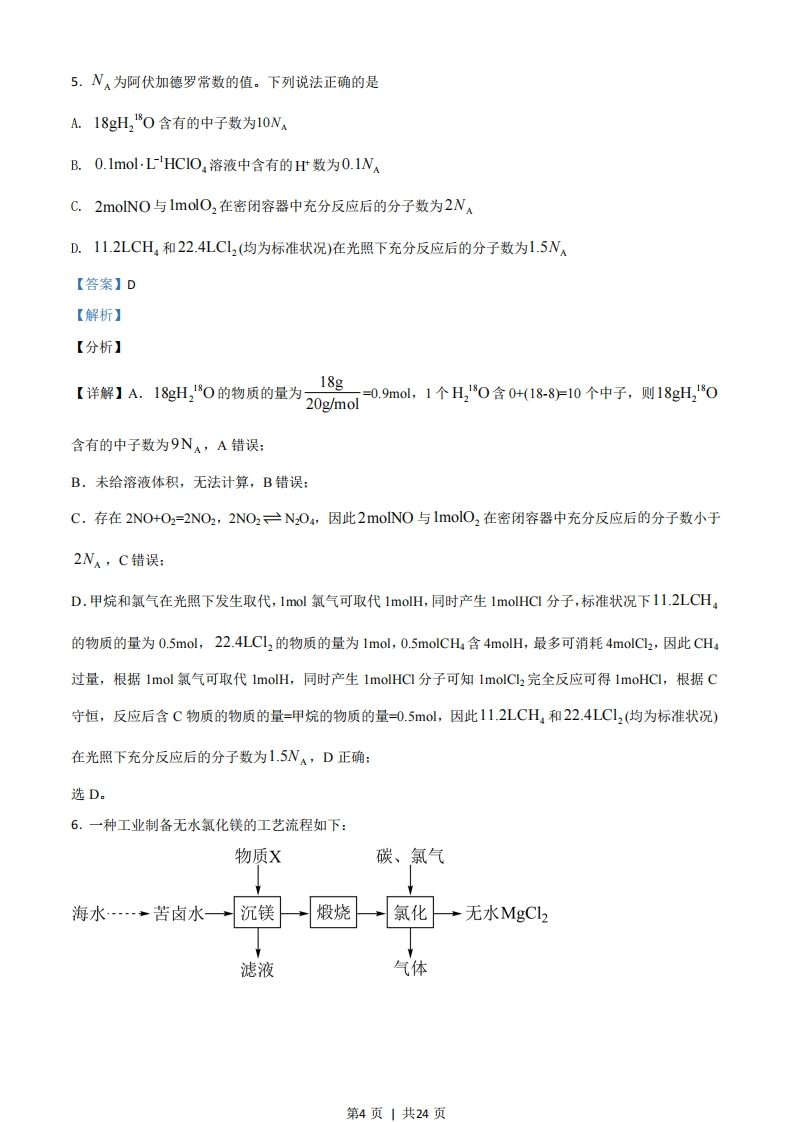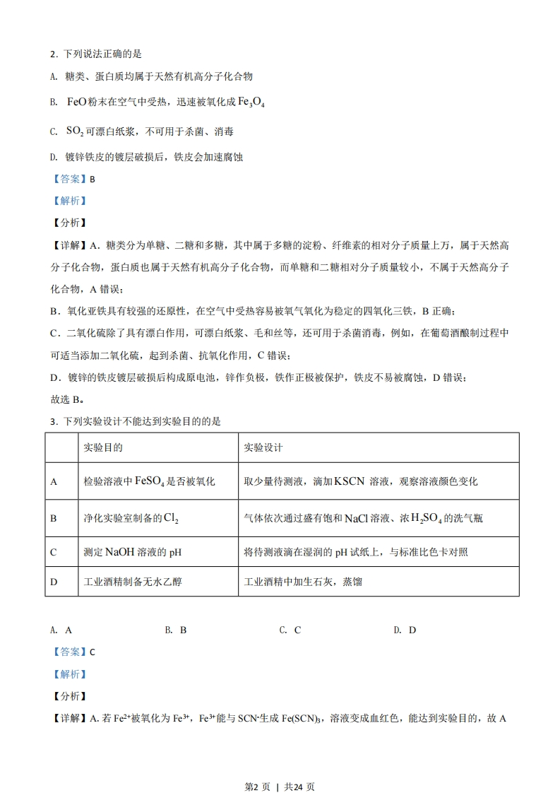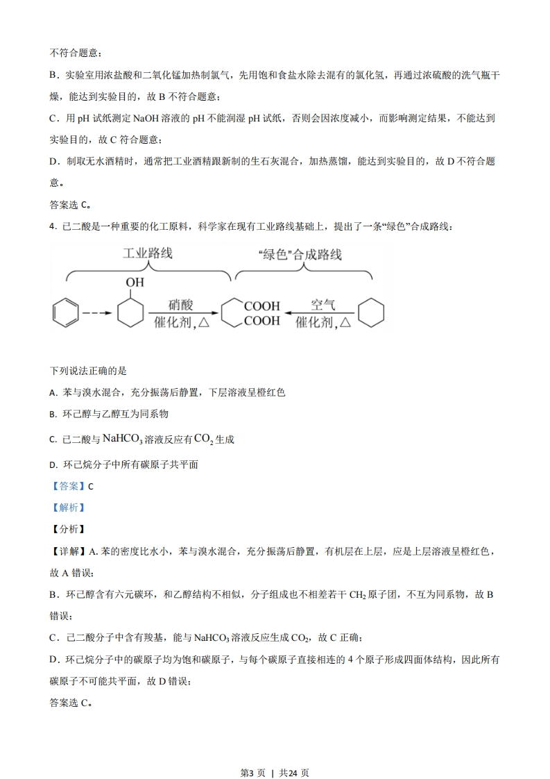湖南省2021年普通高中学业水平选择性考试化学注意事项:1答卷前,考生务必将自已的姓名、准考证号填写在本试卷和答题卡上。2.回答选择题时,选出每小题答案后,用铅笔把答题卡上对应题目的答案标号涂黑。如需改动,用橡皮擦干净后,再选涂其他答案标号。回答非选择题时,将答案写在答题卡上。写在本试卷上无效。3.考试结束后,将本试卷和答题卡一并交回。可能用到的相对原子质量:H:1C:12N:140:16F:19Na:23Mg:24Si:28C:35.5Ge:73Br:80I:127一、选择题:本题共10小题,每小题3分,共30分。在每小题给出的四个选项中,只有一项是符合题目要求的。1.下列有关湘江流域的治理和生态修复的措施中,没有涉及到化学变化的是A.定期清淤,疏通河道B.化工企业“三废”处理后,达标排放C.利用微生物降解水域中的有毒有害物质D.河道中的垃圾回收分类后,进行无害化处理【答案】A【解析】【分析】【详解】A.定期清淤,疏通河道,保证河流畅通,没有涉及化学变化,A符合题意:B.工业生产中得到产品的同时常产生废气、废水和废渣(简称“三废”),常涉及化学方法进行处理,如石膏法脱硫、氧化还原法和沉淀法等处理废水,废渣资源回收利用等过程均有新物质生成,涉及化学变化,B不符合题意:C.可通过微生物的代谢作用,将废水中有毒有害物质尤其复杂的有机污染物降解为简单的、无害物质,所以微生物法处理废水有新物质的生成,涉及的是化学变化,C不符合题意:D.河道中的垃圾回收分类,适合焚化处理的垃圾,利用现代焚化炉进行燃烧,消灭各种病原体,把一些有毒、有害物质转化为无害物质,同时可回收热能,用于供热和发电等,此过程涉及化学变化,D不符合题意:故选A。第1页1共24页2.下列说法正确的是A.糖类、蛋白质均属于天然有机高分子化合物B.FeO粉末在空气中受热,迅速被氧化成Fe,O,C.SO2可漂白纸浆,不可用于杀菌、消毒D.镀锌铁皮的镀层破损后,铁皮会加速腐蚀【答案】B【解析】【分析】【详解】A.糖类分为单糖、二糖和多糖,其中属于多糖的淀粉、纤维素的相对分子质量上万,属于天然高分子化合物,蛋白质也属于天然有机高分子化合物,而单糖和二糖相对分子质量较小,不属于天然高分子化合物,A错误:B.氧化亚铁具有较强的还原性,在空气中受热容易被氧气氧化为稳定的四氧化三铁,B正确:C.二氧化硫除了具有漂白作用,可漂白纸浆、毛和丝等,还可用于杀菌消毒,例如,在葡萄酒酿制过程中可适当添加二氧化硫,起到杀菌、抗氧化作用,C错误:D.镀锌的铁皮镀层破损后构成原电池,锌作负极,铁作正极被保护,铁皮不易被腐蚀,D错误:故选B。3.下列实验设计不能达到实验目的的是实验目的实验设计检验溶液中FeSO,是否被氧化取少量待测液,滴加KSCN溶液,观察溶液颜色变化B净化实验室制备的Cl,气体依次通过盛有饱和NaCI溶液、浓HSO,的洗气瓶测定NaOH溶液的pH将待测液滴在湿润的pH试纸上,与标准比色卡对照工业酒精制备无水乙醇工业酒精中加生石灰,蒸馏A.AB.BC.CD.D【答案】C【解析】【分析】【详解】A.若Fe2+被氧化为Fe,Fe升能与SCN生成Fe(SCN),溶液变成血红色,能达到实验目的,故A第2页|共24页不符合题意:B.实验室用浓盐酸和二氧化锰加热制氯气,先用饱和食盐水除去混有的氯化氢,再通过浓硫酸的洗气瓶干燥,能达到实验目的,故B不符合题意:C.用pH试纸测定NOH溶液的pH不能润湿pH试纸,否则会因浓度减小,而影响测定结果,不能达到实验目的,故C符合题意:D.制取无水酒精时,通常把工业酒精跟新制的生石灰混合,加热蒸馏,能达到实验目的,故D不符合题意。答案选C。4.己二酸是一种重要的化工原料,科学家在现有工业路线基础上,提出了一条“绿色”合成路线:工业路线“绿色"合成路线OH硝酸COOH空气催化剂,△COOH催化剂,△下列说法正确的是A.苯与溴水混合,充分振荡后静置,下层溶液呈橙红色B.环己醇与乙醇互为同系物c.已二酸与NaHCO3溶液反应有CO,生成D.环己烷分子中所有碳原子共平面【答案】C【解析】【分析】【详解】A.苯的密度比水小,苯与溴水混合,充分振荡后静置,有机层在上层,应是上层溶液呈橙红色,故A错误:B.环己醇含有六元碳环,和乙醇结构不相似,分子组成也不相差若干CH2原子团,不互为同系物,故B错误:C.己二酸分子中含有羧基,能与NaHCO3溶液反应生成CO2,故C正确:D.环己烷分子中的碳原子均为饱和碳原子,与每个碳原子直接相连的4个原子形成四面体结构,因此所有碳原子不可能共平面,故D错误:答案选C。第3页1共24页