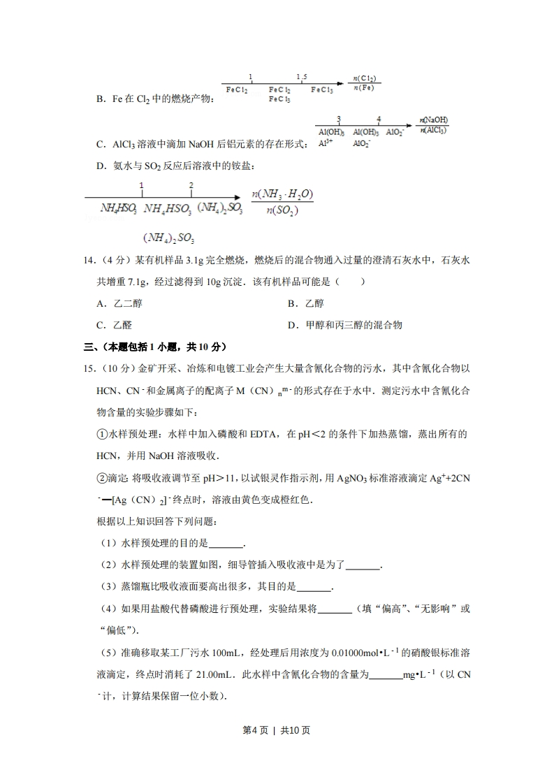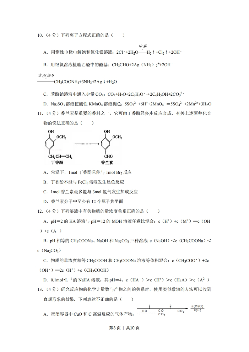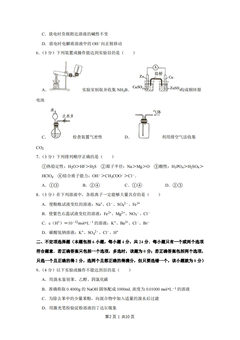 2008年江苏省高考化学试卷一、单项选释题:本题包括8小题,每题3分,共24分,每小题只有一个选项符合题意.1.(3分)化学与生活、社会密切相关.下列说法错误的是()A.利用太阳能等清洁能源代替化石燃料,有利于节约资源、保护环境B.凡含有食品添加剂的食物对人体健康均有害,不可食用C.为防止电池中的重金属等污染土壤和水体,应积极开发废电池的综合利用技术D.提倡人们购物时不用塑料袋,是为了防止白色污染2.(3分)下列文字表述与反应方程式对应且正确的是()A.溴乙烷中滴入AgNO3溶液检验其中的溴元素:Br+Ag一AgBr↓B.用醋酸除去水垢:CaC03+2H一Ca2+H20+C02↑C.利用腐蚀法制作印刷线路板:Fe3+Cu一Fe2+Cu2++Br-eB3¥+HBrD.实验室用液溴和苯在催化剂作用下制溴苯:3.(3分)用NA表示阿伏加德罗常数的值.下列叙述正确的是()A.常温常压下的33.6L氯气与27g铝充分反应,转移电子数为3NAB.标准状况下,22.4L己烷中共价键数目为19NAC.由CO2和O2组成的混合物中共有NA个分子,其中氧原子数为2NAD.1L浓度为1molL1的Na2CO3溶液中含有NA个CO4.(3分)下列现象或事实可用同一原理解释的是()A.浓硫酸和浓盐酸长期暴露在空气中浓度降低B.氯水和活性炭使红墨水褪色C.漂白粉和水玻璃长期暴露在空气中变质D.乙炔和乙烯使溴的四氯化炭溶液褪色5.(3分)镍镉(Ni-Cd)可充电电池在现代生活中有广泛应用.己知某镍镉电池的电解质放电溶液为KOH溶液,其充、放电按下式进行:Cd+2 NiOOH+2H2O≠Cd(OH)2+2Ni光电(OH)2.有关该电池的说法正确的是()A.充电时阳极反应:Ni(OH)2-e+OH一NiOOH+H2OB.充电过程是化学能转化为电能的过程第1页|共10页C.放电时负极附近溶液的碱性不变D.放电时电解质溶液中的OH~向正极移动6.(3分)下列装置或操作能达到实验目的是()盐桥Zn、CuCusOA实验室制取并收集NHB.ZnS0构成铜锌原电池气体止水头检查装置气密性利用排空气法收集C027.(3分)下列排列顺序正确的是()①热稳定性:HO>HF>H2S②原子半径:Na>Mg>0③酸性:HPO4>H2SO4>HCIO4④结合质子能力:OH>CH;COO>C.A.①③B.②④C.①④D.②③8.(3分)在下列溶液中,各组离子一定能够大量共存的是()A.使酚酞试液变红的溶液:Na、C、SO42~、Fe计B.使紫色石蕊试液变红的溶液:Fe2+、Mg+、NO3ˉ、CIC.c(H)=10-12molL1的溶液:K+、Ba2+、C、BrD.碳酸氢钠溶液:K+、SO42、C、H二、不定项选择题(本题包括6小题,年小题4分,共24分。每小题只有一个或两个选项符合题意.若正确答案只包括一个选项,多选时,该题为0分;若正确答案包括两个选项,只选一个且正确的得2分,选两个且都正确的得满分,但只要选错一个,该小题就为0分)9.(4分)以下实验或操作不能达到目的是()A.用溴水鉴别苯、乙醇、四氯化碳B.准确称取0.4000g的NaOH固体配成1000mL浓度为0.01000molL-1的溶液C.为除去苯中的少量苯酚,向混合物中加入适量的溴水后过滤D.用激光笔检验淀粉溶液的丁达尔现象第2页1共10页10.(4分)下列离子方程式正确的是()电解A.用惰性电极电解饱和氯化镁溶液:2C~+2H20H2↑+C2↑+2OHB.用银氨溶液检验乙醛中的醛基:CH3CHO+2Ag(NH)2+2OH水浴加声CH3COONH4+3NH3+2Ag +H20C.苯酚钠溶液中通入少量CO2:C02+H20+2C6H50~→2C6H5OH+2C032D.Na2SO3溶液使酸性KMnO4溶液褪色:5SO32-+6H+2MnO4=5S042-+2Mn2+3H2011.(4分)香兰素是重要的香料之一,它可由丁香酚经多步反应合成.有关上述两种化合物的说法正确的是()OHOHOCH,OCH,卡。卡卡象卡。CH,CH-CH2CHO丁香酚香兰素A.常温下,lmol丁香酚只能与1mol Br2反应B.丁香酚不能与FeCl3溶液发生显色反应C.lmol香兰素最多能与3mol氢气发生加成反应D.香兰素分子中至少有12个原子共平面12.(4分)下列溶液中有关物质的量浓度关系正确的是()A.pH=2的HA溶液与pH=12的MOH溶液任意比混合:c(H)+c(M)一℃(OH)+c(A)B.pH相等的CH3COONa、NaOH和NaCO3三种溶液c (NaOH)c(H)>c(H2A)>c(A2-)13.(4分)研究反应物的化学计量数与产物之间的关系时,使用类似数轴的方法可以收到直观形象的效果.下列表达不正确的是()1”(Cu0)cococ03(C)A.密闭容器中CuO和C高温反应的气体产物:C0:第3页|共10页