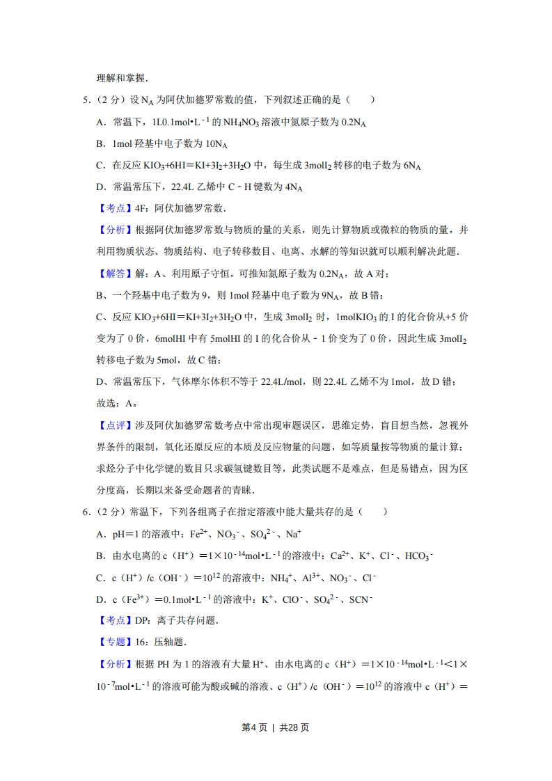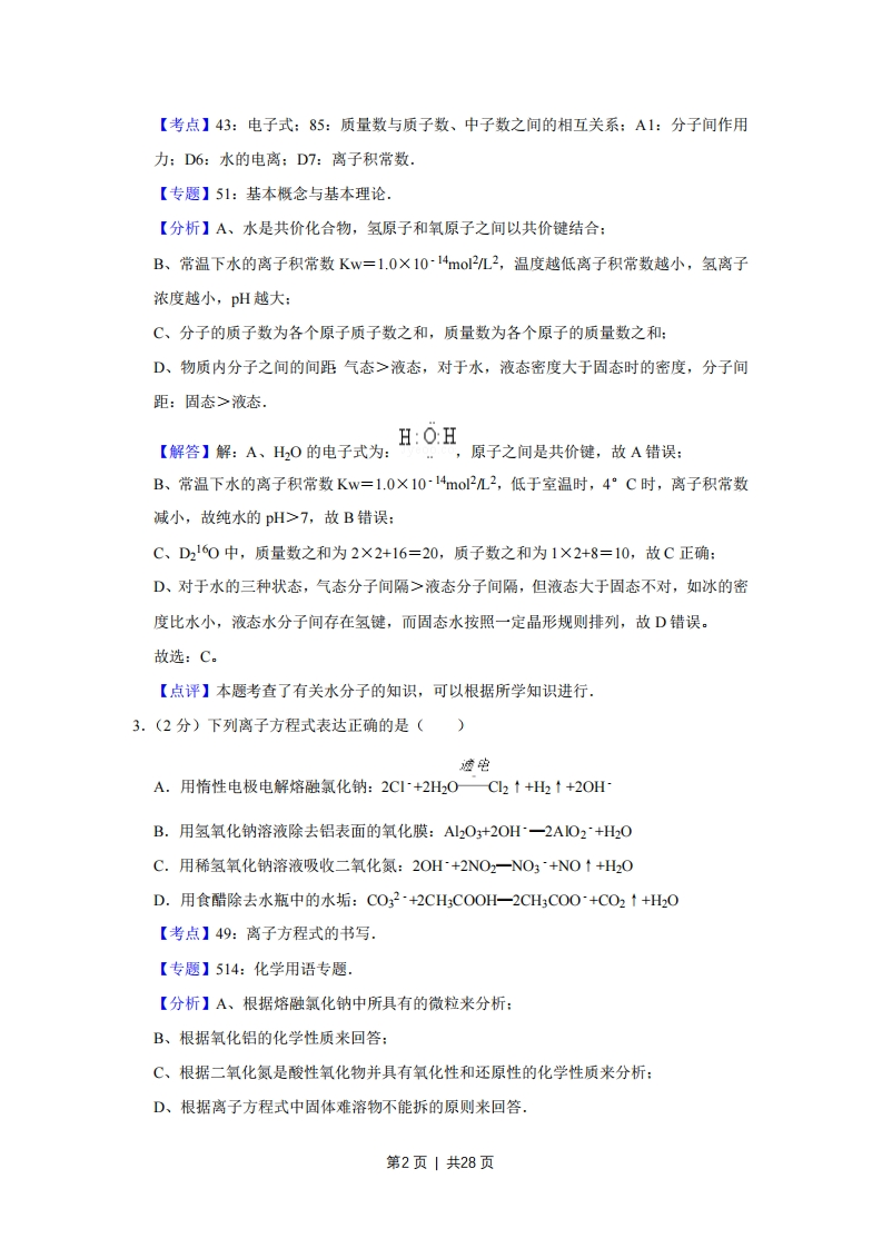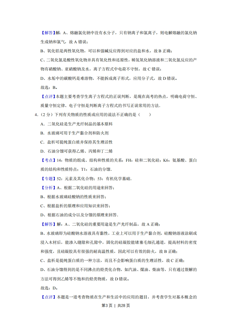 2010年江苏省高考化学试卷解析版◆考答案与试题解析一、选择题:本题包括7小题,每小题2分,共计14分。每小题只有一个选项符合题意1.(2分)化学与能源开发、环境保护、资源利用等密切相关.下列说法正确的是()A.为提高农作物的产量和质量,应大量使用化肥和农药B.绿色化学的核心是应用化学原理对环境污染进行治理C.实现化石燃料清洁利用,就无需开发新能源D.垃圾是放错地方的资源,应分类回收利用【考点】19:绿色化学,【分析】解这题要动用到平时积累的知识,密切联系生活实际,结合各个选项中考查的知识点,可得出答案,【解答】解A、大量使用化肥和农药不能提高农作物的产量和质量,应合理使用,故A错误:B、绿色化学的核心是利用化学原理从源头上减少和消除工业生产对环境的污染,故B错误:C、化石能源是有限的一次能源,为了长远的可持续发展,必须要开发新能源,故C错误:D、垃圾也是一项重要的资源,可回收的应回收利用,故D正确。故选:D。【点评】本题主要考查化学物质与生活得关系、绿色化学的概念、化肥农药对人类生活的影响.解题中联系到平时积累的知识.所以平时要注意多积累,做题时要积极联想,和所学知识联系起来,2.(2分)水是最宝贵的资源之一.下列表述正确的是()HA.H20的电子式为B.4C时,纯水的pH=7C.D2160中,质量数之和是质子数之和的两倍D.273K、101kPa,水分子间的平均距离d:d(气态)>d(液态)>d(固态)第1页1共28页【考点】43:电子式:85:质量数与质子数、中子数之间的相互关系:A1:分子间作用力:D6:水的电离:D7:离子积常数.【专题】51:基本概念与基本理论【分析】A、水是共价化合物,氢原子和氧原子之间以共价键结合:B、常温下水的离子积常数Kw=1.0×10~14ol2L2,温度越低离子积常数越小,氢离子浓度越小,pH越大:C、分子的质子数为各个原子质子数之和,质量数为各个原子的质量数之和:D、物质内分子之间的间距气态>液态,对于水,液态密度大于固态时的密度,分子间距:固态>液态H:O:H【解答】解:A、H0的电子式为:,原子之间是共价键,故A错误:B、常温下水的离子积常数Kw=1.0×10~14mol2L2,低于室温时,4°C时,离子积常数减小,故纯水的pH>7,故B错误:C、D20中,质量数之和为2×2+16=20,质子数之和为1×2+8=10,故C正确:D、对于水的三种状态,气态分子间隔>液态分子间隔,但液态大于固态不对,如冰的密度比水小,液态水分子间存在氢键,而固态水按照一定晶形规则排列,故D错误。故选:C。【点评】本题考查了有关水分子的知识,可以根据所学知识进行,3.(2分)下列离子方程式表达正确的是()透电A.用惰性电极电解熔融氯化钠:2C1~+2H20C2↑+H2↑+2OHB.用氢氧化钠溶液除去铝表面的氧化膜:Al2O3+2OH一2A1O2+H20C.用稀氢氧化钠溶液吸收二氧化氮:2OH~+2NO2一NO,ˉ+NO↑+H2OD.用食醋除去水瓶中的水垢:C032~+2CH3C0OH一2CH3C00~+C02↑+H20【考点】49:离子方程式的书写.【专题】514:化学用语专题【分析】A、根据熔融氯化钠中所具有的微粒来分析:B、根据氧化铝的化学性质来回答:C、根据二氧化氮是酸性氧化物并具有氧化性和还原性的化学性质来分析:D、根据离子方程式中固体难溶物不能拆的原则来回答.第2页1共28页【解答】解:A、熔融氯化钠中没有水分子,只有钠离子和氯离子,则电解熔融的氯化钠生成钠和氯气,故A错误:B、氧化铝是两性氧化物,可以和强碱反应得到对应的盐和水,故B正确:C、二氧化氮是酸性氧化物并具有氧化性和还原性,稀氢氧化钠溶液和二氧化氮反应的产物有硝酸钠、亚硝酸钠及水,离子方程式中电荷不守恒,故C错误:D、水垢中的碳酸钙是难溶物,不能拆成离子形式,应用分子式,故D错误。故选:B。【点评】本题主要考查学生离子方程式的正误判断,是现在高考的热点,明确电荷守恒、质量守恒定律、电子守恒是判断离子方程式的书写正误常用的方法.4.(2分)下列有关物质的性质或应用的说法不正确的是()A.二氧化硅是生产光纤制品的基本原料B.水玻璃可用于生产黏合剂和防火剂C.盐析可提纯蛋白质并保持其生理活性D.石油分馏可获得乙烯、丙烯和丁二烯【考点】14:物质的组成、结构和性质的关系:FH:硅和二氧化硅:K6:氨基酸、蛋白质的结构和性质特点:T1:石油的分馏【专题】52:元素及其化合物:53:有机化学基础.【分析】A、根据二氧化硅的用途来回答:B、根据水玻璃硅酸钠的性质来回答:C、根据盐析的原理和应用知识来回答:D、根据石油的成分以及分馏的原理来回答.【解答】解:A、二氧化硅的重要用途是生产光纤制品,故A正确:B、水玻璃即为硅酸钠水溶液具有黏性,工业上可以用于生产黏合剂,硅酸钠溶液涂刷或浸入木材后,能渗入缝隙和孔隙中,固化的硅凝胶能堵塞毛细孔通道,提高材料的密度和强度,且硅凝胶具有很强的耐高温性质,因此可以有效的防火,故B正确:C、盐析是提纯蛋白质的一种方法,而且不会影响蛋白质的生理活性,故C正确:D、石油分馏得到的是不同沸点的烃类化合物,如汽油、煤油、柴油等,只有通过裂解的方法可得到乙烯等不饱和的烃类物质,故D错误。故选:D。【点评】本题是一道考查物质在生产和生活中的应用的题目,并考查学生对基本概念的第3页|共28页