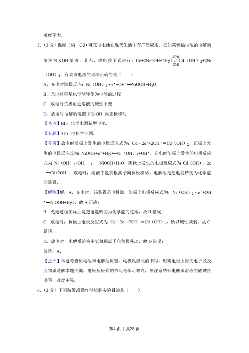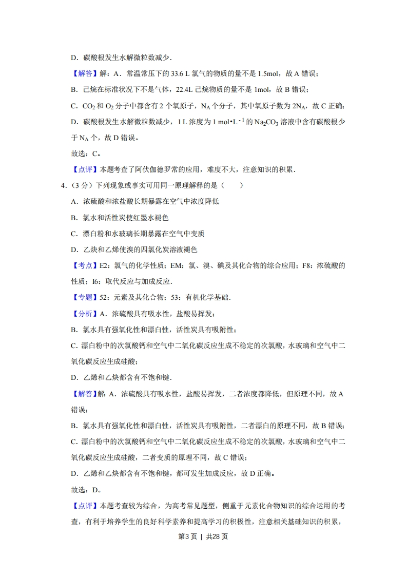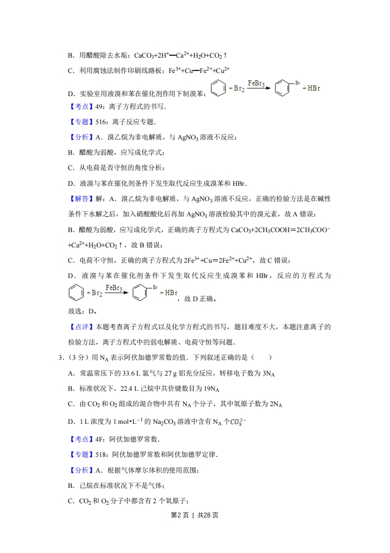 2008年江苏省高考化学试卷解析版◆考答案与试题解析一、单项选择题:本题包括8小题,每题3分,共24分。每小题只有一个选项符合题意1.(3分)化学与生活、社会密切相关.下列说法错误的是()A,利用太阳能等清洁能源代替化石燃料,有利于节约资源、保护环境B.凡含有食品添加剂的食物对人体健康均有害,不可食用C.为防止电池中的重金属等污染土壤和水体,应积极开发废电池的综合利用技术D.提倡人们购物时不用塑料袋,是为了防止白色污染【考点】BM:使用化石燃料的利弊及新能源的开发:KF:常见的食品添加剂的组成、性质和作用.【专题】21:热点问题.【分析】A.根据新能源使用的优点判断:B.根据辩证唯物主义“一分为二”的观点分析判断:C.根据废电池中铅、镉、汞等重金属对土壤和水源的污染非常严重:D.根据白色污染的含义判断.【解答】解:A.使用清洁能源可减少大气污染物的排放,还可以节约化石能源,故A正确:B.食品添加剂能改善食品品质、延长保存期、增加食品的营养成分,过多或添加禁止使用的物质才有害,故B错误:C.因废电池中铅、镉、汞等重金属对土壤和水源的污染非常严重,所以应积极开发废电池的综合利用技术,减少土壤和水源的污染,故C正确:D.白色污染是指废旧塑料制品带来的污染,提倡人们购物时不用塑料袋,能防止白色污染的产生,故D正确。故选:B。【点评】本题考查化学与生产、生活相关的化学知识,难度不大,在学习过程中要理论联系实际,在实践中领会知识,运用所学知识去解决实际问题.2.(3分)下列文字表述与反应方程式对应且正确的是()A.溴乙烷中滴入AgNO3溶液检验其中的溴元素:Br+Ag一AgBr,第1页1共28页B.用醋酸除去水垢:CaC03+2H一Ca2+H20+C021C.利用腐蚀法制作印刷线路板:Fe3#+Cu一Fe2+Cu2+]+Br2FeBr3,+HBrD.实验室用液溴和苯在催化剂作用下制溴苯:【考点】49:离子方程式的书写.【专题】516:离子反应专题.【分析】A.溴乙烷为非电解质,与AgNO3溶液不反应:B.醋酸为弱酸,应写成化学式:C.从电荷是否守恒的角度分析:D.液溴与苯在催化剂条件下发生取代反应生成溴苯和HB【解答】解:A.溴乙烷为非电解质,与AgNO3溶液不反应,正确的检验方法是在碱性条件下水解之后,加入硝酸酸化后再加AgNO3溶液检验其中的溴元素,故A错误:B.醋酸为弱酸,应写成化学式,正确的离子方程式为CCO+2 CH3COOH=2CH3CO0+Ca2+H20+C02↑,故B错误:C.电荷不守恒,正确的离子方程式为2Fe3++Cu=2e2+Cu2+,故C错误:D.液溴与苯在催化剂条件下发生取代反应生成溴苯和HB,反应的方程式为○+B下eBr3B+HBr故D正确。故选:D。【点评】本题考查离子方程式以及化学方程式的书写,题目难度不大,本题注意离子的检验方法,离子方程式中的弱电解质、电荷守恒等问题,3.(3分)用NA表示阿伏加德罗常数的值.下列叙述正确的是()A.常温常压下的33.6L氯气与27g铝充分反应,转移电子数为3NAB.标准状况下,22.4L己烷中共价键数目为19NAC.由CO2和O2组成的混合物中共有NA个分子,其中氧原子数为2NAD.1L浓度为1molL1的Na2CO3溶液中含有NA个CO【考点】4F:阿伏加德罗常数【专题】518:阿伏加德罗常数和阿伏加德罗定律.【分析】A.根据气体摩尔体积的使用范围:B.己烷在标准状况下不是气体:C.C02和02分子中都含有2个氧原子第2页|共28页D.碳酸根发生水解微粒数减少】【解答】解:A.常温常压下的33.6L氯气的物质的量不是1.5mol,故A错误:B.己烷在标准状况下不是气体,22.4L己烷物质的量不是1mol,故B错误:C.CO2和O2分子中都含有2个氧原子,NA个分子,其中氧原子数为2NA,故C正确:D.碳酸根发生水解微粒数减少,1L浓度为1molL~1的Na2CO3溶液中含有碳酸根少于NA个,故D错误。故选:C。【点评】本题考查了阿伏伽德罗常的应用,难度不大,注意知识的积累.4.(3分)下列现象或事实可用同一原理解释的是()A.浓硫酸和浓盐酸长期暴露在空气中浓度降低B.氯水和活性炭使红墨水褪色C.漂白粉和水玻璃长期暴露在空气中变质D.乙炔和乙烯使溴的四氯化炭溶液褪色【考点】E2:氯气的化学性质:EM:氯、溴、碘及其化合物的综合应用:F8:浓硫酸的性质:6:取代反应与加成反应【专题】52:元素及其化合物:53:有机化学基础.【分析】A.浓硫酸具有吸水性,盐酸易挥发:B.氯水具有强氧化性和漂白性,活性炭具有吸附性:C.漂白粉中的次氯酸钙和空气中二氧化碳反应生成不稳定的次氯酸,水玻璃和空气中二氧化碳反应生成硅酸:D.乙烯和乙炔都含有不饱和键.【解答】解A.浓硫酸具有吸水性,盐酸易挥发,二者浓度都降低,但原理不同,故A错误:B.氯水具有强氧化性和漂白性,活性炭具有吸附性,二者漂白的原理不同,故B错误:C.漂白粉中的次氯酸钙和空气中二氧化碳反应生成不稳定的次氯酸,水玻璃和空气中二氧化碳反应生成硅酸,二者变质的原理不同,故C错误:D.乙烯和乙炔都含有不饱和键,都可发生加成反应,故D正确。故选:D。【点评】本题考查较为综合,为高考常见题型,侧重于元素化合物知识的综合运用的考查,有利于培养学生的良好科学素养和提高学习的积极性,注意相关基础知识的积累,第3页|共28页