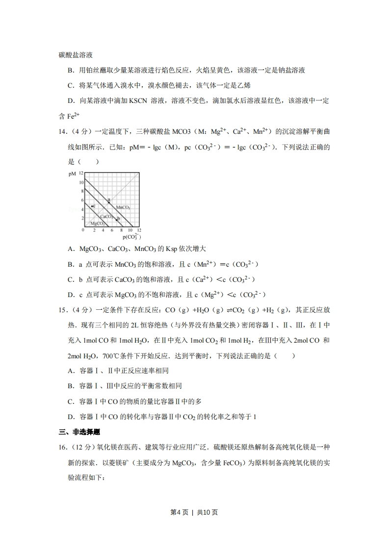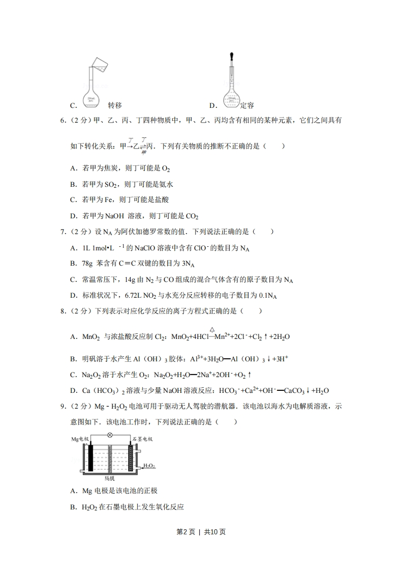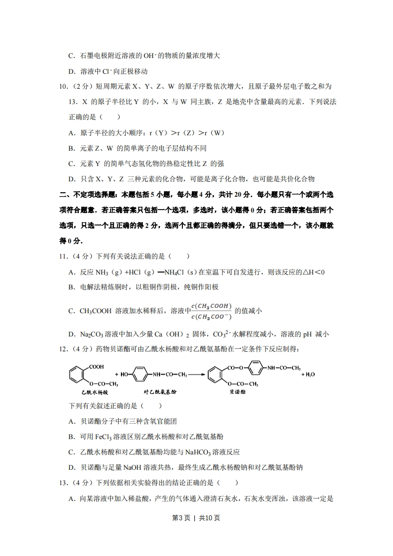 2013年江苏省高考化学试卷一、单项选择题:本题包括10小题,每小题2分,共计20分.每小题只有一个选项符合题意.1.(2分)燃料电池能有效提高能源利用率,具有广泛的应用前景.下列物质均可用作燃料电池的燃料,其中最环保的是()A.甲醇B.天然气C.液化石油气D.氢气2.(2分)下列有关化学用语表示正确的是()A.丙烯的结构简式:C3H6B.氢氧根离子的电子式:[0:HC.氯原子的结构示意图:⊙》D.中子数为146、质子数为92的轴(U)原子U3.(2分)常温下,下列各组离子在指定溶液中一定能大量共存的是()A.使甲基橙变红色的溶液:Mg2+、K+、SO42、NO3B.使酚酞变红色的溶液:Na、Cu2+、HCO3、NO3C.0.1molL-IAgNO3溶液:H、K+、SO42-、ID.0.1 molL-NaAlO2溶液:H、Na、CI、SO42-4.(2分)下列有关物质性质的应用正确的是()A.液氨汽化时要吸收大量的热,可用作制冷剂B.二氧化硅不与强酸反应,可用石英器皿盛放氢氟酸C.生石灰能与水反应,可用来干燥氯气D.氯化铝是一种电解质,可用于电解法制铝5.(2分)用固体样品配制一定物质的量浓度的溶液,需经过称量、溶解、转移溶液、定容等操作。下列图示对应的操作规范的是()称量溶解第1页1共10页C转移D.定容6.(2分)甲、乙、丙、丁四种物质中,甲、乙、丙均含有相同的某种元素,它们之间具有如下转化关系:甲→乙三丙.下列有关物质的推断不正确的是()A.若甲为焦炭,则丁可能是O2B.若甲为SO2,则丁可能是氨水C.若甲为Fe,则丁可能是盐酸D.若甲为NaOH溶液,则丁可能是CO27.(2分)设NA为阿伏加德罗常数的值.下列说法正确的是()A.1 L 1mol-L-1的NaCIO溶液中含有CIO的数目为NAB.78g苯含有C=C双键的数目为3NAC.常温常压下,14g由N2与CO组成的混合气体含有的原子数目为NAD.标准状况下,6.72LNO2与水充分反应转移的电子数目为0.1NA8.(2分)下列表示对应化学反应的离子方程式正确的是()A.MnO2与浓盐酸反应制C2:MnO2+4HCMn2++2C-+Ch↑+2H20B.明矾溶于水产生A1(OH)3胶体:A3+3HO一AI(OH)3↓+3HC.Na202溶于水产生O2:Na202+Hz0一2Na+20H+O2↑D.Ca(HC03)2溶液与少量NaOH溶液反应:HC03+Ca2+OH一CaC03↓+H209.(2分)Mg-H202电池可用于驱动无人驾驶的潜航器.该电池以海水为电解质溶液,示意图如下.该电池工作时,下列说法正确的是()Mg电极】石墨电板隔膜A.Mg电极是该电池的正极B.HO2在石墨电极上发生氧化反应第2页|共10页C.石墨电极附近溶液的OH~的物质的量浓度增大D.溶液中C向正极移动10.(2分)短周期元素X、Y、Z、W的原子序数依次增大,且原子最外层电子数之和为13.X的原子半径比Y的小,X与W同主族,Z是地壳中含量最高的元素.下列说法正确的是()A.原子半径的大小顺序:r(Y)>r(Z)>r(W)B.元素Z、W的简单离子的电子层结构不同C.元素Y的简单气态氢化物的热稳定性比Z的强D.只含X、Y、Z三种元素的化合物,可能是离子化合物,也可能是共价化合物二、不定项选择题:本愿包括5小题,每小题4分,共计20分。每小题只有一个或两个选项符合题意。若正确答案只包括一个选项,多选时,该小题得0分:若正确答案包括两个选项,只选一个且正确的得2分,选两个且都正确的得满分,但只要选错一个,该小题就得0分.11.(4分)下列有关说法正确的是()A.反应NH(g)+HC(g)一NH4CI(s)在室温下可自发进行,则该反应的△H<0B.电解法精炼铜时,以粗铜作阴极,纯铜作阳极C.CHCO0H溶液加水稀释后,溶液中c(CH,CO0)的值减小c(CH3Coo-)D.N2CO3溶液中加入少量Ca(OH)2固体,CO32~水解程度减小,溶液的pH减小12.(4分)药物贝诺酯可由乙酰水杨酸和对乙酰氨基酚在一定条件下反应制得:COOHC0=0NH-CO-CHHO-NH-CO-CH,-+H00-C0-CH,O-CO-CH乙酰水杨酸对乙酰氨基阶贝诺酯下列有关叙述正确的是()A.贝诺酯分子中有三种含氧官能团B.可用FeC3溶液区别乙酰水杨酸和对乙酰氨基酚C.乙酰水杨酸和对乙酰氨基酚均能与NaHCO3溶液反应D.贝诺酯与足量NOH溶液共热,最终生成乙酰水杨酸钠和对乙酰氨基酚钠13.(4分)下列依据相关实验得出的结论正确的是()A.向某溶液中加入稀盐酸,产生的气体通入澄清石灰水,石灰水变浑浊,该溶液一定是第3页|共10页