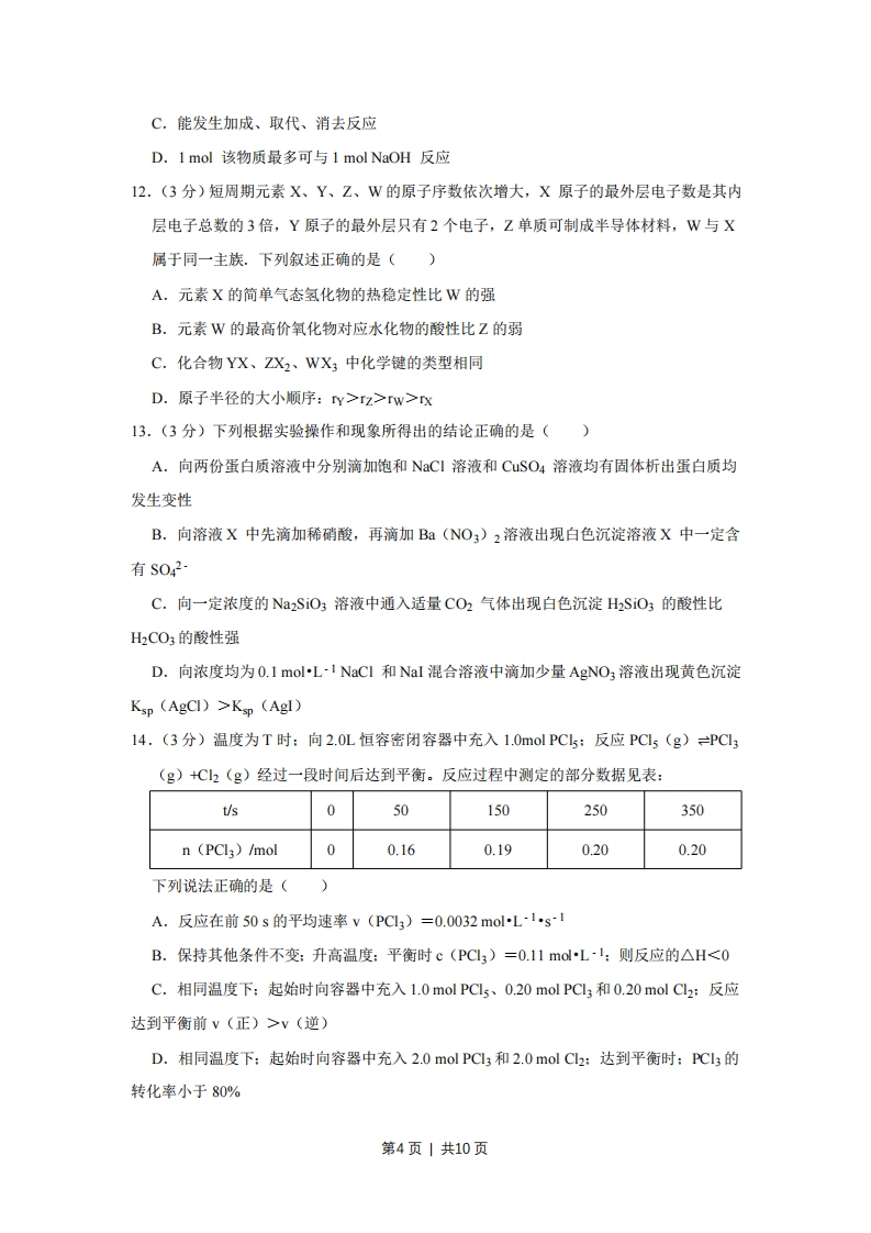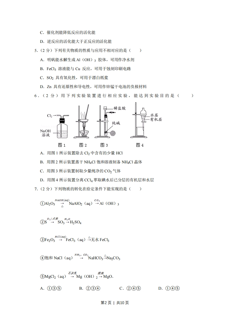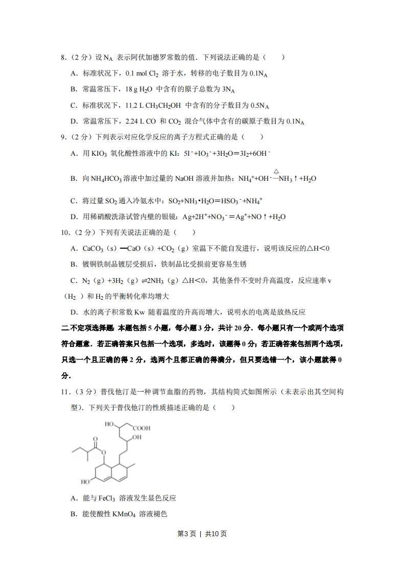2012年江苏省高考化学试卷一单项选释题:本题包括10小题,每小题2分,共计20分.每小题只有一个选项符合题意.1.(2分)化学在资源利用、环境保护等与社会可持续发展密切相关的领域发挥着积极作用.下列做法与社会可持续发展理念相违背的是()A.改进汽车尾气净化技术,减少大气污染物的排放B.开发利用可再生能源,减少化石燃料的使用C.研发可降解高分子材料,减少“白色污染”D.过度开采矿物资源,促进地方经济发展2.(2分)下列有关化学用语表示正确的是()A.乙酸的结构简式:C2H4O2B.F的结构示意图:C.中子数为20的氯原子:2017CH:N:HD.NH3的电子式:i3.(2分)常温下,下列各组离子在指定溶液中一定能大量共存的是()A.0.1 mol'L-INaOH溶液:K+、Na+、S042、C032B.0.1 mol'L-INa2CO3溶液:K+、Ba2+、NO3、ClC.0.ImolL-FeCla3溶液:K+、NH、、SCND.c(H)e(OH)=1×1014的溶液:Ca2+、Na、CIO、NO34.(2分)某反应的反应过程中能量变化如图所示(图中E表示正反应的活化能,E2表示逆反应的活化能).下列有关叙述正确的是()无催化剂有催化剂、△HI生成物反应物反应过程A.该反应为吸热反应B.催化剂能改变反应的焓变第1页1共10页C.催化剂能降低反应的活化能D.逆反应的活化能大于正反应的活化能5.(2分)下列有关物质的性质与应用不相对应的是()A.明矾能水解生成A!(OH)3胶体,可用作净水剂B.FeCl3溶液能与Cu反应,可用于蚀刻印刷电路C.SO2具有氧化性,可用于漂白纸浆D.Z具有还原性和导电性,可用作锌锰干电池的负极材料6·(2分)用下列实验装置进行相应实验,能达到实验目的是()希盐酸水层有机层NaOH溶液图1图2图3图4A.用图1所示装置除去C2中含有的少量HCIB.用图2所示装置蒸干NH4CI饱和溶液制备NH4CI晶体C.用图3所示装置制取少量纯净的CO2气体D.用图4所示装置分离CC14萃取碘水后己分层的有机层和水层7.(2分)下列物质的转化在给定条件下能实现的是()NaoH(aq)①Al2O3子NaAIO2(aq)Al(OH)3C02@ss0,9H,s04③Fe,0,"caFC,(aq)无水FeC④饱和NaC(aq)W,NaHC0,NaC0,石灰乳⑤MgCl2(aq)Mg(OH)2→Mg0.A.①③⑤B.②③④C.②④⑤D.①④⑤第2页1共10页8.(2分)设NA表示阿伏加德罗常数的值.下列说法正确的是()A.标准状况下,0.1molC2溶于水,转移的电子数目为0.1NAB.常温常压下,18gH2O中含有的原子总数为3NAC.标准状况下,11.2 L CH3CH2OH中含有的分子数目为0.5NAD.常温常压下,2.24LC0和CO2混合气体中含有的碳原子数目为0.1NA9.(2分)下列表示对应化学反应的离子方程式正确的是()A.用KIO3氧化酸性溶液中的KI:51~+IO3+3H0=3引2+6OH-B.向NH4HCO3溶液中加过量的NaOH溶液并加热:NH4+OH-NH3↑+H2OC.将过量SO2通入冷氨水中:SO2+NH3H2O=HSO3~+NH4D.用稀硝酸洗涤试管内壁的银镜:Ag+2H+NO3ˉ=Ag+NO↑+H2O10.(2分)下列有关说法正确的是()A.CaCO3(s)一CaO(s)+CO2(g)室温下不能自发进行,说明该反应的△H<0B.镀铜铁制品镀层受损后,铁制品比受损前更容易生锈C.N2(g)+3H2(g)=2NH(g)△H<0,其他条件不变时升高温度,反应速率V(H2)和H2的平衡转化率均增大D.水的离子积常数Kw随着温度的升高而增大,说明水的电离是放热反应二不定项选择题本题包括5小题,每小题3分,共计20分。每小题只有一个或两个选项符合题意,若正确答案只包括一个选项,多选时,该题得0分;若正确答案包括两个选项,只选一个且正确的得2分,选两个且都正确的得满分,但只要选错一个,该小题就得0分.11.(3分)普伐他汀是一种调节血脂的药物,其结构简式如图所示(未表示出其空间构型).下列关于普伐他汀的性质描述正确的是()HOCOOHOHHOA.能与FeCl3溶液发生显色反应B.能使酸性KMnO4溶液褪色第3页|共10页