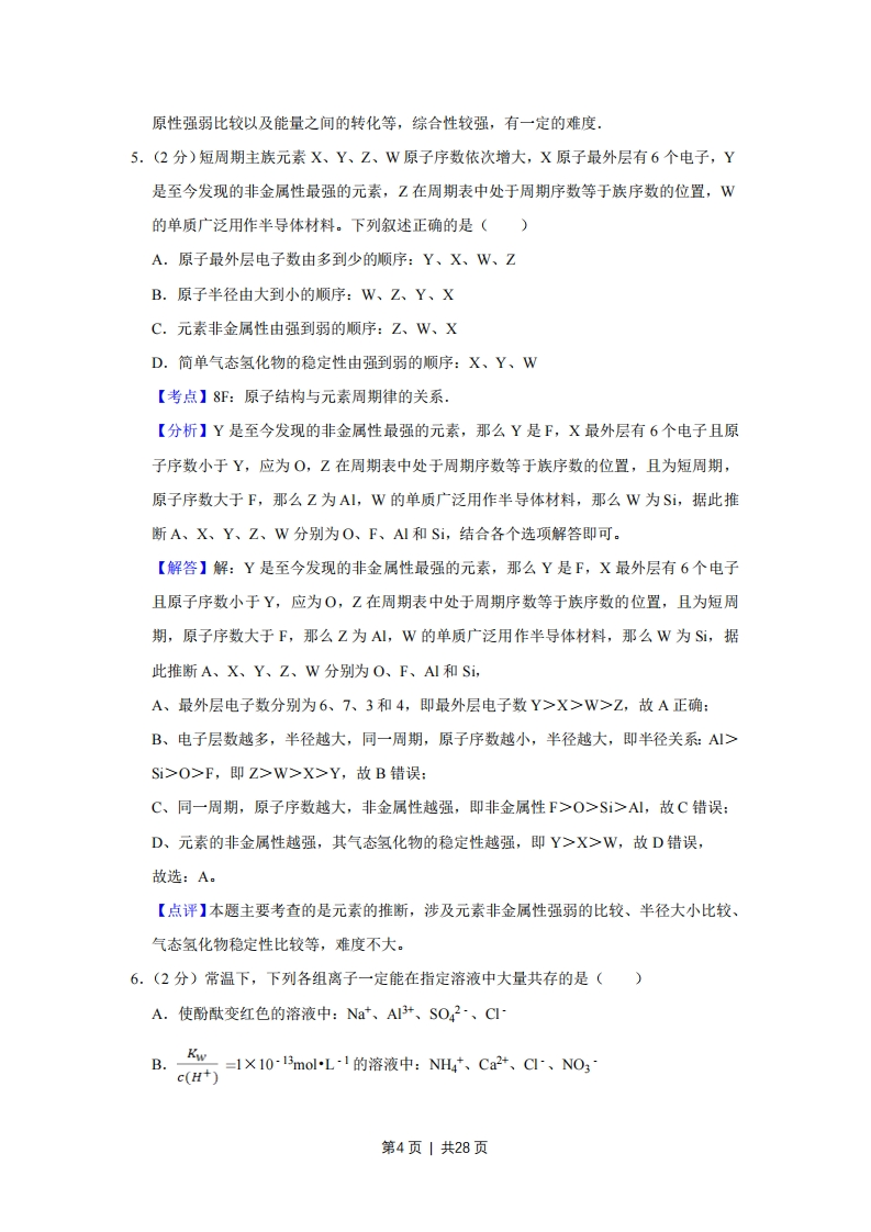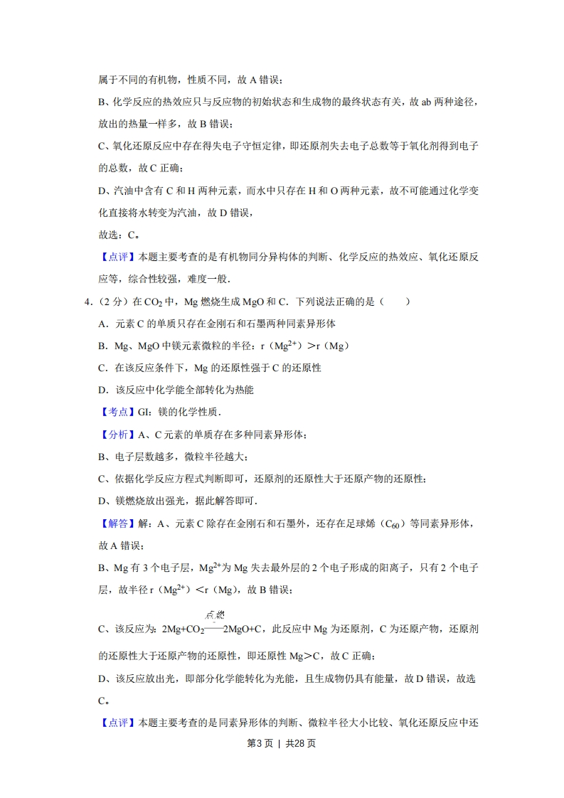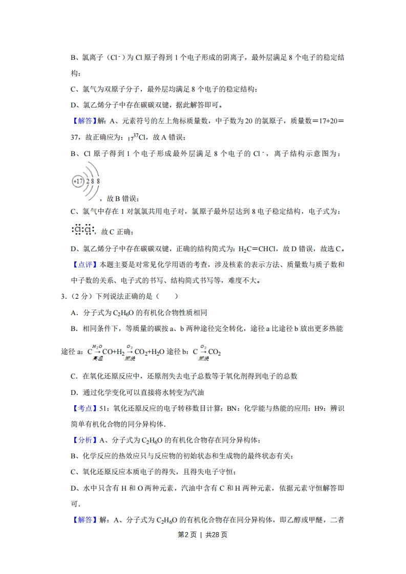 2015年江苏省高考化学试卷解析版◆考答案与试题解折一、单项选择题:本题包括10小题,每小题2分,共计20分。每小题只有一个选项符合题意.1.(2分)“保护环境”是我国的基本国策.下列做法不应该提倡的是()A.采取低碳、节俭的生活方式B.按照规定对生活废弃物进行分类放置C.深入农村和社区宣传环保知识D.经常使用一次性筷子、纸杯、塑料袋等【考点】F7:常见的生活环境的污染及治理.【分析】保护环境,可从减少污染物的排放、开发新能源等角度分析.【解答】解:A、采取低碳、节俭的生活方式,节省大量的能源,符合保护环境的措施,故A不选:B、垃圾分类有利于环境的保护和资源的再利用,符合保护环境的措施,故B不选:C、伸入农村和社区宣传环保知识,树立保护环境从自我做起、保护环境人人有责的意识,符合保护环境的措施,故C不选:D、经常使用一次性筷子和纸杯,会消耗大量的木材,一次性塑料袋的大量使用会造成白色污染,故措施不合理,故D选:故选D。【点评】本题主要考查环境保护,注意保护环境人人有责,从自我做起,从小事做起,明确环境和人类发展的关系及环境保护意识即可解答,题目难度不大2.(2分)下列有关氯元素及其化合物的表示正确的是()A.质子数为17、中子数为20的氯原子CB.氯离子(C)的结构示意图:C.氯分子的电子式::i::D.氯乙烯分子的结构简式:HC-CH2C【考点】4:电子式、化学式或化学符号及名称的综合.【分析】A、元素符号的左上角标质量数,质量数=质子数+中子数:第1页1共28页B、氯离子(C~)为C原子得到1个电子形成的阴离子,最外层满足8个电子的稳定结构:C、氯气为双原子分子,最外层均满足8个电子的稳定结构:D、氯乙烯分子中存在碳碳双键,据此解答即可。【解答】解:A、元素符号的左上角标质量数,中子数为20的氯原子,质量数=17+20=37,故正确应为:17Cl,故A错误:B、C原子得到1个电子形成最外层满足8个电子的C·,离子结构示意图为:故B错误:C、氯气中存在1对氯氯共用电子对,氯原子最外层达到8电子稳定结构,电子式为::i:,故C正确:D、氯乙烯分子中存在碳碳双键,正确的结构简式为:H2C=CHCI,故D错误,故选C,【点评】本题主要是对常见化学用语的考查,涉及核素的表示方法、质量数与质子数和中子数的关系、电子式的书写、结构简式书写等,难度不大。3.(2分)下列说法正确的是()A.分子式为C2H60的有机化合物性质相同B.相同条件下,等质量的碳按a、b两种途径完全转化,途径a比途径b放出更多热能途径a:CC0+H,2C02+H,0途径b:C9C02本温燃楚C.在氧化还原反应中,还原剂失去电子总数等于氧化剂得到电子的总数D.通过化学变化可以直接将水转变为汽油【考点】51:氧化还原反应的电子转移数目计算:BN:化学能与热能的应用:H9:辨识简单有机化合物的同分异构体【分析】A、分子式为C2H60的有机化合物存在同分异构体:B、化学反应的热效应只与反应物的初始状态和生成物的最终状态有关:C、氧化还原反应本质电子的得失,且得失电子守恒:D、水中只含有H和O两种元素,汽油中含有C和H两种元素,依据元素守恒解答即可【解答】解:A、分子式为C2H。0的有机化合物存在同分异构体,即乙醇或甲醚,二者第2页|共28页属于不同的有机物,性质不同,故A错误:B、化学反应的热效应只与反应物的初始状态和生成物的最终状态有关,故b两种途径,放出的热量一样多,故B错误:C、氧化还原反应中存在得失电子守恒定律,即还原剂失去电子总数等于氧化剂得到电子的总数,故C正确:D、汽油中含有C和H两种元素,而水中只存在H和O两种元素,故不可能通过化学变化直接将水转变为汽油,故D错误,故选:C。【点评】本题主要考查的是有机物同分异构体的判断、化学反应的热效应、氧化还原反应等,综合性较强,难度一般4.(2分)在CO2中,Mg燃烧生成Mg0和C.下列说法正确的是()A.元素C的单质只存在金刚石和石墨两种同素异形体B.Mg、MgO中镁元素微粒的半径:r(Mg2+)>r(Mg)C.在该反应条件下,Mg的还原性强于C的还原性D.该反应中化学能全部转化为热能【考点】GL:镁的化学性质【分析】A、C元素的单质存在多种同素异形体:B、电子层数越多,微粒半径越大:C、依据化学反应方程式判断即可,还原剂的还原性大于还原产物的还原性:D、镁燃烧放出强光,据此解答即可.【解答】解:A、元素C除存在金刚石和石墨外,还存在足球烯(C60)等同素异形体,故A错误:B、Mg有3个电子层,Mg2+为Mg失去最外层的2个电子形成的阳离子,只有2个电子层,故半径r(Mg+)C,故C正确:D、该反应放出光,即部分化学能转化为光能,且生成物仍具有能量,故D错误,故选C。【点评】本题主要考查的是同素异形体的判断、微粒半径大小比较、氧化还原反应中还第3页1共28页