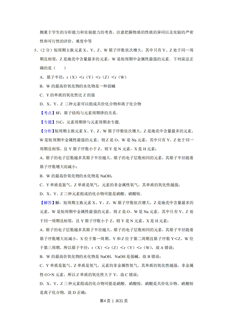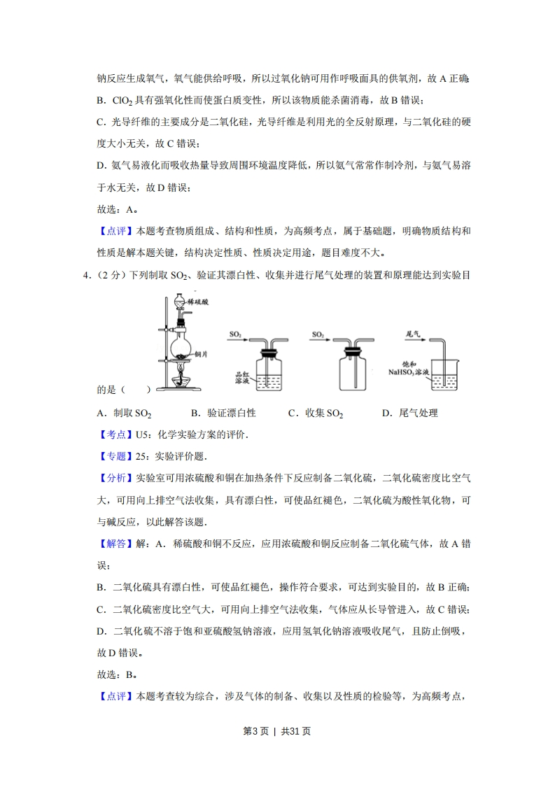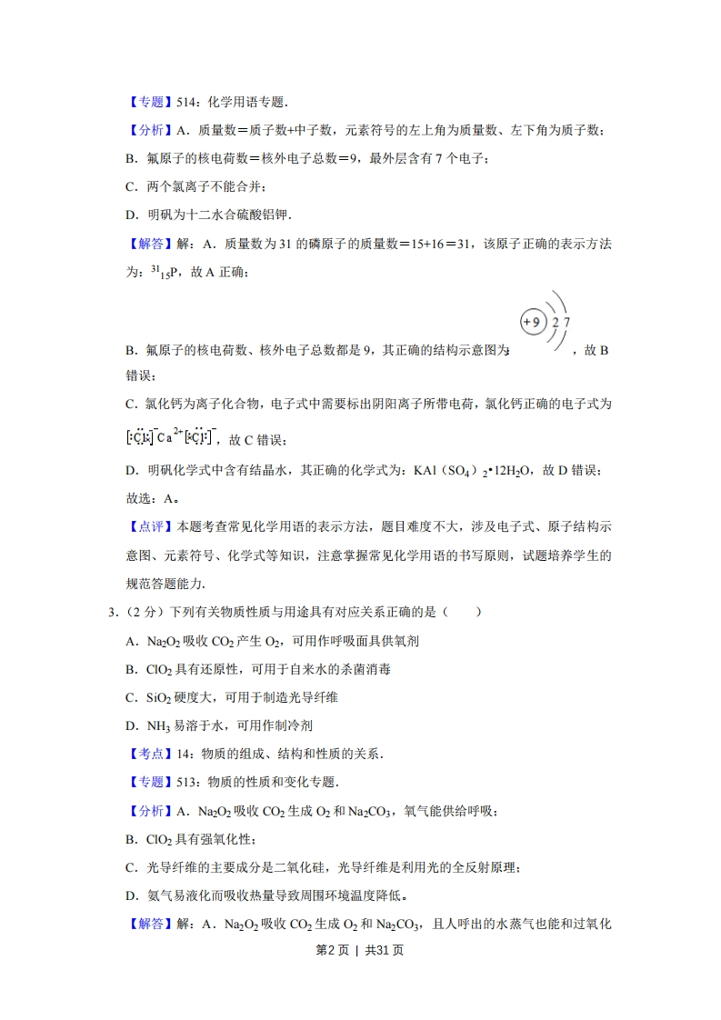 2017年江苏省高考化学试卷解析版◆考答案与试题解析一、单项选择题:本题包括10小题,每小题2分,共计20分。每小题只有一个选项符合题意.1.(2分)2017年世界地球日我国的主题为“节约集约利用资源,倡导绿色简约生活”.下列做法应提倡的是()A.夏天设定空调温度尽可能的低B.推广使用一次性塑料袋和纸巾C.少开私家车多乘公共交通工具D.对商品进行豪华包装促进销售【考点】FE:"三废"处理与环境保护.【专题】56:化学应用.【分析】绿色简约生活方式是一种生活理念,也是一种生活态度,指的是生活作息时所耗用的能量要尽量减少,特别是减少二氧化碳的排放量,减缓生态恶化:可以从节电、节能和回收等环节来改变生活细节,据此进行分析判断即可【解答】解A、夏天设定空调温度尽可能的低,浪费了电能资源,增加能量损耗,故A错误:B、推广使用一次性塑料袋和纸巾,浪费了资源,故B错误:C、少开私家车多乘公共交通工具,可以节约资源,减少空气污染,故C正确:D、对商品进行豪华包装促进销售,浪费了资源,故D错误:故选:C。【点评】解答本题关键是看是否减少了对空气中可吸收颗粒物的释放,环保问题已经引起了全球的重视,难度不大。2.(2分)下列有关化学用语表示正确的是()A.质量数为31的磷原子:3引1sPB.氟原子的结构示意图:⊙》C.CaC,的电子式:CaD.明矾的化学式:A2(SO4)3【考点】4:电子式、化学式或化学符号及名称的综合,第1页1共31页【专题】514:化学用语专题,【分析】A.质量数=质子数+中子数,元素符号的左上角为质量数、左下角为质子数:B.氟原子的核电荷数=核外电子总数=9,最外层含有7个电子:C.两个氯离子不能合并:D.明矾为十二水合硫酸铝钾.【解答】解:A.质量数为31的磷原子的质量数=15+16=31,该原子正确的表示方法为:3引1P,故A正确:B.氟原子的核电荷数、核外电子总数都是9,其正确的结构示意图为,故B错误:C.氯化钙为离子化合物,电子式中需要标出阴阳离子所带电荷,氯化钙正确的电子式为cCa2C的,故C错误:D.明矾化学式中含有结晶水,其正确的化学式为:KA1(SO4)212H2O,故D错误:故选:A。【点评】本题考查常见化学用语的表示方法,题目难度不大,涉及电子式、原子结构示意图、元素符号、化学式等知识,注意掌握常见化学用语的书写原则,试题培养学生的规范答题能力,3.(2分)下列有关物质性质与用途具有对应关系正确的是()A.Na2O2吸收CO2产生O2,可用作呼吸面具供氧剂B.CO2具有还原性,可用于自来水的杀菌消毒C.SO2硬度大,可用于制造光导纤维D.NH3易溶于水,可用作制冷剂【考点】14:物质的组成、结构和性质的关系.【专题】513:物质的性质和变化专题.【分析】A.NaO2吸收CO2生成O2和Na2CO3,氧气能供给呼吸:B.CIO2具有强氧化性:C.光导纤维的主要成分是二氧化硅,光导纤维是利用光的全反射原理:D.氨气易液化而吸收热量导致周围环境温度降低。【解答】解:A.Na2O2吸收CO2生成O2和NCO3,且人呼出的水蒸气也能和过氧化第2页|共31页钠反应生成氧气,氧气能供给呼吸,所以过氧化钠可用作呼吸面具的供氧剂,故A正确B.CO2具有强氧化性而使蛋白质变性,所以该物质能杀菌消毒,故B错误:C.光导纤维的主要成分是二氧化硅,光导纤维是利用光的全反射原理,与二氧化硅的硬度大小无关,故C错误:D.氨气易液化而吸收热量导致周围环境温度降低,所以氨气常常作制冷剂,与氨气易溶于水无关,故D错误:故选:A。【点评】本题考查物质组成、结构和性质,为高频考点,属于基础题,明确物质结构和性质是解本题关键,结构决定性质、性质决定用途,题目难度不大。4.(2分)下列制取SO2、验证其漂白性、收集并进行尾气处理的装置和原理能达到实验目尾气他和NaHSO,落液的是(A.制取SO2B.验证漂白性C.收集SO2D.尾气处理【考点】U5:化学实验方案的评价.【专题】25:实验评价题,【分析】实验室可用浓硫酸和铜在加热条件下反应制备二氧化硫,二氧化硫密度比空气大,可用向上排空气法收集,具有漂白性,可使品红褪色,二氧化硫为酸性氧化物,可与碱反应,以此解答该题。【解答】解:A.稀硫酸和铜不反应,应用浓硫酸和铜反应制备二氧化硫气体,故A错误:B.二氧化硫具有漂白性,可使品红褪色,操作符合要求,可达到实验目的,故B正确:C.二氧化硫密度比空气大,可用向上排空气法收集,气体应从长导管进入,故C错误:D.二氧化硫不溶于饱和亚硫酸氢钠溶液,应用氢氧化钠溶液吸收尾气,且防止倒吸,故D错误。故选:B。【点评】本题考查较为综合,涉及气体的制备、收集以及性质的检验等,为高频考点,第3页1共31页