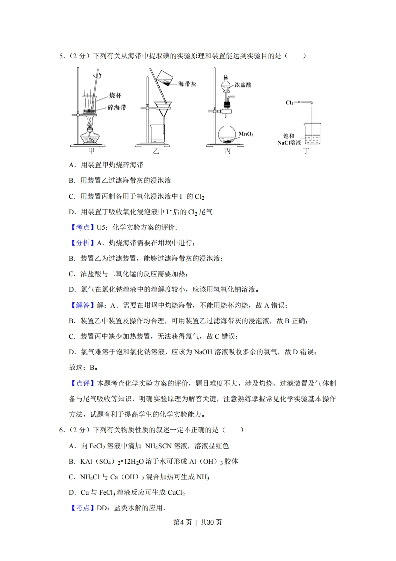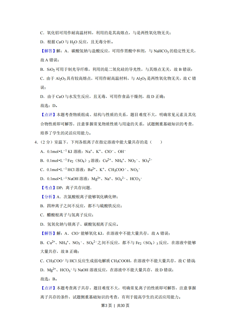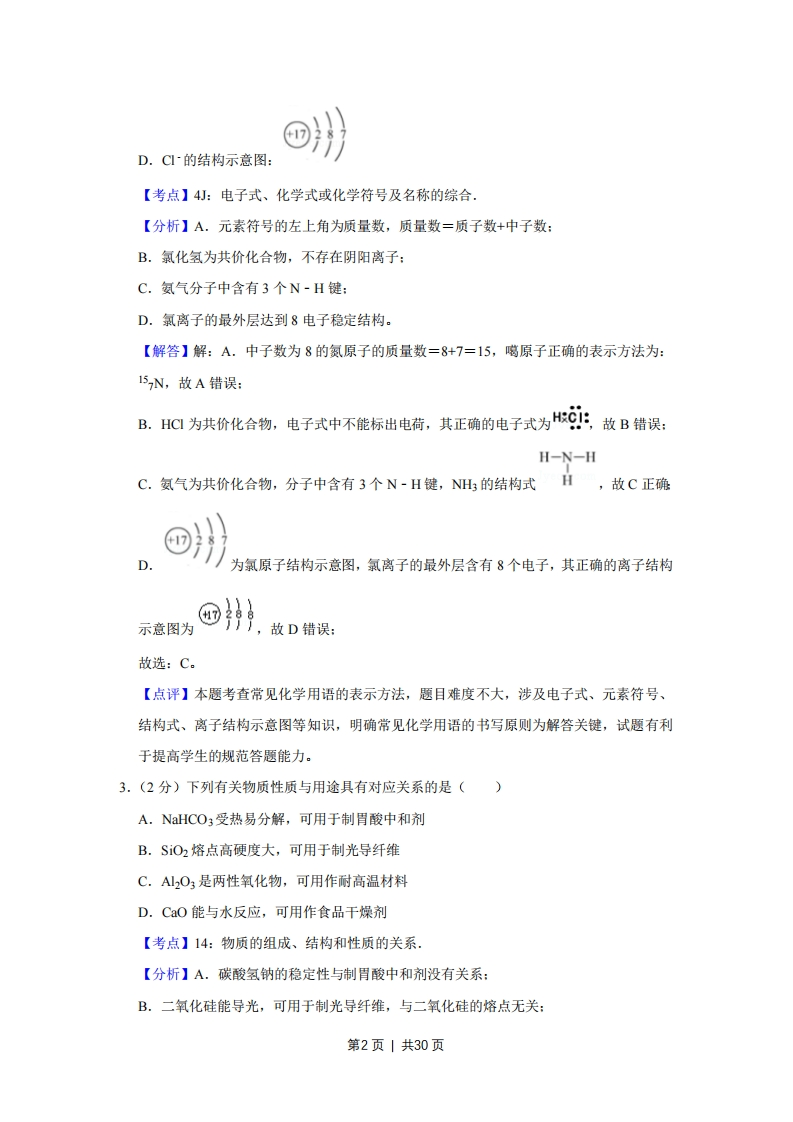 2018年江苏省高考化学试卷解析版事考答案与试题佩折一、单项选择题共10小题,每小题2分,共20分1.(2分)CO2是自然界碳循环中的重要物质。下列过程会引起大气中CO2含量上升的是()A.光合作用B.自然降雨C.化石燃料的燃烧D.碳酸盐的沉积【考点】BM:使用化石燃料的利弊及新能源的开发【分析】A.光合作用是吸收空气中二氧化碳生成氧气:B.二氧化碳微溶于水,自然降雨过程中二氧化碳含量减少:C.化石燃料燃烧会生成大量二氧化碳:D.碳酸盐沉积是空气中二氧化碳反应生成沉淀的过程。【解答】解A.光合作用是叶绿素吸收二氧化碳生成氧气,过程中不会引起大气中CO2含量上升,故A错误:B.自然降雨过程中,空气中二氧化碳部分溶于水,过程中不会引起大气中CO2含量上升,故B错误:C.化石燃料为煤、石油、天然气等,都含碳元素,化石燃料的燃烧过程中都会生成二氧化碳气体,过程会引起大气中CO2含量上升,故C正确:D.碳酸盐的沉积是碳元素减少的过程,过程中不会引起大气中CO2含量上升,故D错误:故选:C。【点评】本题考查了碳循环过程中碳元素的变化、化石燃料燃烧、化合反应等,掌握基础是解题关键,题目难度不大。2.(2分)用化学用语表示NH3+HC一NH4C1中的相关微粒,其中正确的是()A.中子数为8的氮原子:NB.HC的电子式:HH-N-HC.NH的结构式:H第1页1共30页D.C的结构示意图:【考点】4:电子式、化学式或化学符号及名称的综合【分析】A.元素符号的左上角为质量数,质量数=质子数+中子数:B.氯化氢为共价化合物,不存在阴阳离子:C.氨气分子中含有3个N-H键:D.氯离子的最外层达到8电子稳定结构。【解答】解:A.中子数为8的氮原子的质量数=8+7=15,噶原子正确的表示方法为:15N,故A错误:B.HC为共价化合物,电子式中不能标出电荷,其正确的电子式为HG】,故B错误:H-N-HC.氨气为共价化合物,分子中含有3个N-H键,NH的结构式H,故C正确为氯原子结构示意图,氯离子的最外层含有8个电子,其正确的离子结构示意图为故D错误:故选:C。【点评】本题考查常见化学用语的表示方法,题目难度不大,涉及电子式、元素符号、结构式、离子结构示意图等知识,明确常见化学用语的书写原则为解答关键,试题有利于提高学生的规范答题能力。3.(2分)下列有关物质性质与用途具有对应关系的是()A.NaHCO3受热易分解,可用于制胃酸中和剂B.SO2熔点高硬度大,可用于制光导纤维C.A12O3是两性氧化物,可用作耐高温材料D.CaO能与水反应,可用作食品干燥剂【考点】14:物质的组成、结构和性质的关系.【分析】A.碳酸氢钠的稳定性与制胃酸中和剂没有关系:B.二氧化硅能导光,可用于制光导纤维,与二氧化硅的熔点无关:第2页1共30页C.氧化铝可用作耐高温材料,利用的是其高熔点,与是两性氧化物无关:D.根据CaO与HO反应,且无毒分析。【解答】解:A.碳酸氢钠与盐酸反应,可用作胃酸中和剂,与NHCO3的稳定性无关,故A错误:B.SO2可用于制光导纤维,利用的是二氧化硅的导光性,与其熔点无关,故B错误:C.由于A12O3具有较高熔点,可用作耐高温材料,与A12O3是两性氧化物无关,故C错误:D.由于CaO与水发生反应,且无毒,可用作食品干燥剂,故D正确:故选:D【点评】本题考查物质组成、结构与性质的关系,题目难度不大,明确常见元素及其化合物性质即可解答,注意掌握常见物质性质与用途的关系,试题侧重基础知识的考查,培养了学生的灵活应用能力。4.(2分)室温下,下列各组离子在指定溶液中能大量共存的是()A.0.1mol·LKI溶液:Na、K、ClO、OHB.0.1molL1Fe2(S04)3溶液:Cu2+、NH4、NO3、S042-C.0.1molL1HC溶液:Ba2+、K+、CH;COO、NO3D.0.1molL-1NaOH溶液:Mg2+、Na、S042-、HC03【考点】DP:离子共存问题【分析】A.次氯酸根离子能够氧化碘化钾:B.四种离子之间不反应,都不与硫酸铁反应:C.醋酸根离子与氢离子反应:D.氢氧化钠与镁离子、碳酸氢根离子反应。【解答】解:A.CO能够氧化KI,在溶液中不能大量共存,故A错误:B.Cu2+、NH4、NO3、SO42-之间不反应,都不与Fe2(SO4)3反应,在溶液中能够大量共存,故B正确:C.CH:COO~与HCI反应生成弱电解质CH3COOH,在溶液中不能大量共存,故C错误D.Mg2+、HCO3~与NaOH溶液反应,在溶液中不能大量共存,故D错误:故选:B。【点评】本题考查离子共存,题目难度不大,明确常见离子的性质即可解答,注意掌握离子共存的条件,试题侧重基础知识的考查,有利于提高学生的灵活应用能力。第3页1共30页