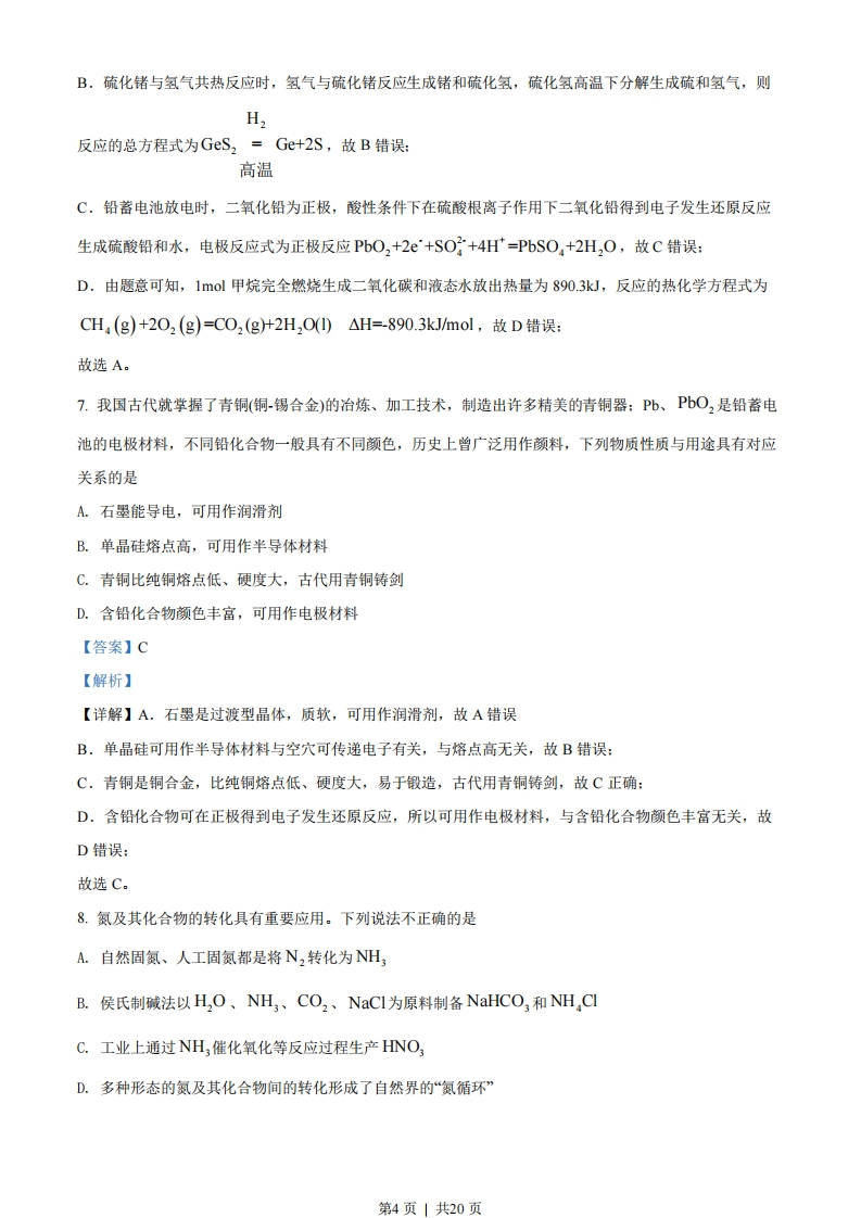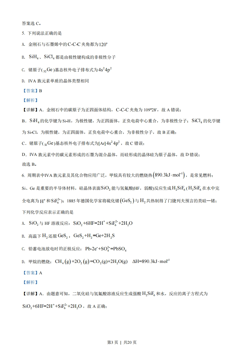 O),故B错误:C.同周期从左往右第一电离能呈增大趋势,同主族从上往下第一电离能呈减小趋势,故电离能大小为I(O)>I(Na),故c错误:D.元素金属性越强,其最高价氧化物对应水化物的碱性越强,故碱性强弱为NOH>Al(OH)3,故D错误:故选A。4.实验室制取少量SO2水溶液并探究其酸性,下列实验装置和操作不能达到实验目的的是60%硫酸NaHSO,(s)饱和NaHSO,(aq):ga982甲丙A.用装置甲制取SO2气体B.用装置乙制取SO2水溶液C.用装置丙吸收尾气中的SO2D.用干燥pH试纸检验SO2水溶液的酸性【答案】C【解析】【详解】A.60%硫酸和NaHS03(s)可发生反应:HSO4+2 NaHSO3=Na2S04+2SO2↑+2H20,因此装置甲可以制取SO2气体,A正确:B.气体通入液体时“长进短处”,装置乙可以制取SO2水溶液,B正确:C.SO2不会与饱和NaHSO3溶液发生反应,因此装置丙不能吸收尾气中的SO2,C错误:D.SO2水溶液显酸性,可用干燥的pH试纸检验其酸性,D正确:第2页1共20页答案选C。5.下列说法正确的是A.金刚石与石墨烯中的C-CC夹角都为120B.SiH4、SiCl4都是由极性键构成的非极性分子C.锗原子(32Ge)基态核外电子排布式为4s24p2D.IVA族元素单质的晶体类型相同【答案】B【解析】【详解】A.金刚石中的碳原子为正四面体结构,C-C-C夹角为10928',故A错误:B.SH,的化学键为SiH,为极性键,为正四面体,正负电荷中心重合,为非极性分子:SiCl,的化学键为S-C1,为极性键,为正四面体,正负电荷中心重合,为非极性分子,故B正确:C.锗原子(Ge)基态核外电子排布式为Ar4s24p2,故C错误:D,VA族元素中的碳元素形成的石墨为混合晶体,而硅形成的晶体硅为原子晶体,故D错误:故选B。6.周期表中IVA族元素及其化合物应用广泛,甲烷具有较大的燃烧热(890.3kJmo),是常见燃料:Si、Ge是重要的半导体材料,硅晶体表面SiO2能与氢氟酸HF,弱酸)反应生成H2SiF6(H,S正。在水中完全电离为H和S):1885年德国化学家将硫化锗(GS2)与H2共热制得了门捷列夫预言的类硅一锗:下列化学反应表示正确的是A.SiO2与HF溶液反应:SiO,+6HF=2H+Si正+2H,OB.高温下H2还原GeS2:GeS2+H=Ge+2H,SC.铅蓄电池放电时的正极反应:Pb-2e+SO子=PbSO。D.甲烷的燃烧:CH4(g)+202(g)=C0,(g)+2H,O(g)△H=890.3kJ·mol【答案】A【解析】【详解】A.由题意可知,二氧化硅与氢氟酸溶液反应生成强酸H,S正。和水,反应的离子方程式为SiO,+6HF=2H+Si正2+2H,0,故A正确:第3页|共20页