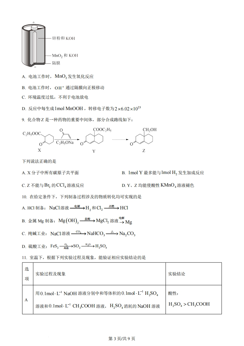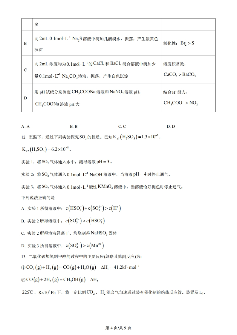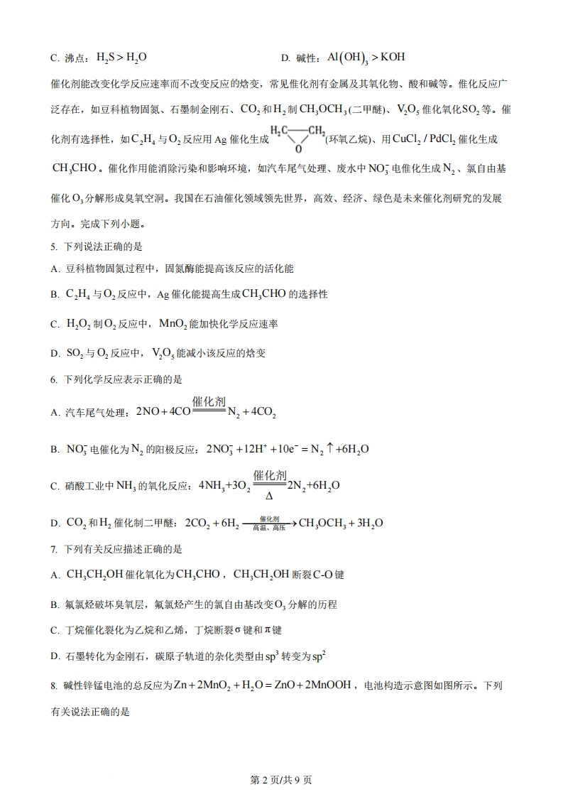 江苏省2024年普通高中学业水平选择性考试化学限时75分钟满分100分可能用到的相对原子质量:H一1B一11C一12N一140一16C一35.5Cr52Fe一56Ag-108Nd-144一、单项选择题:共13题,每题3分,共39分。每题只有一个选项最符合题意。1.我国探月工程取得重大进展。月壤中含有Ca、Fe等元素的磷酸盐,下列元素位于元素周期表第二周期的是A.0B.PC.CaD.Fe2.反应PbS+4H,02=PbS0,+4H,0可用于壁画修复。下列说法正确的是A.S2的结构示意图为B.H,O2中既含离子键又含共价键C.SO中S元素的化合价为+6D.HO的空间构型为直线形3.实验室进行铁钉镀锌实验。下列相关原理、装置及操作不正确的是ABCD水2mol-LNaOH水盐酸锌片铁钉ZnCl2NaOH溶液固体配制NaOH溶铁钉除油污铁钉除锈铁钉镀锌液A.AB.BC.CD.D4.明矾KA1(SO)2·12H,O可用作净水剂。下列说法正确的是A.半径:r(AI))>r(K)B.电负性:x(O)>x(S)第1页共9页C.沸点:H,S>H,OD.碱性:A(OH),>KOH催化剂能改变化学反应速率而不改变反应的焓变,常见准化剂有金属及其氧化物、酸和碱等。准化反应广泛存在,如豆科植物固氮、石墨制金刚石、CO2和H2制CH,OCH3(二甲醚)、V,O,准化氧化SO2等。催化剂有选择性,如C2H,与O2反应用Ag催化生成(环氧乙烷)、用CuCl2/PdCl2催化生成0CH,CHO。催化作用能消除污染和影响环境,如汽车尾气处理、废水中NO5电雁化生成N,、氯自由基催化O,分解形成臭氧空洞。我国在石油催化领域领先世界,高效、经济、绿色是未来催化剂研究的发展方向。完成下列小题。5.下列说法正确的是A.豆科植物固氮过程中,固氮酶能提高该反应的活化能B.C,H,与O2反应中,Ag催化能提高生成CH CHO的选择性C.H2O2制O2反应中,MnO2能加快化学反应速率D.SO2与O2反应中,V,O,能减小该反应的焓变6.下列化学反应表示正确的是催化剂A.汽车尾气处理:2NO+4CON,+4C0,B.NO5电催化为N,的阳极反应:2NO5+12H+10e=N,个+6H,O催化剂C.硝酸工业中NH3的氧化反应:4NH,+3O,N,+6H,OD.C0,和H,催化制二甲酷:2002+6H,"→CH,0CH,+3H,07.下列有关反应描述正确的是A.CH,CH2OH催化氧化为CH,CHO,CH,CH,OH断裂C-O键B.氟氯烃破坏臭氧层,氟氯烃产生的氯自由基改变O,分解的历程C.丁烷催化裂化为乙烷和乙烯,丁烷断裂σ键和π键D.石墨转化为金刚石,碳原子轨道的杂化类型由Sp3转变为Sp8.碱性锌锰电池的总反应为Zn+2MnO2+H,O=ZnO+2 MnOOH,电池构造示意图如图所示。下列有关说法正确的是第2页共9页锌粉和KOHMnO2和KOH隔膜A.电池工作时,MnO2发生氧化反应B.电池工作时,OH~通过隔膜向正极移动C.环境温度过低,不利于电池放电D.反应中每生成1 mol Mnc0OH,转移电子数为2×6.02×10239.化合物Z是一种药物的重要中间体,部分合成路线如下:COOCHsCHOHC,HOOC…0C2HsONaX下列说法正确的是A.X分子中所有碳原子共平面B.Imol Y最多能与Imol H2发生加成反应C.Z不能与Br2的CC14溶液反应D.Y、Z均能使酸性KMnO,溶液褪色10.在给定条件下,下列制备过程涉及的物质转化均可实现的是A.HC制备:NaCI溶液电解→H,和CL,点悠→HCB.金属Me制备:Mg(OH。盟MgCL溶液MEC.纯碱工业:NaC1溶液co→NaHCO,△→Na,CO)D.硫酸工业:FeS,→SO2eH,SO411.室温下,根据下列实验过程及现象,能验证相应实验结论的是选实验过程及现象实验结论项用0.1mol.L1NaOH溶液分别中和等体积的0.lmol.LH,SO,酸性:溶液和0.lmol.LCH,COOH溶液,H,SO,消耗的NaOH溶液H,SO,CH,COOH第3页共9页