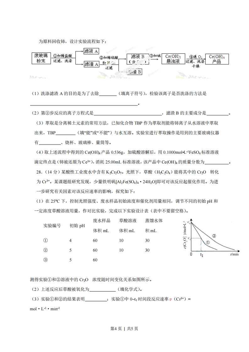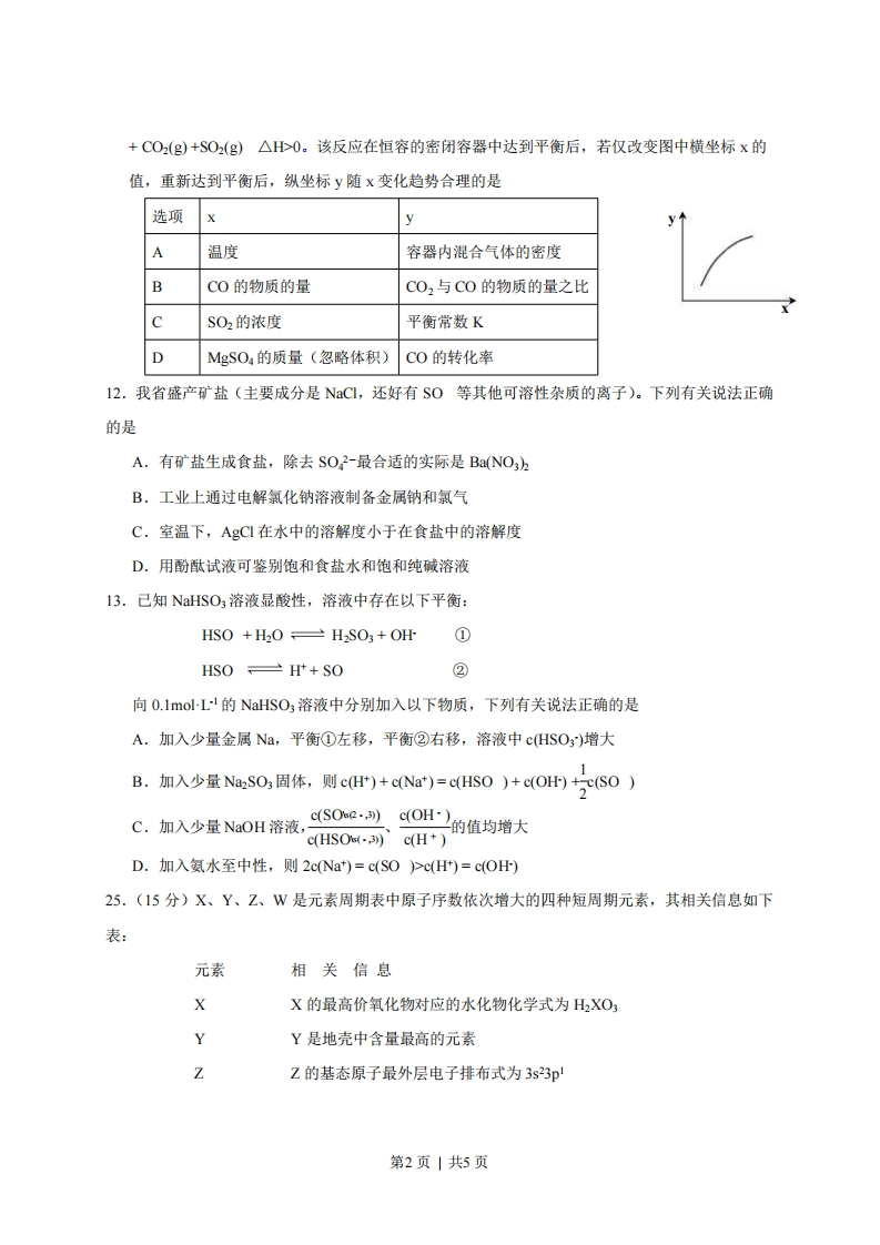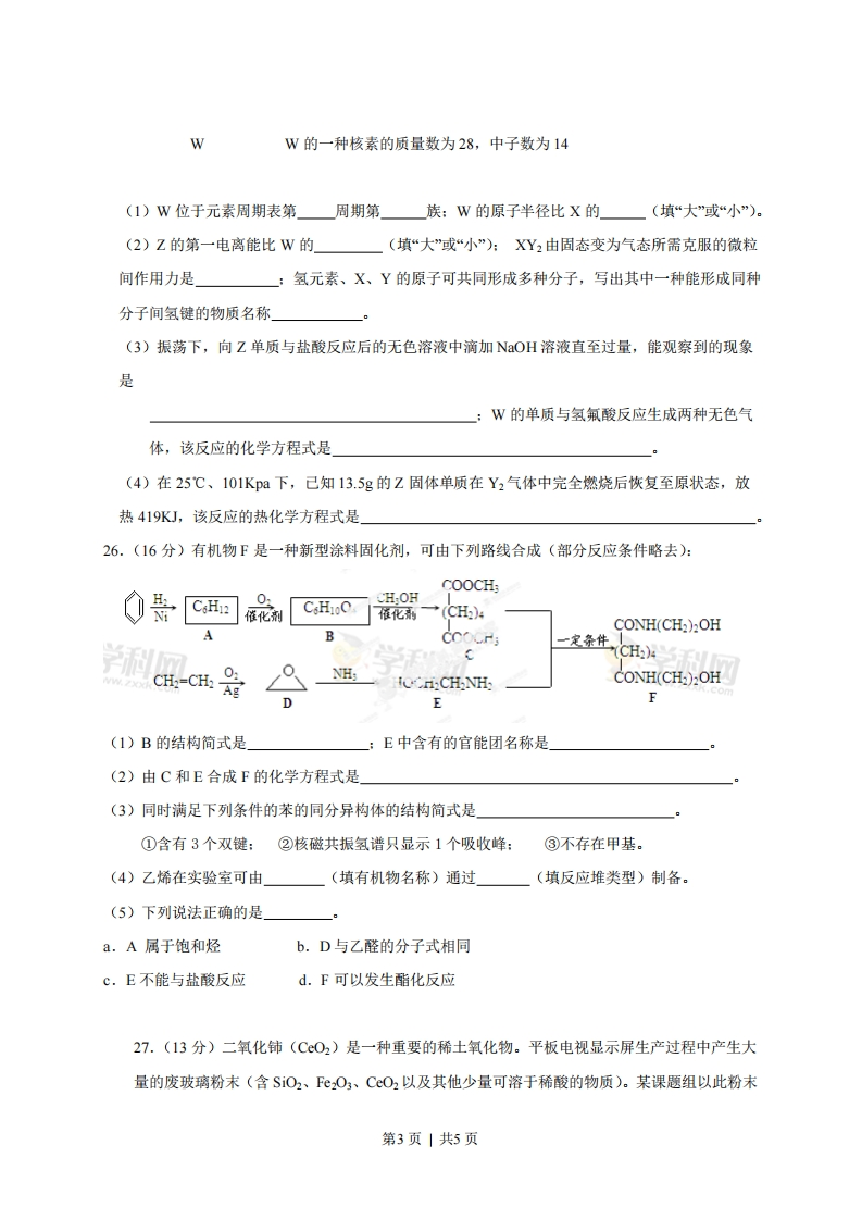 2013年普通高等学校招生全国统一考试(安徽卷】理科综合能力试化学实公7.我国科学家研制出一中催化剂,能在室温下高效催化空气中甲醛的氧化,其反应如下:催化剂」HCHO+O2CO2+H2O。下列有关说法正确的是A.该反应为吸热反应B.CO2分子中的化学键为非极性键C.HCHO分子中既含o键又含π键D.每生成1.8gH20消耗2.24L028.实验室中某些气体的制取、收集及尾气处理装置如图所示(省略夹持和净化装置)。仅用此装置和表中提供的物质完成相关实验,最合理的选项是选项a中的物质b中的物质c中收集的气体d中的物质A浓氨水CaONH;H2OB浓硫酸Na2SO3S02NaOH溶液C稀硝酸CuNO2H20D浓盐酸MnO2CkNaOH溶液9.下列分子或离子在指定的分散系中能大量共存的一组是A.银氨溶液:Na、K+、NO2、NHH2OB.空气:C2H2、CO2、SO2、NOC.氢氧化铁胶体:H、K+、S2、BD.高锰酸钾溶液:H、Na、SO2-、葡萄糖分子10.热激活电池可用作火箭、导弹的工作电源。一种热激活电池的基本结构如图所示,其中作为电解质的无水LiCI-KCI混合物受热熔融后,电池即可瞬间输出电能。硫酸铅电极该电池总反应为:PbSO+2LiC+Ca=CaCl2+Li2SO+Pb。无水LiC-KCI下列有关说法正确的是钙电极电池壳A.正极反应式:Ca+2C--2e-=CaCl2B.放电过程中,Lt向负极移动C.没转移0.1mol电子,理论上生成20.7gPbD.常温时,在正负极间接上电流表或检流计,指针不偏转11.一定条件下,通过下列反应可以制备特种陶瓷的原料Mg0,MgsO3(s)+COg)MgOs)第1页|共5页+CO2(g)+SO2(g)△H>0。该反应在恒容的密闭容器中达到平衡后,若仅改变图中横坐标x的值,重新达到平衡后,纵坐标y随x变化趋势合理的是选项yA温度容器内混合气体的密度BC0的物质的量C02与C0的物质的量之比CSO2的浓度平衡常数KDMgSO4的质量(忽略体积)C0的转化率12.我省盛产矿盐(主要成分是NaCl,还好有SO等其他可溶性杂质的离子)。下列有关说法正确的是A.有矿盐生成食盐,除去SO2-最合适的实际是BaNO3hB.工业上通过电解氯化钠溶液制备金属钠和氯气C.室温下,AgCI在水中的溶解度小于在食盐中的溶解度D.用酚酞试液可鉴别饱和食盐水和饱和纯碱溶液13.己知NaHSO3溶液显酸性,溶液中存在以下平衡:HSO +H2OH2SO+OH①HSO H+SO②向0.1molL1的NaHSO3溶液中分别加入以下物质,下列有关说法正确的是A.加入少量金属Na,平衡①左移,平衡②右移,溶液中cHSO3)增大B.加入少量NaSO固体,则c)+cNa)=cHS0)+c(O+与S0)C.加入少量NaOH溶液,c(SOse,3)c(OH-的值均增大c(HSOs(-,3))c(H+)D.加入氨水至中性,则2cNa)=c(SO)>(H)=c(OH)25.(15分)X、Y、Z、W是元素周期表中原子序数依次增大的四种短周期元素,其相关信息如下表:元素相关信息XX的最高价氧化物对应的水化物化学式为H2XO3YY是地壳中含量最高的元素ZZ的基态原子最外层电子排布式为3s23pl第2页|共5页红W的一种核素的质量数为28,中子数为14(1)W位于元素周期表第」周期第族:W的原子半径比X的一(填“大”或“小”)。(2)Z的第一电离能比W的(填“大”或“小”):XY2由固态变为气态所需克服的微粒间作用力是氢元素、X、Y的原子可共同形成多种分子,写出其中一种能形成同种分子间氢键的物质名称(3)振荡下,向Z单质与盐酸反应后的无色溶液中滴加NOH溶液直至过量,能观察到的现象是W的单质与氢氟酸反应生成两种无色气体,该反应的化学方程式是(4)在25℃、101Kpa下,己知13.5g的Z固体单质在Y2气体中完全燃烧后恢复至原状态,放热419KJ,该反应的热化学方程式是26.(16分)有机物F是一种新型涂料固化剂,可由下列路线合成(部分反应条件略去):COOCH:0CHOH催化剂CoH10C催化雨一(CH)4CONH(CH2)2OH一定条件(CH2)CH2-CH:AgNHOrCH:NH:CONH(CH2)2OHD(1)B的结构简式是E中含有的官能团名称是(2)由C和E合成F的化学方程式是(3)同时满足下列条件的苯的同分异构体的结构简式是①含有3个双键:②核磁共振氢谱只显示1个吸收峰:③不存在甲基。(4)乙烯在实验室可由(填有机物名称)通过(填反应堆类型)制备。(5)下列说法正确的是a.A属于饱和烃b.D与乙醛的分子式相同c.E不能与盐酸反应d.F可以发生酯化反应27.(13分)二氧化铈(C02)是一种重要的稀土氧化物。平板电视显示屏生产过程中产生大量的废玻璃粉末(含SiO2、F©O3、CeO2以及其他少量可溶于稀酸的物质)。某课题组以此粉末第3页|共5页