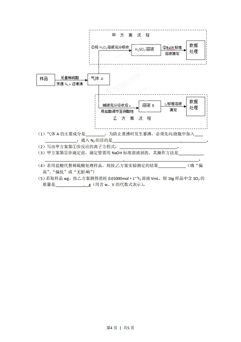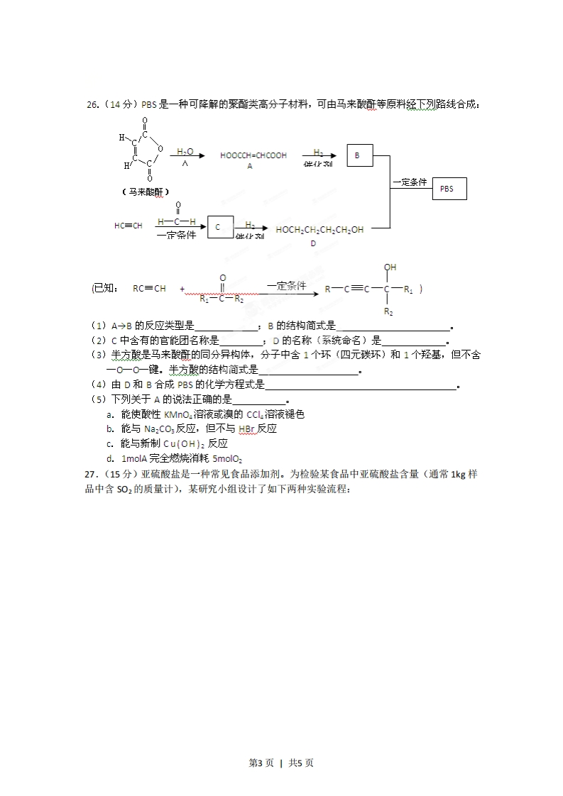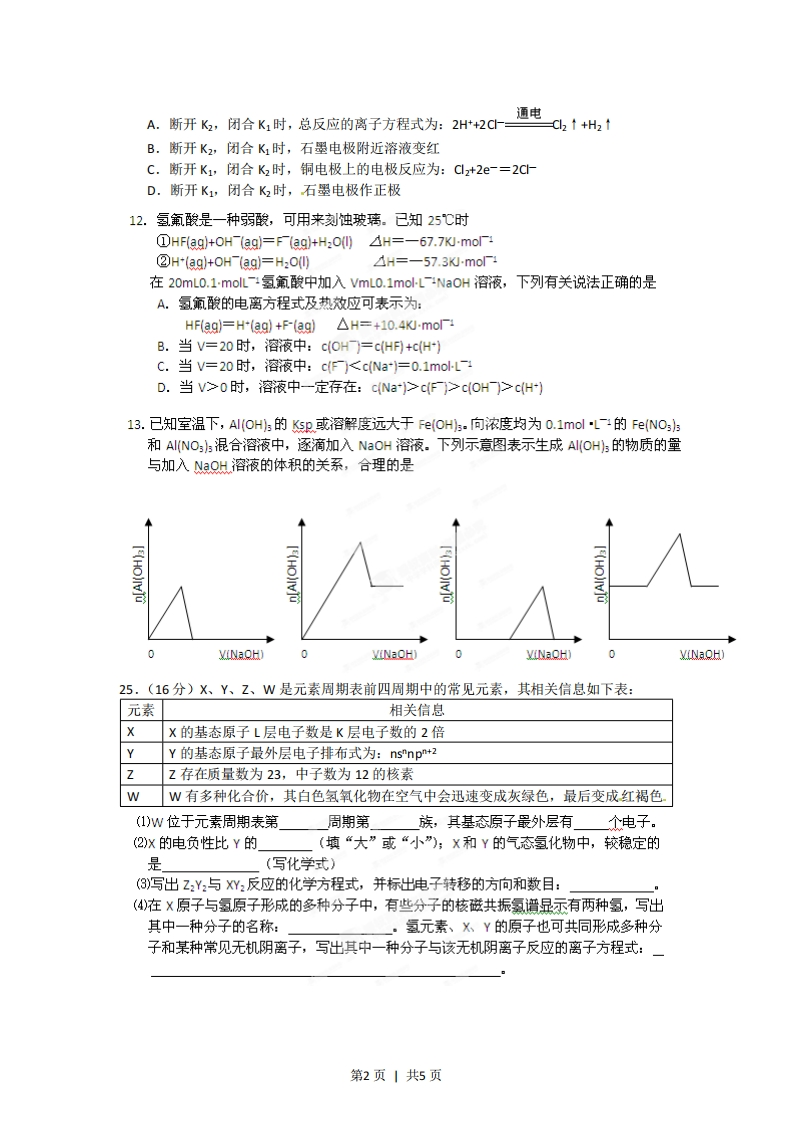 2012年普通高等学校招生全国统一考试(安徽卷)理综化学7.科学家最近研究出一种环保、安全的储氢方法,其原理可表示为:N3HCO,值氢HCOONa+H,0下列有关说法正确的是释氨A.储氢、释氢过程均无能量变化B.NaHCO:、HC0Qya均含有离子键和共价键C.储氢过程中,NaHCO:被氧化D.释氨过程中,每消耗0.1molH20放出2.24L的H28.下列离子或分子在溶液中能大量共存,通入C02后仍能大量共存的一组是A.Kt、Nat、C-、NO3-B.Kt、Nat、Br-、SiO32C.H+、Fe2+、S042-、ClD.Kt、Ag、NH3·Hz0、NO39.一定条件下,通过下列反应可实现燃煤烟气中疏的回收:准化剂S02(g+2c0g)2C02g+S0H<0若反应在恒容的密闭容器中进行,下列有关说法正确的是A.平衡前,随着反应的进行,容器内压强始终不变B.平衡时,其他条件不变,分离出硫,正反应速率加快C.平衡时,其他条件不变,升高温度可提高$0z的转化率D.其他条件不变,使用不同催化剂,该反应平衡常数不变10.仅用下表提供的玻璃容器(非玻璃容器任选)就能实现相应实验目的的是选项实验目的玻璃容器A分离乙醇和乙酸乙酯的混合物分液漏斗、烧杯用pH=1的盐酸配置100mL,pH=2的B盐酸100ml容量瓶、烧杯、玻璃棒、胶头滴管用溴水、淀粉一1溶液比较Br,与,的氧化性强弱试管、胶头滴管用NH,CI固体和Ca(OH)z固体制备并酒精灯、烧杯、导管、集气瓶收集NH11.某兴趣小组设计如下微型实验装置。实验时,现断开K2,闭合K1,两极均有气泡产生:一段时间后,断开K1,闭合K2,发现电流表指针偏转,下列有关描述正确的是直流电源A石墨含酚酞的饱和食盐水第1页1共5页A.断开K2,闭合K1时,总反应的离子方程式为:2H+2C=通电C2↑+H2tB.断开K2,闭合K1时,石墨电极附近溶液变红C.断开K1,闭合K2时,铜电极上的电极反应为:Cz+2e-=2CD.断开K1,闭合K2时,石墨电极作正极12.氢氟酸是一种弱酸,可用来刻蚀玻璃。已知25℃时①HFag+0Haq=FFag+HzO0△H=-67.7Kmo②H*(aq+oH(ag=H2o0△H=-57.3Kmo1在20mL0.1mol氢氟酸中加入VmL0.1 mol-L--Na0H溶液,下列有关说法正确的是A.氢氟酸的电离方程式及热效应可表示为:HFag=Hag)+fag)△H=+10.4KWmo厂B.当V=20时,溶液中:c(OH=cHF+cH)C.当V=20时,溶液中:c0时,溶液中一定存在:cNa>c>cO>cH)13.已知室温下,Al(OH:的sp或溶解度远大于Fe(OHs.向浓度均为0.1molL1的FeNO33和AI(NO3混合溶液中,逐滴加入NaOH溶液。下列示意图表示生成AI(OH的物质的量与加入aQ以溶液的体积的关系,合理的是VINaOH)0VINaOH)VINaOH)YiNaOH)25.(16分)X、Y、Z、W是元素周期表前四周期中的常见元素,其相关信息如下表:元素相关信息X的基态原子L层电子数是K层电子数的2倍YY的基态原子最外层电子排布式为:nsnp*2ZZ存在质量数为23,中子数为12的核素WW有多种化合价,其白色氢氧化物在空气中会迅速变成灰绿色,最后变成红褐色(1)w位于元素周期表第周期第族,其基态原子最外层有个电子。(2)x的电负性比Y的(填“大”或“小”);X和Y的气态氢化物中,较稳定的是(写化学式)(③)写出Z2Y:与XY2反应的化学方程式,并标出电子转移的方向和数目:(4)在X原子与氢原子形成的多种分子中,有些分子的核磁共振氯谱显示有两种氢,写出其中一种分子的名称:氢元素、XY的原子也可共同形成多种分子和某种常见无机阴离子,写出其中一种分子与该无机阴离子反应的离子方程式:第2页丨共5页26.(14分)PBS是一种可降解的聚酯类高分子材料,可由马来酸等原料经下列路线合成:0HOOCCH-CHCOOHH:H蚀化利一定条件(马来酸班)PBS9HC≡CHH一C-H一定条件H→HOCH2CH2CH2CH2OH供业OH0已知:RC=CH一定条件,R一C=C一C一R:)R2(1)A→B的反应类型是:B的结构简式是(2)C中含有的官能团名称是;D的名称(系统命名)是(3)半方酸是马来酸的同分异构体,分子中含1个环(四元碳环)和1个羟基,但不含一0一0一键。半方酸的结构简式是(4)由D和B合成PBS的化学方程式是(5)下列关于A的说法正确的是a.能使酸性KMnO:溶液或溴的CCL,溶液褪色b.能与NaCQ:反应,但不与Br反应c.能与新制Cu(OH)2反应d.1molA完全燃烧消耗5mol0:27.(15分)亚硫酸盐是一种常见食品添加剂。为检验某食品中亚硫酸盐含量(通常1kg样品中含S02的质量计),某研究小组设计了如下两种实验流程:第3页1共5页
