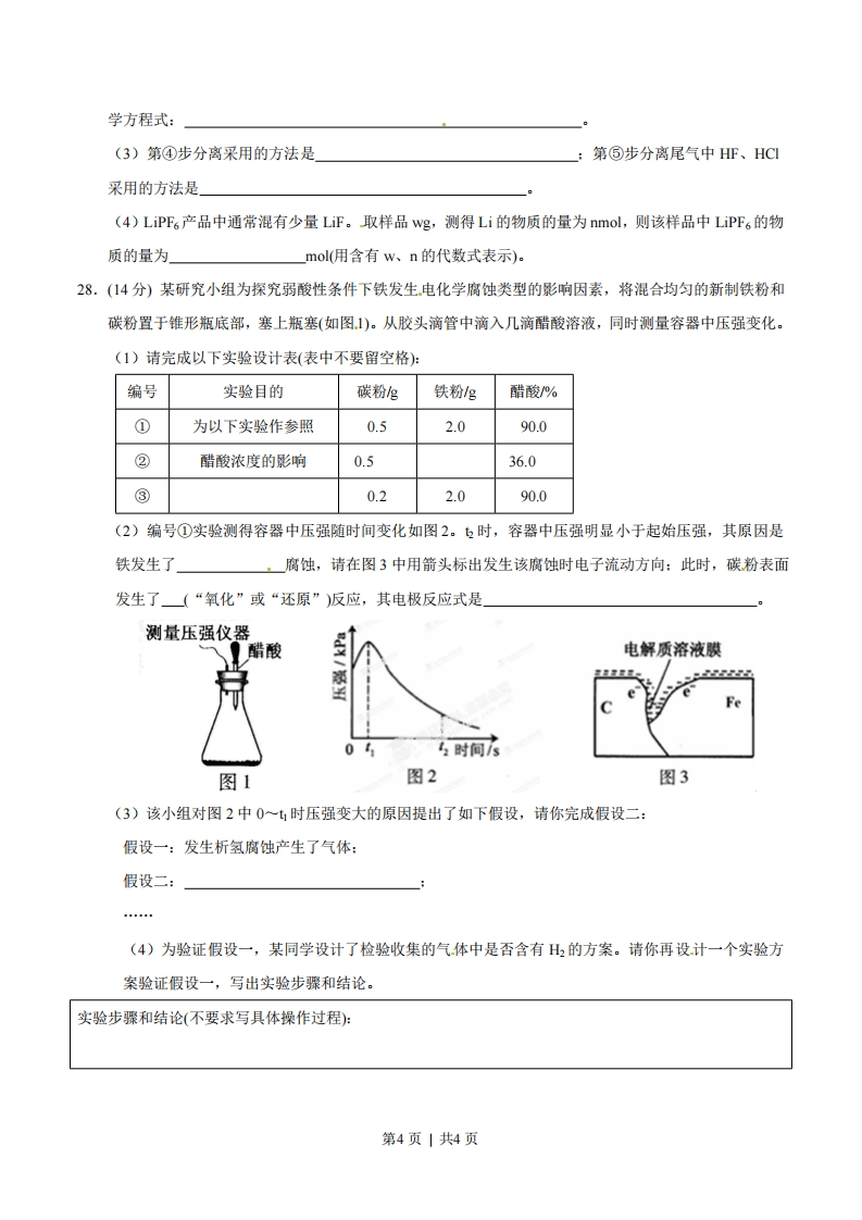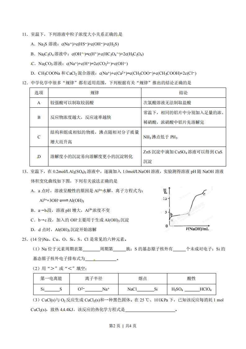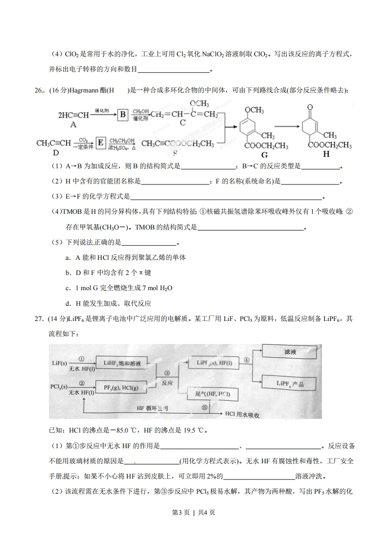 2014年普通高等学校招生全国统一考试(安徽卷)理科综合能力浏斌化学部分7.CO2的的资源化利用是解决温室效应的重要途径。以下是在一定条件下用NH3捕获CO2生成重要化工产OH品三聚氰胺的反应:NH3+CO2→+HO。下列有关三聚氰胺的说法正确的是HON OHA.分子式为C3H6NO3B.分子中既含极性键,又含非极性键C.属于共价化合物D.生成该物质的上述反应为中和反应8.下列有关FeSO4方溶液的叙述正确的是A.该溶液中K+、Fe2+、CHOH、Br-可以大量共存B.和KI溶液反应的离子方程式:Fe3++2-=Fe2++L2C.和Ba(OH2溶液反应的离子方程式:Fe3++SO2-+Ba2++3OH=Fe(OD3↓+BaSO4↓D.1L0.1mol·L-1该溶液和足量的Zn充分反应,生成112gFe9.为实现下列实验目的,依据下表提供的主要仪器,所用试剂合理的是选项实验目的主要仪器试剂分离Br2和CCl4混合物分液漏斗、烧杯Br2和CCl4混合物、蒸馏水B鉴别葡萄糖和蔗糖试管、烧杯、酒精灯葡萄糖溶液、蔗糖溶液、银氨溶液实验室制取H2试管、带导管的橡皮塞锌粒、稀HNO3D测定NaOH溶液浓度滴定管、锥形瓶、烧杯NaOH溶液,0.1000mol/L盐酸10.臭氧是理想的烟气脱硝剂,其脱硝反应为:2NO2(gO3(g)三N2Os(g)+O2(g),反应在恒容密闭容器中进行,下列由该反应相关图像作出的判断正确的是BCD61.02N0,8)+C,0.40,g+0,(3时间s时间反应过程升高温度,平衡常数减小0-3s内,反应速率为:时仅加入催化剂,平衡达平衡时,仅改变x,vN02)=0.2mol-L1正向移动则x为c(O)第1页|共4页11.室温下,下列溶液中粒子浓度大小关系正确的是A.NaS溶液:cNa+)>cHS-Pc(OH-Pc(HS)B.NaCz04溶液中:c(OH-)-cH+Hc(HCO4-)+2c(HCO4)C.NazCO3溶液:cNa+)+c(H+)=2c(CO32-Hc(OH-)D.CH COONa和CaC2混合溶液:cNa+)tc(Ca2+)=c(CHCOO-tc(CH;COOH+2c(C-)12.中学化学中很多“规律”都有适用范围,下列根据有关“规律”推出的结论正确的是选项规律结论A较强酸可以制取较弱酸次氯酸溶液无法制取盐酸常温下,相同的铝片中分别加入足量的浓、B反应物浓度越大,反应速率越快稀硝酸,浓硝酸中铝片先溶解完结构和组成相似的物质,沸点随相对分子质量CNH3沸点低于PH3增大而升高ZnS沉淀中滴加CuSO4溶液可以得到CuSD溶解度小的沉淀易向溶解度更小的沉淀转化沉淀13.室温下,在0.2mol/LAlz(SO)3溶液中,逐滴加入1.0mol/LNaOH溶液,实验测得溶液pH随NaOH溶液体积变化曲线如下图,下列有关说法正确的是A.a点时,溶液呈酸性的原因是AI3+水解,离子方程式为:Al3++30HAl(OH)310B.a→b段,溶液pH增大,AI+浓度不变C.b→c段,加入的OH主要用于生成AI(OH3沉淀D.d点时,AI(OH)方沉淀开始溶解VNaOH/mL25.(14分)Na、Cu、O、Si、S、Cl是常见的六种元素.(1)Na位于元素周期表第周期第族:S的基态原子核外有个未成对电子:Si的基态原子核外电子排布式为(2)用“>”或“<”填空:第一电离能离子半径熔点酸性SiS02-Na+NaCl5H2SOHCIO(3)CuCl(s)与O2反应生成CuCl2(s)和一种黑色固体。在25℃、101KPa下,己知该反应每消耗1molCuCl(s),放热44.4K」,该反应的热化学方程式是第2页|共4页(4)CO2是常用于水的净化,工业上可用C2氧化NaCIo2溶液制取ClO2。写出该反应的离子方程式,并标出电子转移的方向和数目26.(16分)Hagrmann酯(H)是一种合成多环化合物的中间体,可由下列路线合成(部分反应条件略去):OCH2HCECH-化剂BCHOH.CH2=CH-C=CH催化ACCH3CH3CHC-CHE CHCHOHCH C=CCOOCHCH浓HS04,△COOCH2CH3COOCHCH3DGH(1)A→B为加成反应,则B的结构简式是B→C的反应类型是(2)H中含有的官能团名称是:F的名称(系统命名)是(3)E→F的化学方程式是(4)TMOB是H的同分异构体,具有下列结构特征①核磁共振氢谱除苯环吸收峰外仅有1个吸收峰②存在甲氧基(CHO一)。TMOB的结构简式是(5)下列说法正确的是a.A能和HCl反应得到聚氯乙烯的单体b.D和F中均含有2个r键c.1molG完全燃烧生成7molH20d.H能发生加成、取代反应27.(14分LPF6是锂离子电池中广泛应用的电解质。某工厂用LiF、PCl5为原料,低温反应制备LiPF6,其流程如下:滤液①LiF(s)LH亚,饱和溶液LiP到s).HF(I)④无水HF(①PCI,(s)②反应LPF,产品无水HF()PF,(g),HCI(g)尾气HE,HC)HF循环使用⑤HC1用水吸收己知:HC1的沸点是-85.0℃,HF的沸点是19.5℃。(1)第①步反应中无水HF的作用是。反应设备不能用玻璃材质的原因是(用化学方程式表示)。无水HF有腐蚀性和毒性,工厂安全手册提示:如果不小心将HF沾到皮肤上,可立即用2%的溶液冲洗。(2)该流程需在无水条件下进行,第③步反应中PC5极易水解,其产物为两种酸,写出PF5水解的化第3页|共4页