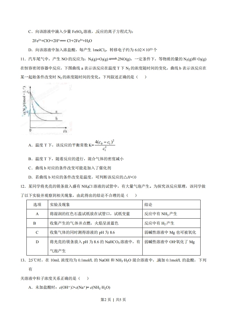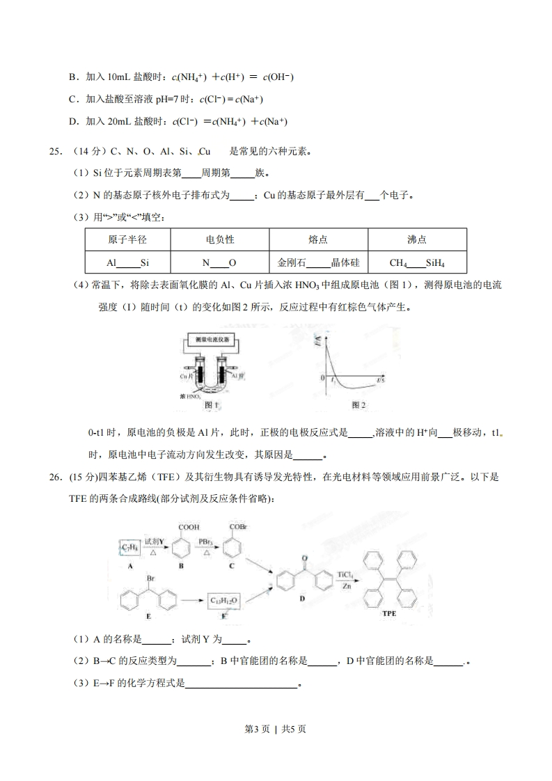 2015年普通高等学校招生全国统一考试(安徽卷)理科综合能力测试化学试题7.碳酸亚乙烯是锂离子电池低温电解液的重要添加剂,其结构如下图。下列有关该物质的说法正确的是()A.分子式为C3HO3B.分子中含6个0键C.分子中只有极性键D.8.6g该物质完全燃烧得到6.72LC0,8.下列有关实验的选项正确的是()A.配制0.10mo/LB.除去C0中的CO2C.苯萃取碘水中的2D.记录滴定终点NaOH溶液分出水层后的操作读数为12.20mLC0(002)接干燥装哥NaOH溶液,含12的苯洛液NaOH(s)9.下列有关说法正确的是()A.在酒精灯加热条件下,NaCO3、NaHCO3固体都能发生分解B.e(OH田3胶体无色、透明,能发生丁达尔现象C.H2、SO2、CO2三种气体都可用浓硫酸干燥D.SO2既能和氢氧化钠溶液反应也能和氢氟酸反应,所以是两性氧化物10.下列有关NaCIO和NaCl混合溶液的叙述正确的是(·)A.该溶液中,H、NH*、SO2、Br可以大量共存B.该溶液中,Ag*、K+、NO、CH:CHO可以大量共存第1页|共5页C.向该溶液中滴入少量FSO,溶液,反应的离子方程式为:2Fe2++ClO+2H+=Cl-+2Fe3++H2OD.向该溶液中加入浓盐酸,每产生1 molCI2,转移电子约为6.02×1023个11.汽车尾气中,产生NO的反应为:N(g)+O(g)=2NO(g),一定条件下,等物质的量的N2(g)和O(g)在恒容密闭容器中反应,下图曲线a表示该反应在温度T下N2的浓度随时间的变化,曲线b表示该反应在某一起始条件改变时N2的浓度随时间的变化。下列叙述正确的是()作A温度T下,该反应的平衡常数K=4c。二G户cB.温度T下,随着反应的进行,混合气体的密度减小C.曲线b对应的条件改变可能是加入了催化剂D.若曲线b对应的条件改变是温度,可判断该反应的△H<012.某同学将光亮的镁条放入盛有NHCI溶液的试管中,有大量气泡产生。为探究该反应原理,该同学做了以下实验并观察到相关现象,由此得出的结论不合理的是()选项实验及现象结论Y将湿润的红色石蕊试纸放在试管口,试纸变蓝反应中有NH产生B收集产生的气体并点燃,火焰呈淡蓝色反应中有H2产生C收集气体的同时测得溶液的pH为8.6弱碱性溶液中Mg也可被氧化D将光亮的镁条放入pH为8.6的NaHCO3溶液中,有弱碱性溶液中OH氧化了Mg气泡产生13.25℃时,在10mL浓度均为0.1mol/L的NaOH和NH3H20混合溶液中,滴加0.1mol/L的盐酸,下列有关溶液中粒子浓度关系正确的是()A.未加盐酸时:c(OH-)>cNa+FcNH3HO)第2页|共5页B.加入10mL盐酸时:c(NH+)+cH+)=c(OH-)C.加入盐酸至溶液pH=7时:c(C)=cNa+)D.加入20mL盐酸时:c(CI-)=cNH+)+cNa+)25.(14分)C、N、O、Al、Si、Cu是常见的六种元素。(1)Si位于元素周期表第周期第族。(2)N的基态原子核外电子排布式为:Cu的基态原子最外层有个电子。(3)用”或“<”填空:原子半径电负性熔点沸点Al SiNO金刚石晶体硅SiHa(4)常温下,将除去表面氧化膜的A、Cu片插入浓HNO3中组成原电池(图1),测得原电池的电流强度(I)随时间(t)的变化如图2所示,反应过程中有红棕色气体产生。餐量电范收容79图t图20-t1时,原电池的负极是A1片,此时,正极的电极反应式是,溶液中的H向极移动,t1时,原电池中电子流动方向发生改变,其原因是」26.(15分)四苯基乙烯(TFE)及其衍生物具有诱导发光特性,在光电材料等领域应用前景广泛。以下是T℉E的两条合成路线(部分试剂及反应条件省略):试制YC.H(1)A的名称是:试剂Y为。(2)BC的反应类型为:B中官能团的名称是,D中官能团的名称是(3)E→F的化学方程式是第3页|共5页