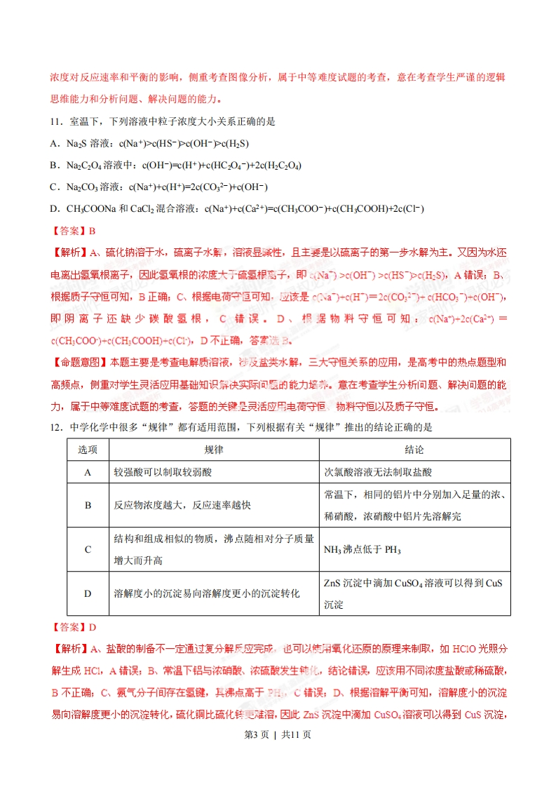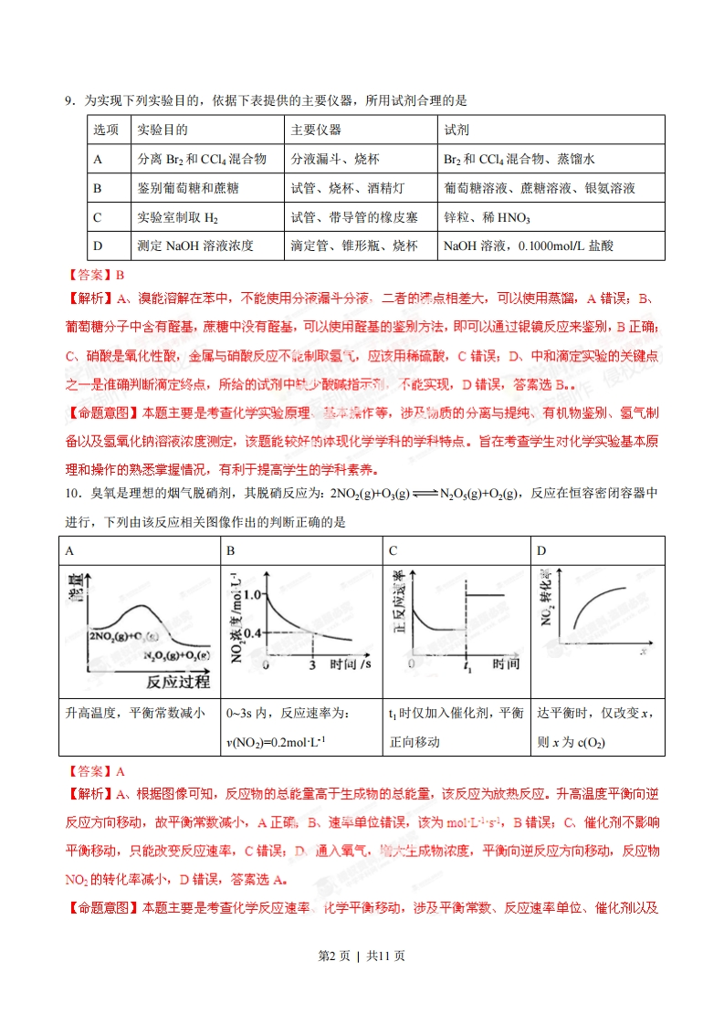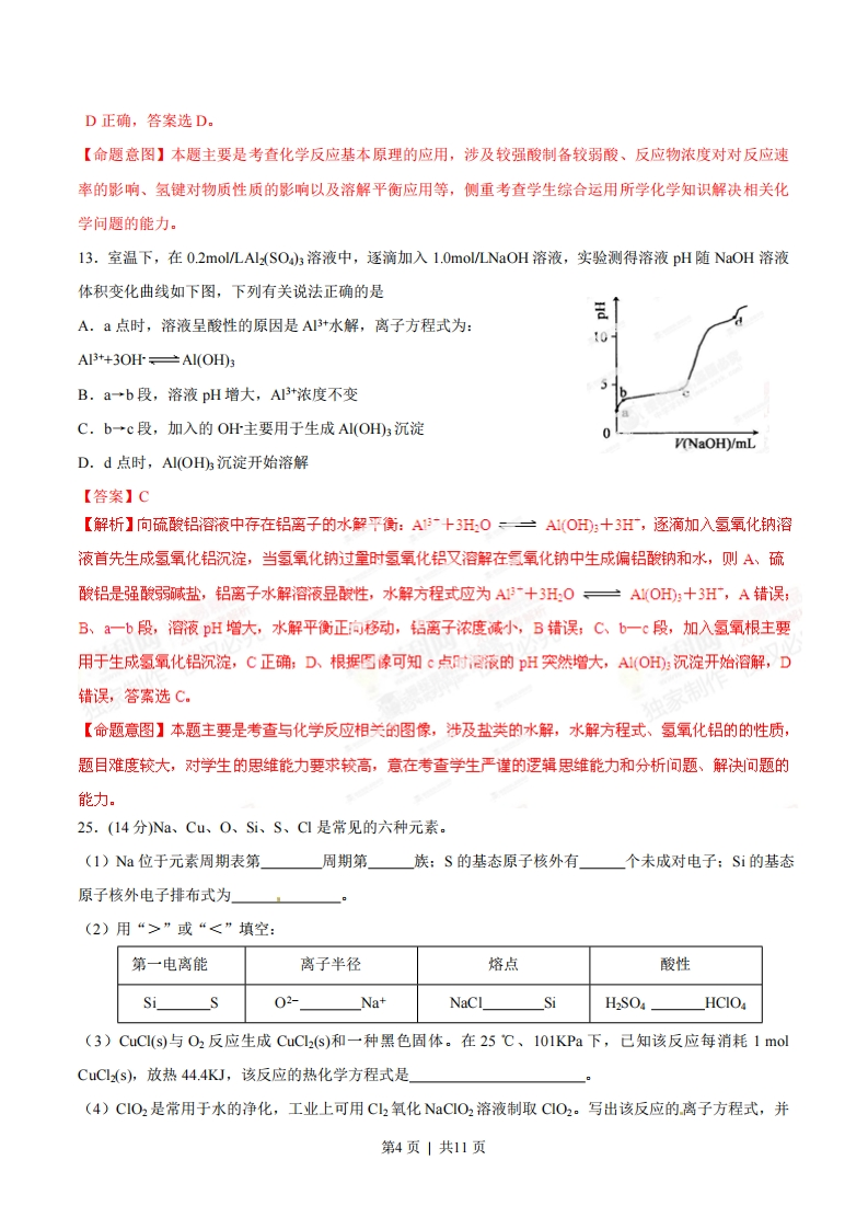 2014年普通高等学校招生全国统一考试(安微卷)理科综合能力测试化学部分7.CO2的的资源化利用是解决温室效应的重要途径。以下是在一定条件下用NH3捕获CO2生成重要化工产OH品三聚氰胺的反应:NHCO2→+HO。下列有关三聚氰胺的说法正确的是HOOHA.分子式为CH6NO3B.分子中既含极性键,又含非极性键C.属于共价化合物D.生成该物质的上述反应为中和反应【答案】C【解析】A、根据三聚胺的结构简式可知和碳原子的4个价电子可知,其分子式为C:H:NO:,A错误;B、由同一种非金属元素组成的化学键是非极性键,由不同种非金属元素组成的化学键是极性键,该分子中没有非极性键,全部是极性键,B错误;C、全部由共价键形成的化合物是共价化合物,因此三聚氰胶是共价化合物,C正确:D、酸与碱反应生成盐和水的反应是中和反应,该反应不是中和反应,中,D不正确,答案爱信C。【命题意图】本题主要是考查化学与$T$、基本概念、物质结构,涉及分子式、化学键、化合物以及中和反应判断等,意在考查学生对基本概念以及灵活应用基础知识解决实际问题的能力,有利于培养学生的学科素养。8..下列有关Fe(SO3溶液的叙述正确的是A.该溶液中K+、Fe2+、CHOH、Br-可以大量共存B.和KI溶液反应的离子方程式:Fe3++2I-=Fe2++2C.和Ba(OH2溶液反应的离子方程式:Fe3++SO2-+Ba2++3OH-=Fe(OH3↓+BaSO4↓D.1L0.1mol·L-1该溶液和足量的Zn充分反应,生成11.2gFe【答案】D【解析】A、铁离子和苯酚发生显色反应,二者不能大置共存,A不正确:B、电荷不守恒,应该是2F+2I=2Fe2+12,B错误;C、不符合配比关系,正确的是2Fe+3S0:2+3Ba2+60H=2F(OH):↓+3BaS0:↓,C错误;D、锌的金属性强于铁,足量锌与硫酸铁反应的离子方程式为3Zn十2Fe3=3Zn2*+2Fe,铁离子的物质的量为0.2mol,故与足量乙n反应生成0.2mo:铁,质量为0.2mo1×56gmo1=11.2g,D正确,答案选D.【命题意图】本题主要是考查粒子共存、离子反应、离子方程式断以及有关化学计算,题目难度不大,侧重对学生基础知识的考查与应用,意在考查学生分析问题。解决问题的能力,易错点是选项C。第1页|共11页9.为实现下列实验目的,依据下表提供的主要仪器,所用试剂合理的是选项实验目的主要仪器试剂A分离Br2和CCl4混合物分液漏斗、烧杯Br2和CCl4混合物、蒸馏水日鉴别葡萄糖和蔗糖试管、烧杯、酒精灯葡萄糖溶液、蔗糖溶液、银氨溶液实验室制取H2试管、带导管的橡皮塞锌粒、稀HNO3D测定NaOH溶液浓度滴定管、锥形瓶、烧杯NaOH溶液,0.1000mol/L盐酸【答案】B【解析】A、溴能溶解在苯中,不能使用分液漏斗分液,二者的漂点相差大,可以使用蒸馏,A错误;B、葡萄糖分子中含有醛基,蔗糖中没有醛基,可以使用醛基的鉴别方法,即可以通过银镜反应来鉴别,B正确:C、硝酸是氧化性酸,金属与硝酸反应不能制取氢气,应该用稀硫酸,C错误,D、中和滴定实验的关键点之一是准确判断滴定终点,所给的试剂中缺少酸碱指示,不能实现,D错误,答案选B。【命题意图】本题主要是考查化学实验原理、基本操作等,涉及物质的分离与提纯、有机物鉴别、氢气制备以及氢氧化钠溶液浓度测定,该题能较好的体现化学学科的学科特点。旨在考查学生对化学实验基本原理和操作的熟悉掌握情况,有利于提高学生的学科素养。10.臭氧是理想的烟气脱硝剂,其脱硝反应为:2NO2(g+O3(g)亡N2O,(g)+O2(g),反应在恒容密闭容器中进行,下列由该反应相关图像作出的判断正确的是B0个g1.022N0,g)+0.0.40,8+0,(e)3时回店时间反应过程升高温度,平衡常数减小0-3s内,反应速率为:时仅加入催化剂,平衡达平衡时,仅改变x,v(NO2)=0.2mol-L-1正向移动则x为c(O)【答案】A【解析】A、根据图像可知,反应物的总能量高于生成物的总能量,该反应为放热反应。升高温度平衡向逆反应方向移动,故平衡常数减小,A正确,B、速率单位错误,该为molL1s,B错误;C催化剂不影响平衡移动,只能改变反应速率,C错误:D、通入氧气,增六生成物浓度,平衡向逆反应方向移动,反应物NO,的转化率减小,D错误,答案选A.【命题意图】本题主要是考查化学反应速率、化学平衡移动,涉及平衡常数、反应速率单位、催化剂以及第2页|共11页浓度对反应速率和平衡的影响,侧重考查图像分析,属于中等难度试题的考查,意在考查学生严谨的逻辑思维能力和分析问题、解决问题的能力。11.室温下,下列溶液中粒子浓度大小关系正确的是A.NaS溶液:cNa+)>cHS-Pc(OH-PcH2S)B.NaC2Oa溶液中:c(OH-=℃H++c(HC2O-)+2cH2C2O】C.NaCO3溶液:c(Na+)+c(H+)=2c(CO32-Hc(OH-)D.CH COONa和CaCl2混合溶液:c(Na+)+c(Ca2+=c(CH;COO-Hc(CH3COOH+2c(C)【答案】B【解析】A、硫化钠溶于水,硫离子水解,溶液显减性,且主要是以硫离子的第一步水解为主。又因为水还电离出氢氧根离子,因此氢氧根的浓度大于硫氢相高子,即cNa)>c(OH)>cHS>c(HS),A错误;B、根据质子守恒可知,B正确;C、根据电荷守恒可知,以该是cQa)+c(H)=2c(C0:2)+c(HCO:)+c(OH),即阴离子还缺少碳酸氢根,C错误,D、报暑物料守恒可知:cNa)+2c(Ca2=c(CH:COO)+c(CH:COOH+c(C,D不正确,答索选B.【命题意图】本题主要是考查电解质溶液,涉及盐类水解,三大守恒关系的应用,是高考中的热点题型和高频点,侧重对学生灵活应用基础知识解决实际问题的能力培养。意在考查学生分析问题、解决问题的能力,属于中等难度试题的考查,答题的关键是灵活应用电荷守恒、物料守恒以及质子守恒。12.中学化学中很多“规律”都有适用范围,下列根据有关“规律”推出的结论正确的是选项规律结论A较强酸
