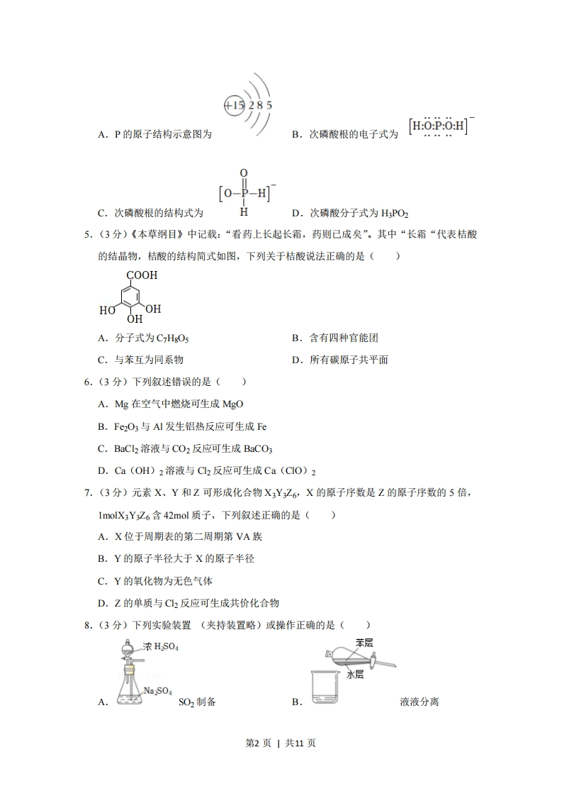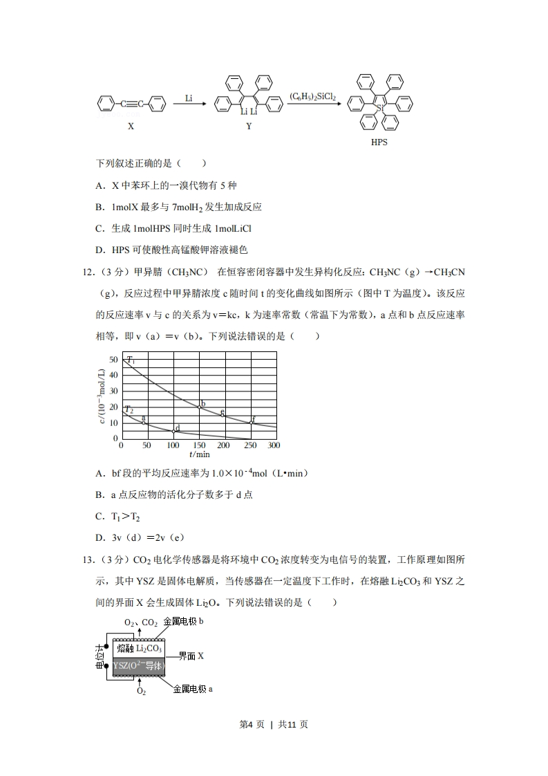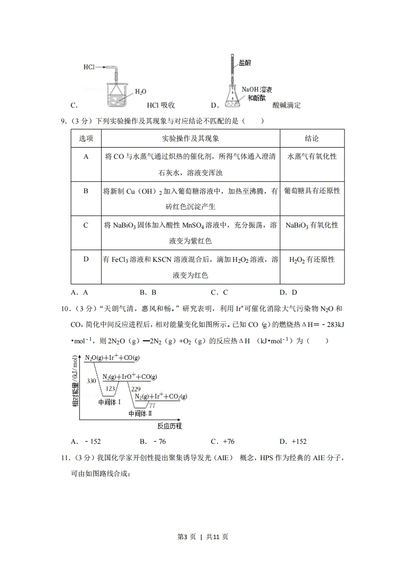 2021年重庆市新高考化学试卷一、选释题:本题共14小题,每小题3分,共42分。在每小题给出的四个选项中,只有一项是符合题目要求的。1.(3分)“垃圾分类记心上,魅力山城新时尚”,下列可回收物中,主要成分为无机非金属材料的是()普通玻璃B不锈钢锅C.矿泉水瓶D.棉麻织物2.(3分)葡萄酒中含有CHCH2OH、CH3COOH、SO2和CO2等多种成分。若NA代表阿伏伽德罗常数的值,下列说法正确的是()A.46 gCH3CH2OH中含有C-H键数为5NAB.1L1molL~ICH3COOH溶液中含有氢离子数为NAC.1 molSO2与1molO2完全反应转移的电子数为4NAD.11.2L(标准状况)C02完全溶于水后溶液中H2CO3分子数为0.5NA3.(3分)25℃时,下列各组离子在指定溶液中一定能大量共存的是()A.1,0molL-1氯化钡溶液中:Mg2、K、Br、S0经B.1.0molL1硫酸中:A1+、Na、CI、NO3C.pH=11的氨水中:Fe2+、Nat、NO3、ClOD.pH=1的硝酸中:Fe3、K+、I、SO244.(3分)次磷酸根(H2PO。)的球棍模型如图所示,下列说法错误的是()○P0第1页|共11页285B.次磷酸根的电子式为[H:0P:0HA.P的原子结构示意图为「o-p-HC.次磷酸根的结构式为HD.次磷酸分子式为HPO25.(3分)《本草纲目》中记载:“看药上长起长霜,药则己成矣”。其中“长霜“代表桔酸的结晶物,桔酸的结构简式如图,下列关于桔酸说法正确的是()COOHHOOHOHA.分子式为CHgO5B.含有四种官能团C.与苯互为同系物D.所有碳原子共平面6.(3分)下列叙述错误的是()A.Mg在空气中燃烧可生成MgOB.Fe2O3与Al发生铝热反应可生成FeC.BaCl2溶液与CO2反应可生成BaCO3D.Ca(OH)2溶液与C2反应可生成Ca(ClO)27.(3分)元素X、Y和Z可形成化合物X3YZ6,X的原子序数是Z的原子序数的5倍,1molX3Y3Z6含42mol质子,下列叙述正确的是()A.X位于周期表的第二周期第VA族B.Y的原子半径大于X的原子半径C.Y的氧化物为无色气体D.Z的单质与C2反应可生成共价化合物8.(3分)下列实验装置(夹持装置略)或操作正确的是()浓HS0苯层Na S04AS02制备B液液分离第2页|共11页HCI盐酸HONaOH溶液和酚酞CHC吸收D.酸碱滴定9.(3分)下列实验操作及其现象与对应结论不匹配的是(选项实验操作及其现象结论A将C0与水蒸气通过炽热的催化剂,所得气体通入澄清水蒸气有氧化性石灰水,溶液变浑浊B将新制Cu(OH)2加入葡萄糖溶液中,加热至沸腾,有葡萄糖具有还原性砖红色沉淀产生c将NaBiO3固体加入酸性MnSO4溶液中,充分振荡,溶NaBiO3有氧化性液变为紫红色D有FeCl3溶液和KSCN溶液混合后,滴加H2O2溶液,溶H2O2有还原性液变为红色A.AB.BC.CD.D10.(3分)“天朗气清,惠风和畅。”研究表明,利用I可催化消除大气污染物N20和C0,简化中间反应进程后,相对能量变化如图所示。己知C0g)的燃烧热△H=-283kJ·mo1,则2N20(g)一2N2(g)+O2(g)的反应热△H(kJ-mol1)为()a↑N0(g+r+Co(g)330N2(g)+IrO++CO(g)123229N2(g)+Ir+CO2(g)中间体I777中间体Ⅱ反应历程A.-152B.-76C.+76D.+15211.(3分)我国化学家开创性提出聚集诱导发光(AE)概念,HPS作为经典的AE分子,可由如图路线合成:第3页|共11页