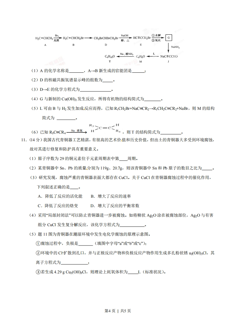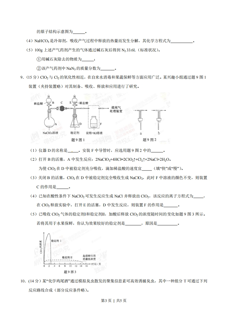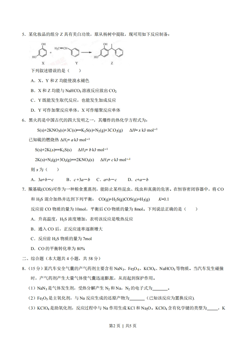 2015年普通高等学校招生全国统一考试(重庆卷)理科综合能力测试化学试题相对原子质量(原子量):H一1N一140一16Na-23C一35.5C64Sn一119Pb-207一、选择题(本大题共7小题,每小题6分,共42分。在每小题给出的四个备选项中,只有一项符合题目要求)1.中华民族有着光辉灿烂的发明史,下列发明创造不涉及化学反应的是()A.用胆矾炼铜B.用铁矿石炼铁C.烧结粘土制陶瓷D.打磨磁石制指南针2.下列说法正确的是()A.I的原子半径大于Br,Ⅱ比HBr的热稳定性强B.P的非金属性强于Si,HPO,比H2SiO3的酸性强C.AlO3和MgO均可与NaOH溶液反应D.SO2和SO3混合气体通入BaNO3)2溶液可得到BaSO3和BaSO43.下列叙述正确的是()A.稀醋酸中加入少量醋酸钠能增大醋酸的电离程度B.25C时,等体积等浓度的硝酸与氨水混合后,溶液pH=7C.25C时,0.1moL~1的硫化氢溶液比等浓度的硫化钠溶液的导电能力弱D.0.1 mol AgCl和0.1 mol AgI混合后加入1L水中,所得溶液中cC-=c-)4.下列实验中,所使用的装置(夹持装置略)、试剂和操作方法都正确的是()NaOH溶液植物油一PcSO,溶液-NaNO.A.观察Fe(OHD,的生成B.配制一定物质的量浓度的NaNO溶液NH,C1和CaO乙醇和浓硫酸混合液C.实验室制取氨D.验证乙烯的生成第1页|共5页5.某化妆品的组分Z具有美白功效,原从杨树中提取,现可用如下反应制备:H.C=CH下列叙述错误的是()A.X、Y和Z均能使溴水褪色B.X和Z均能与NaHCO,溶液反应放出CO2C.Y既能发生取代反应,也能发生加成反应D.Y可作加聚反应单体,X可作缩聚反应单体6.黑火药是中国古代的四大发明之一,其爆炸的热化学方程式为:S(s)+2KNO3(s)+3C(s)=K2S(s)+N2(g)+3COg)AH=x kJ-mol-1己知硫的燃烧热△H,=a kJ-mol-lS(s)+2K(s)=K2S(s)AH2=b kJ-mol-12K(s)+N2(g)+302(g)==2KNO3(s)AH3=ckJ-mol-1则x为()A.3a+b-cB.c+3a-b C.a+b-cD.c+a-b7.羰基硫(COS)可作为一种粮食熏蒸剂,能防止某些昆虫、线虫和真菌的危害。在恒容密闭容器中,将CO和HS混合加热并达到下列平衡:CO(g+H2S(g)COS(g)+H(g)K-0.1反应前C0物质的量为10mol,平衡后C0物质的量为8mol。下列说法正确的是()A.升高温度,H2S浓度增加,表明该反应是吸热反应B.通入CO后,正反应速率逐渐增大C.反应前H2S物质的量为7molD.C0的平衡转化率为80%二、综合题(本大题共4小题,共58分)8.(15分)某汽车安全气囊的产气药剂主要含有NaN3、Fe2O3、KClO4、NaHCO3等物质。当汽车发生碰撞时,产气药剂产生大量气体使气囊迅速膨胀,从而起到保护作用。(1)NaN3是气体发生剂,受热分解产生N2和Na,N2的电子式为。(2)F©2O3是主氧化剂,与Na反应生成的还原产物为(已知该反应为置换反应).(3)KCIO4是助氧化剂,反应过程中与Na作用生成KCI和NO。KCIO4含有化学键的类型为一,K第2页|共5页的原子结构示意图为(4)NaHCO3是冷却剂,吸收产气过程中释放的热量而发生分解,其化学方程式为(5)100g上述产气药剂产生的气体通过碱石灰后得到N233.6L(标准状况)。①用碱石灰除去的物质为一:②该产气药剂中NaN3的质量分数为9.(15分)CO2与C2的氧化性相近,在自来水消毒和果蔬保鲜等方面应用广泛。某兴趣小组通过题9图1装置(夹持装置略)对其制备、吸收、释放和应用进行了研究。稀盐酸稀盐酸接尾气处理装置DNaC1O,溶液稳定剂淀粉+K溶液题9图1题9图2(1)仪器D的名称是一。安装F中导管时,应选用题9图2中的(2)打开B的活塞,A中发生反应:2 NaClo+4HC=2CIO2↑+Cl2↑+2NaC+2H2O。为使CO2在D中被稳定剂充分吸收,滴加稀盐酸的速度宜一(填“快”或“慢”)。(3)关闭B的活塞,CIO2在D中被稳定剂完全吸收生成NaCIO2,此时F中溶液的颜色不变,则装置C的作用是(4)己知在酸性条件下NaClo2可发生反应生成NaCl并释放出CIO2,该反应的离子方程式为一在CO2释放实验中,打开E的活塞,D中发生反应,则装置F的作用是(5)己吸收CO2气体的稳定剂I和稳定剂Ⅲ,加酸后释放CO2的浓度随时间的变化如题9图3所示。若将其用于水果保鲜,你认为效果较好的稳定剂是,原因是经定制【稳定剂口起保鲜作用的最低浓度的时阀/天题9图310.(14分)某“化学鸡尾酒”通过模拟臭虫散发的聚集信息素可高效诱捕臭虫,其中一种组分T可通过下列反应路线合成(部分反应条件略)。第3页|共5页