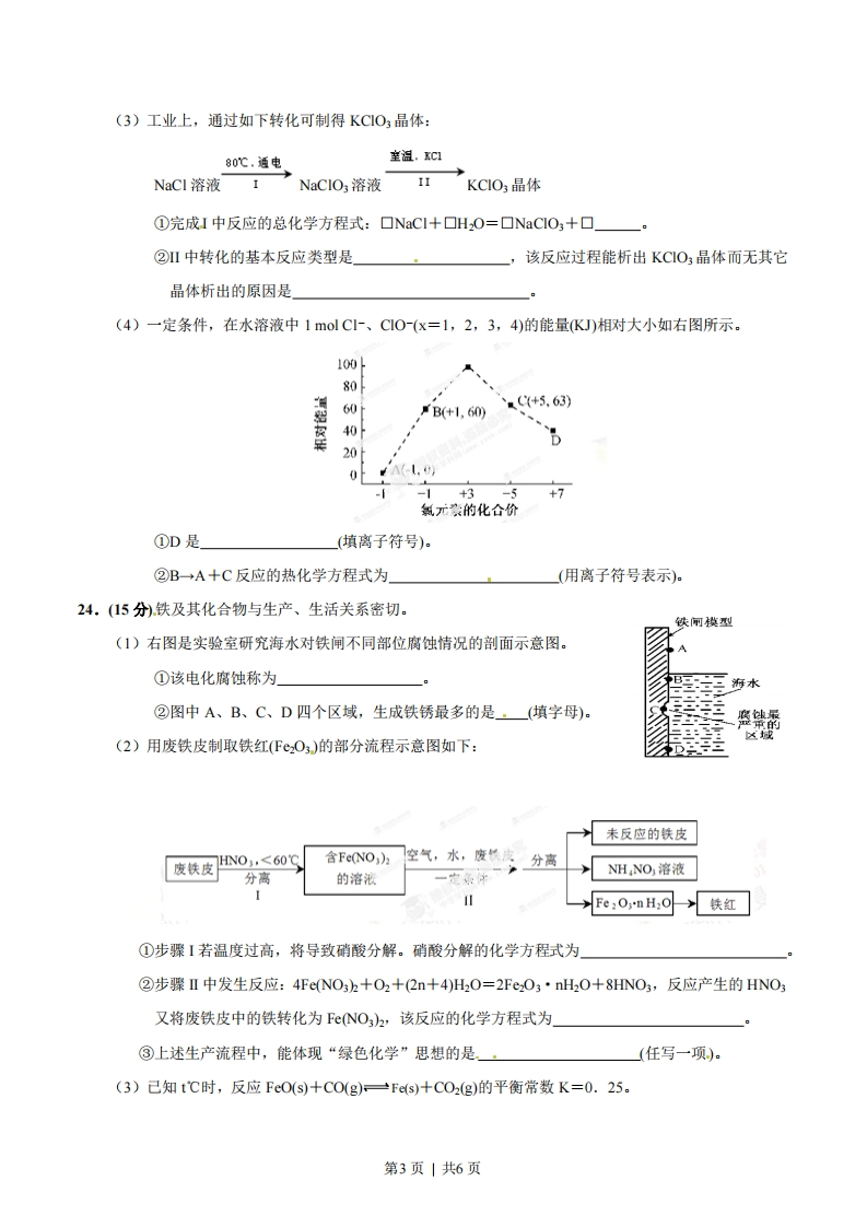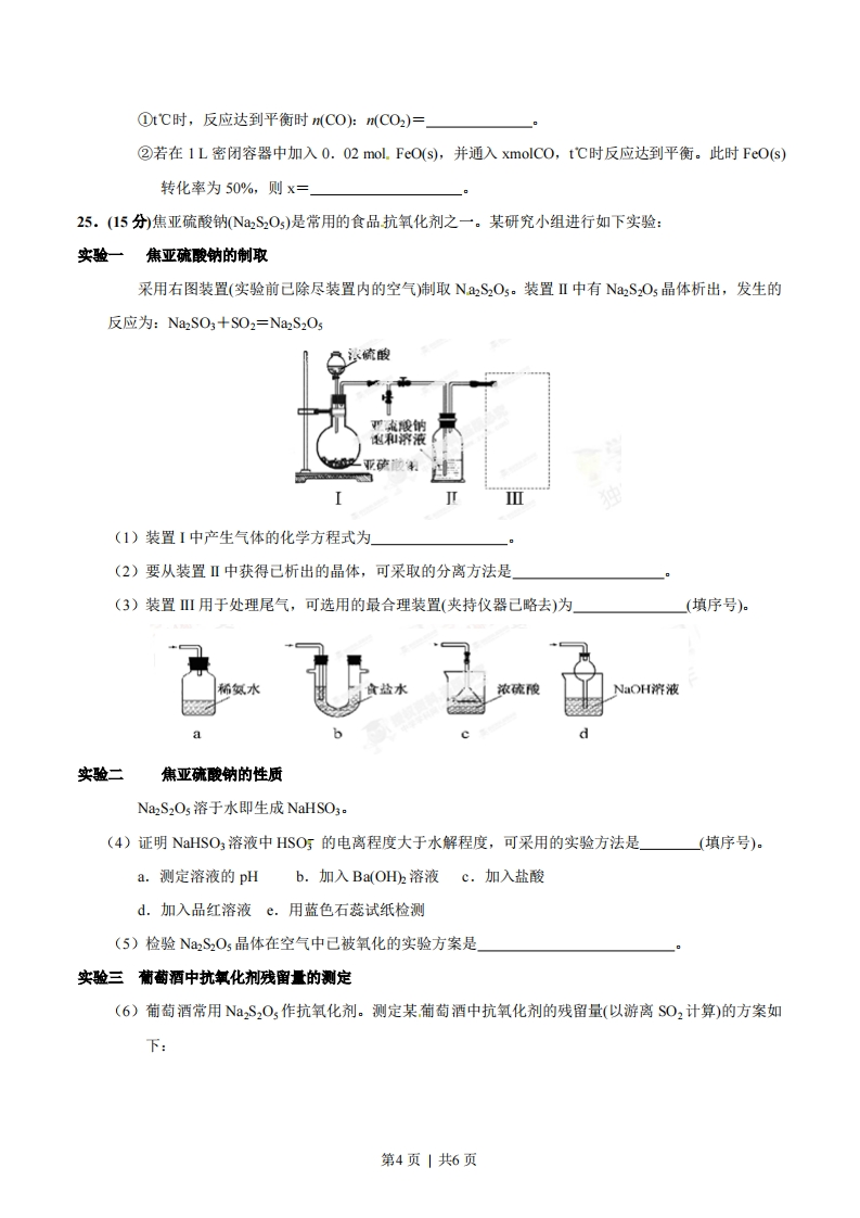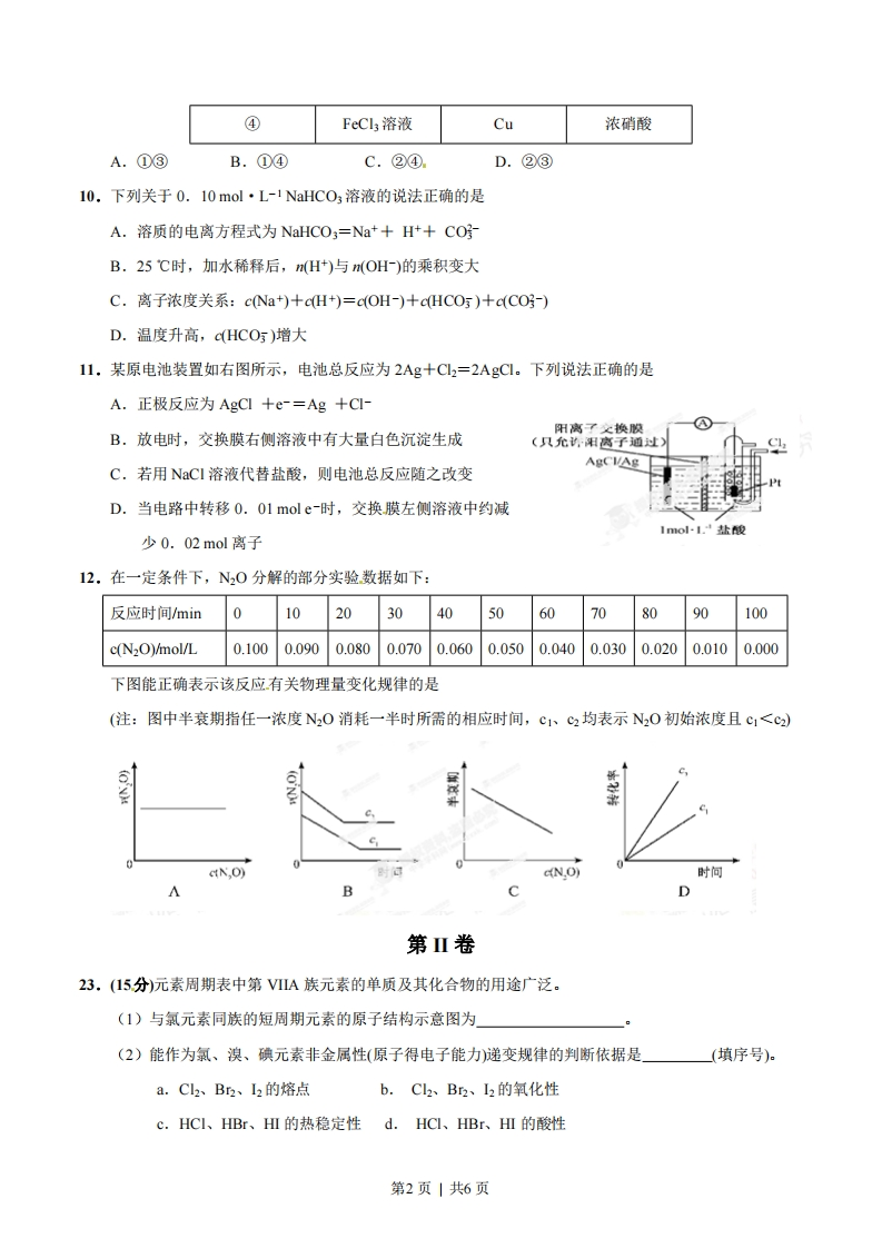 2014年普通高等学校招生全国气一考试(福建卷)理科综合能力刘试化学部分【试卷总评】本试卷整体特点是:题型与往年类似、总体难度不大、亮点比较多。其中第9题要注意反应是在“常温下”;第10题的B项水的离子积不变,但n(+)与n(OH-)的乘积随溶液的体积而发生变化:第11题D项转移电子数与离子的减少数不等:第12题以图表、数据形式,给出一氧化二氮分解的实验数据,学生要提取有效信息,利用图表中的横纵坐标,进行分析,其中,试题中半衰期是一个提示,学生要能从中分析出半衰期的变化规律,分析得出4个选项中相一致的正确项:第25题以“焦亚硫酸钠的制取、性质、含量的测定”为素材,考查学生的化学实验综合探究能力,对学生的分析解决问题的能力要求很高。这些对高考考试方向均很好的导向作用,在教与学中不能把有些知识讲得太绝对,要具体问题进行具体分析,切忌思维定势。第I卷6.下列有关物质应用的说法正确的是A.生石灰用作食品抗氧剂B.盐类都可作调味品C.铝罐可久盛食醋D.小苏打是面包发酵粉的主要成分7,下列关于乙醇的说法不正确的是A.可用纤维素的水解产物制取B.可由乙烯通过加成反应制取C.与乙醛互为同分异构体D.通过取代反应可制取乙酸乙酯8。下列实验能达到目的的是A.只滴加氨水鉴别NaCl、AICl3、MgCl2、NaSO.四种溶液B.将NHCI溶液蒸干制备NH,CI固体C.用萃取分液的方法除去酒精中的水D.用可见光束照射以区别溶液和胶体9,常温下,下列各组物质中,Y既能与X反应又能与Z反应的是X4Z①NaOH溶液Al(OH)3稀硫酸②KOH溶液SiO2稀盐酸③02N2H2第1页|共6页④FeCl3溶液Cu浓硝酸A.①③B.①④C.②④.D.②③10.下列关于0.10mol·L-1 NaHCO3溶液的说法正确的是A.溶质的电离方程式为NaHCO3=Na++Ht+CO}B.25℃时,加水稀释后,nH+)与OH)的乘积变大C.离子浓度关系:cNa+)+cH+)=c(OH-)+cHCO5)+cCO3-)D.温度升高,c(HCO5)增大11,某原电池装置如右图所示,电池总反应为2Ag十C2=2AgCl。下列说法正确的是A.正极反应为AgC十e-=Ag十C-阳离子∝换膜B.放电时,交换膜右侧溶液中有大量白色沉淀生成(只允,阳离子通过AgCVAgC.若用NaCI溶液代替盐酸,则电池总反应随之改变D.当电路中转移0.01mole-时,交换膜左侧溶液中约减1mo-1.盐酸少0.02mol离子12.在一定条件下,N20分解的部分实验数据如下:反应时间/min0102030405060708090100c(N2O)/mol/L0.1000.0900.0800.0700.0600.0500.0400.0300.0200.0100.000下图能正确表示该反应有关物理量变化规律的是(注:图中半衰期指任一浓度N2O消耗一半时所需的相应时间,c1、c2均表示N2O初始浓度且C1