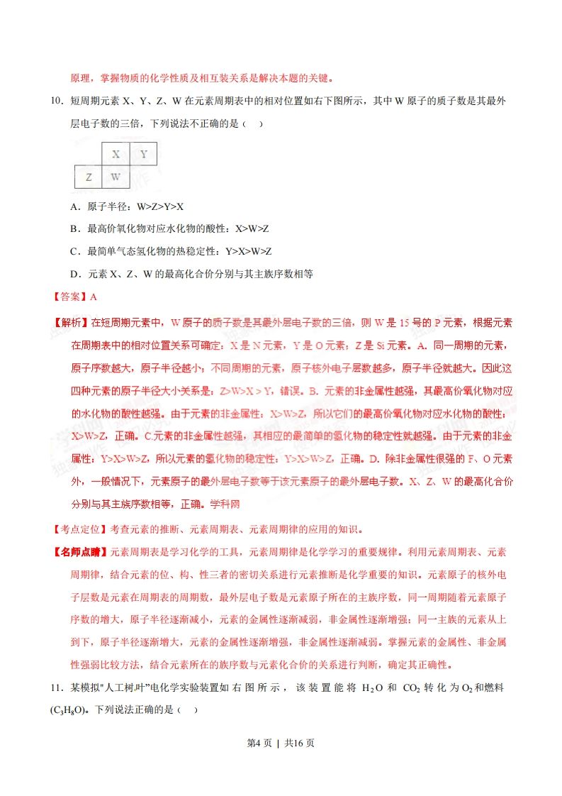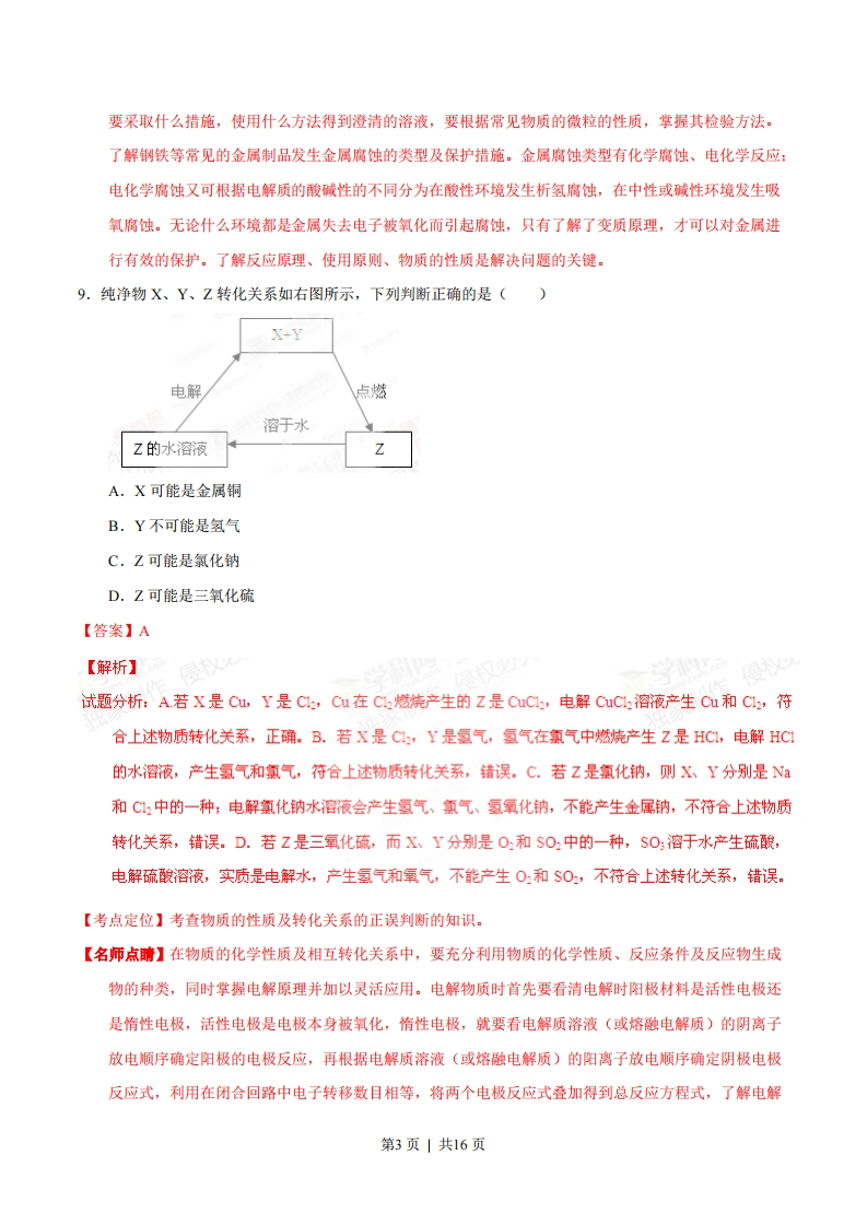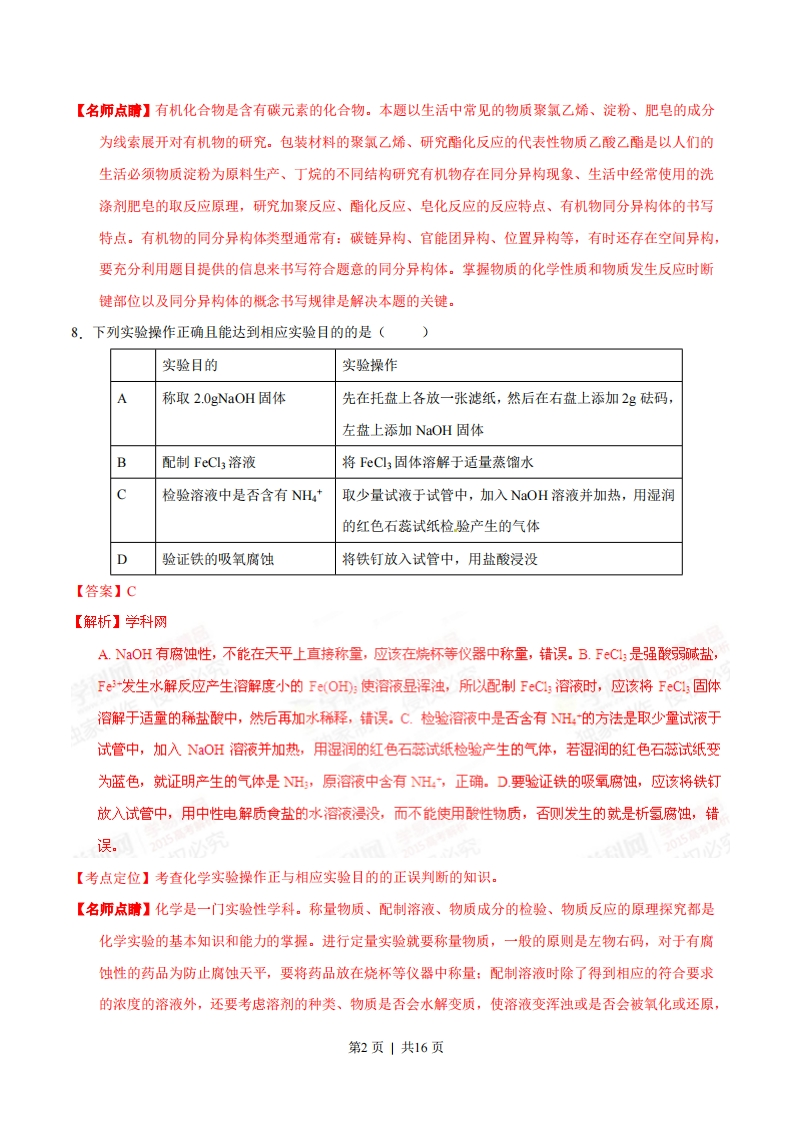 2015年普通高等学校招生全国统一考试(福建卷)理科综合能力测试化学试题6.下列制作铅笔的材料与相应工业不对应的是()A.橡皮擦—橡胶工业B.铝合金片—治金工业C.铝笔芯一电镀工业D.铅笔漆一涂料工业【答案】C【解析】A.制取橡皮擦的原料是橡胶,涉及到檬胶工业的生产,正确。B.铝合金片涉及金属A1的冶炼过程,与怡金工业有关,正确。C.铝笔芯的原科是石墨和粘土,与电镀工业无关,错误。D.铅笔外边刷的油漆和绘制的各种图案、文字等,与有机合成的材料及涂料工业有关,正确。故选项是C。【考点定位】考查制作铅笔涉及的材料与相关工业生成的关系的正误判断的知识。【名师点睛】本题以学生的学习生活中必不可少、经常使用的最普通的铅笔为线索展示化学学习的重要性的研究。铅笔头上带有擦拭的橡皮擦原料是橡胶,涉及以石油化工产品为原料的有机合成橡胶工业:固定连接橡皮与铅笔的纽带一铝合金片涉及治炼金属的冶金业:为了增加和学习生活的视觉美感和亲和性,在铅笔外皮刷的油漆及绘制的各种赏心悦目的图案、花纹、文字等使用的原料涉及到有机合成及涂料的生产和使用,制作铅笔芯要以石墨和粘土为原料加工制成。只有对物质的各种成分全面认识,才可以做出正确的判断。可见化学知识已经涉及生活的方方面面,这充分证明学好化学的重要性和学好化学的必要性,充分认识到化学是一门实用性学科,渗透到各个领域、各个方面。7.下列关于有机化合物的说法正确的是()A.聚氯乙烯分子中含碳碳双键B.以淀粉为原料可制取乙酸乙酯C.丁烷有3种同分异构体D.油脂的皂化反应属于加成反应【答案】B【解析】学科网A.聚氯乙烯分子是以氯乙烯为原料,通过分子之间的特殊的加成反应一一加聚反应形成,发生加聚反应后分子中碳原子变为饱和碳原子,不再含碳碳双键,错误。B.淀粉是多糖,水解产生葡萄糖,葡萄糖在酒化酶的作用下反应产生乙醇:乙醇催化氧化产生乙醛,乙醛在进一步氧化产生乙酸。乙酸与乙醇在加热和浓硫酸存在时发生酯化反应形成乙酸乙酯和水。因此以淀粉为原料可制取乙酸乙酯,正确。C.丁烷有正丁烷和异丁烷两种同分异构体,错误。D.油脂的皂化反应属于取代反应,错误。【考点定位】考查关于有机化合物的结构、性质、反应类型及同分异构体的判断的知识。第1页|共16页【名师点睛】有机化合物是含有碳元素的化合物。本题以生活中常见的物质聚氯乙烯、淀粉、肥皂的成分为线索展开对有机物的研究。包装材料的聚氯乙烯、研究酯化反应的代表性物质乙酸乙酯是以人们的生活必须物质淀粉为原料生产、丁烷的不同结构研究有机物存在同分异构现象、生活中经常使用的洗涤剂肥皂的取反应原理,研究加聚反应、酯化反应、皂化反应的反应特点、有机物同分异构体的书写特点。有机物的同分异构体类型通常有:碳链异构、官能团异构、位置异构等,有时还存在空间异构,要充分利用题目提供的信息来书写符合题意的同分异构体。掌握物质的化学性质和物质发生反应时断键部位以及同分异构体的概念书写规律是解决本题的关键。8,下列实验操作正确且能达到相应实验目的的是()实验目的实验操作称取2.0 gNaOH固体先在托盘上各放一张滤纸,然后在右盘上添加2g砝码,左盘上添加NaOH固体B配制FeCl3溶液将FeCl3固体溶解于适量蒸馏水C检验溶液中是否含有NH*取少量试液于试管中,加入NaOH溶液并加热,用湿润的红色石蕊试纸检验产生的气体D验证铁的吸氧腐蚀将铁钉放入试管中,用盐酸浸没【答案】C【解析】学科网A.NOH有腐蚀性,不能在天平上直接称量,应该在烧杯等仪器中称量,错误。B.FC1:是强酸弱碱盐,Fe*发生水解反应产生溶解度小的Fe(OH:使溶液显浑浊,所以配制FeC1:溶液时,应该将FeC1:固体溶解于适量的稀盐酸中,然后再加水稀释,错误。C.检验溶液中是否含有H:的方法是取少量试液于试管中,加入NOH溶液并加热,用湿润的红色石蕊试纸检验产生的气体,若湿润的红色石蕊试纸变为蓝色,就证明产生的气体是H,原溶液中含有H,正确。D.要验证铁的吸氧腐蚀,应该将铁钉放入试管中,用中性电解质食盐的水溶液浸没,而不能使用酸性物质,否则发生的就是析氢腐蚀,错误。【考点定位】考查化学实验操作正与相应实验目的的正误判断的知识。【名师点睛】化学是一门实验性学科。称量物质、配制溶液、物质成分的检验、物质反应的原理探究都是化学实验的基本知识和能力的掌握。进行定量实验就要称量物质,一般的原则是左物右码,对于有腐蚀性的药品为防止腐蚀天平,要将药品放在烧杯等仪器中称量:配制溶液时除了得到相应的符合要求的浓度的溶液外,还要考虑溶剂的种类、物质是否会水解变质,使溶液变浑浊或是否会被氧化或还原,第2页|共16页要采取什么措施,使用什么方法得到澄清的溶液,要根据常见物质的微粒的性质,掌握其检验方法。了解钢铁等常见的金属制品发生金属腐蚀的类型及保护措施。金属腐蚀类型有化学腐蚀、电化学反应:电化学腐蚀又可根据电解质的酸碱性的不同分为在酸性环境发生析氢腐蚀,在中性或碱性环境发生吸氧腐蚀。无论什么环境都是金属失去电子被氧化而引起腐蚀,只有了解了变质原理,才可以对金属进行有效的保护。了解反应原理、使用原则、物质的性质是解决问题的关键。9.纯净物X、Y、Z转化关系