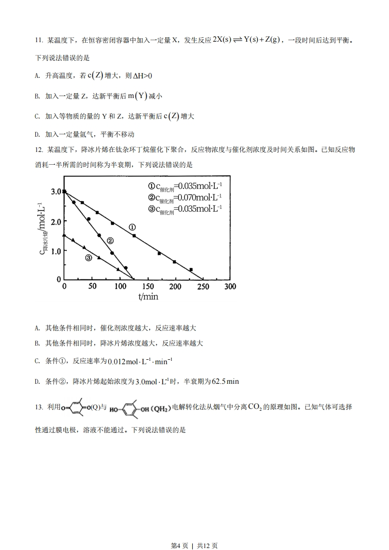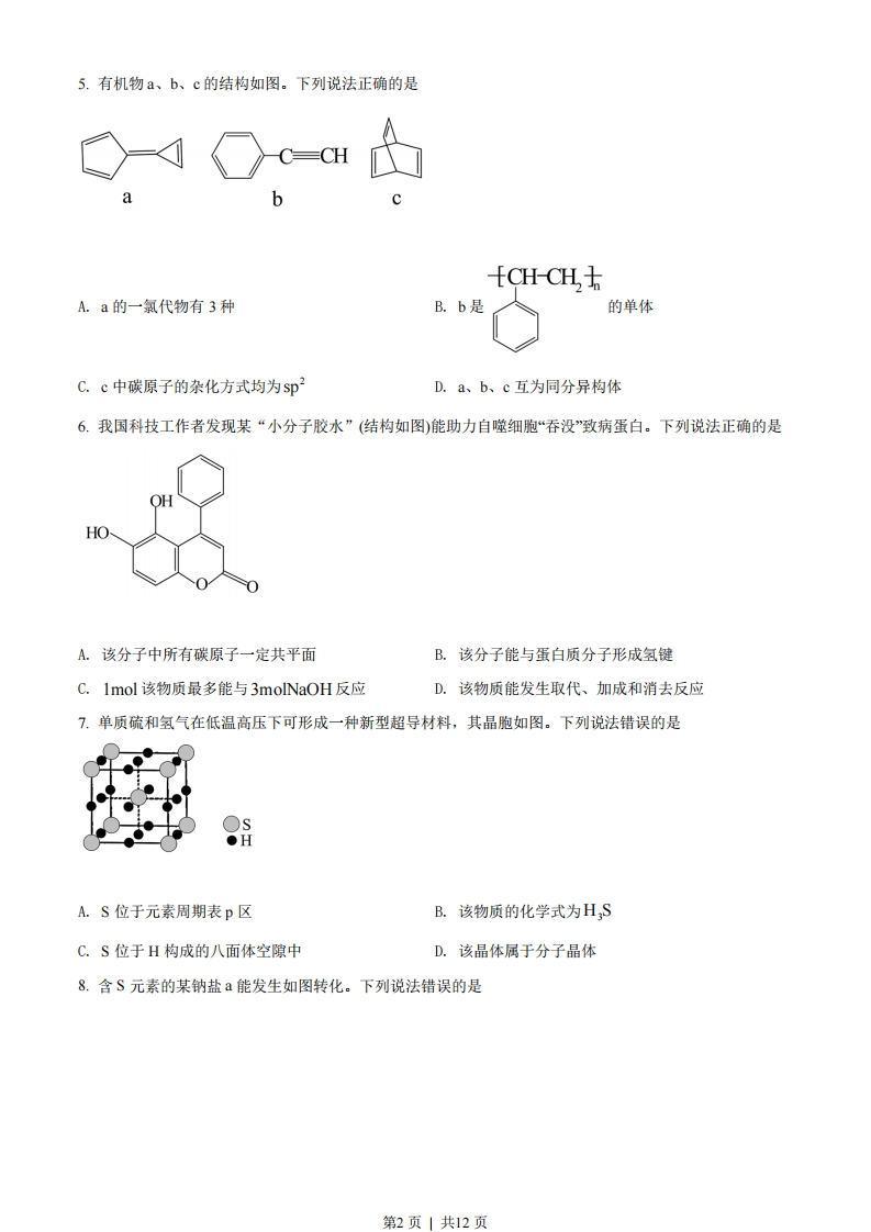 2021年辽宁省普通高等学校招生选择性考试化学注意事项:1答卷前,考生务必将自已的姓名、准考证号填写在答题卡上。2.答选择题时,选出每小题答案后,用铅笔把答题卡对应题目的答案标号涂黑如需改动,用橡皮擦干净后,再选涂其它答案标号.答非选择题时,将答案写在答题卡上写在本试卷上无效。3.考试结束后,将本试卷和答题卡一并交回。可能用到的相对原子质量:H1016C135.5Fe56一、选择题:本题共15小题,每小题3分,共45分。在每小题给出的四个选项中,只有一项符合题目要求。1.下列说法错误的是A.纯铁比生铁易生锈B.臭氧可用于自来水消毒C.酚醛树脂可用作绝缘、隔热材料D.高纯硅可用于制芯片2.下列化学用语使用正确的是2s2pA.基态C原子价电子排布图:tt↑↑B.C结构示意图:C.KCl形成过程:K+C1:→K:C:D.质量数为2的氢核素:H3.《天工开物》中记载:“凡乌金纸由苏、杭造成,其纸用东海巨竹膜为质。用豆油点灯,闭塞周围,只留针孔通气,熏染烟光而成此纸,每纸一张打金箔五十度.”下列说法错误的是A.“乌金纸”的“乌”与豆油不完全燃烧有关B.“巨竹膜”为造纸的原料,主要成分是纤维素C.豆油的主要成分油脂属于天然高分子化合物D.打金成箔,说明金具有良好的延展性4.下列说法正确的是A22.4LCl2(标准状况)与水充分反应转移1mol电子B.H,SO,和CuCl,均可通过化合反应得到C.将蘸有浓氨水和浓硫酸的玻璃棒相互靠近,有白烟产生D.SO2与KC1O溶液反应:S0,+2C1O+H,0=2HCIO+SO}第1页」共12页5.有机物a、b、c的结构如图。下列说法正确的是CH-CHA.a的一氯代物有3种B.b是的单体C.c中碳原子的杂化方式均为sp2D.a、b、c互为同分异构体6.我国科技工作者发现某“小分子胶水”(结构如图)能助力自噬细胞“吞没”致病蛋白。下列说法正确的是HOA.该分子中所有碳原子一定共平面B.该分子能与蛋白质分子形成氢键C.1mol该物质最多能与3 molNaOH反应D.该物质能发生取代、加成和消去反应7.单质硫和氢气在低温高压下可形成一种新型超导材料,其晶胞如图。下列说法错误的是○S●HA.S位于元素周期表p区B.该物质的化学式为H,SC.S位于H构成的八面体空隙中D.该晶体属于分子晶体8.含S元素的某钠盐a能发生如图转化。下列说法错误的是第2页」共12页①足量C12BaCl2溶液溶液b沉淀c盐a溶液②稀盐孽刺激性气KMnO4溶液味气体d紫色褪去A.a可能为正盐,也可能为酸式盐B.c为不溶于盐酸的白色沉淀C.d为含极性键的非极性分子D.反应②中还可能生成淡黄色沉淀9.由下列实验操作及现象能得出相应结论的是实验操作现象结论向KBr、KI混合溶液中依次加入少量氯水和CCl4,振溶液分层,下层呈紫氧化性:A荡,静置红色C12>Br3>I2在火焰上灼烧搅拌过某无色溶液的玻璃棒火焰出现黄色溶液中含Na元素HCO3酸性弱于用pH计测定pH:①NaHCO3溶液②CH,COONa溶液pH:①>②CH;COOH把水滴入盛有少量N2O2的试管中,立即把带火星木木条复燃反应生成了O2条放在试管口A.AB.BC.CD.D10.如图,某液态金属储能电池放电时产生金属化合物LB。下列说法正确的是M极:液态Li/泡沫Ni熔融LiCI和KCIN极:液态Sb-Bi-Sn不锈钢外壳A.放电时,M电极反应为Ni-2e=Ni2+B.放电时,山由M电极向N电极移动C.充电时,M电极的质量减小D.充电时,N电极反应为Li,Bi+3e=3Li+Bi第3页」共12页