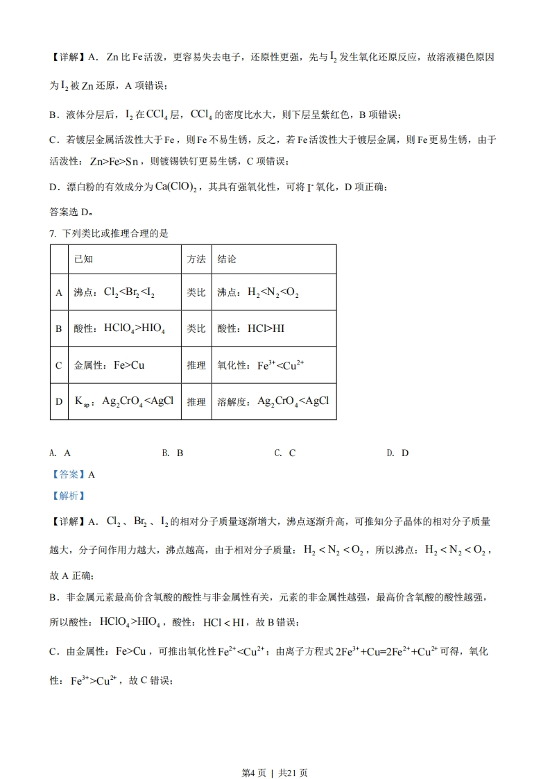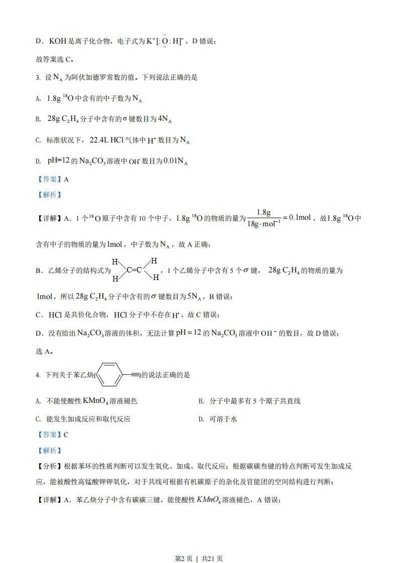 2022年辽宁省普通高等学校招生选择性考试化学本试卷满分100分,考试时间75分钟。可能用到的相对原子质量:H-1B-11C-12N-140-16Na-23S-32Fe-56一、选择题:本题共15小题,每小题3分,共45分。在每小题给出的四个选项中,只有一项符合题目要求。1.北京冬奥会备受世界瞩目。下列说法错误的是A.冰壶主材料花岗岩属于无机非金属材料B.火炬“飞扬”使用的碳纤维属于有机高分子材料C.冬奥会“同心”金属奖牌属于合金材料D.短道速滑服使用的超高分子量聚乙烯属于有机高分子材料【答案】B【解析】【详解】A.花岗岩的主要成分是石英、云母、长石等矿物,属于无机非金属材料,A正确:B.碳纤维指的是含碳量在90%以上的高强度高模量纤维,属于无机非金属材料,B错误:C.金属奖牌属于合金材料,C正确:D.聚乙烯属于有机高分子材料,D正确:故答案选B。2.下列符号表征或说法正确的是A.H2S电离:H,S=2H+S2B.Na位于元素周期表p区C.CO空间结构:平面三角形D.KOH电子式:K:O:H【答案】C【解析】【详解】A.HS是二元弱酸,电离分步进行,其一级电离方程式为H,S一二H+HS,A错误:B.基态Na原子的价电子排布式是3s',最后一个电子填充在s能级,位于元素周期表s区,B错误:1C.C0中心碳原子的价层电子对数为3+2×(4+2-3×2=3,故其空间结构为平面三角形,C正确:第1页」共21页D.KOH是离子化合物,电子式为KCO:H,D错误:故答案选C。3.设NA为阿伏加德罗常数的值。下列说法正确的是A.1.8g18O中含有的中子数为NAB.28gC2H,分子中含有的o键数目为4NC.标准状况下,22.4LHCI气体中H数目为NAD.pH=l2的NaCO3溶液中Or数目为0.01NA【答案】A【解析】1.8g【详解】A.1个180原子中含有10个中子,1.8g180的物质的量为8gmoF=0.1mol,故1.8g10中含有中子的物质的量为lmol,中子数为NA,故A正确:HHB.乙烯分子的结构式为C=C1个乙烯分子中含有5个0键,28gC,H,的物质的量为HH1mol,所以28gC,H,分子中含有的o键数目为5NA,B错误:C.HCI是共价化合物,HCI分子中不存在,故C错误:D.没有给出Na,CO3溶液的体积,无法计算pH=12的NaCO3溶液中OH~的数目,故D错误:选A。4.下列关于苯乙炔(马的说法正确的是A.不能使酸性KMnO,溶液褪色B.分子中最多有5个原子共直线C.能发生加成反应和取代反应D.可溶于水【答案】C【解析】【分析】根据苯环的性质判断可以发生氧化、加成、取代反应:根据碳碳叁键的特点判断可发生加成反应,能被酸性高锰酸钾钾氧化,对于共线可根据有机碳原子的杂化及官能团的空间结构进行判断:【详解】A.苯乙炔分子中含有碳碳三键,能使酸性KMmO,溶液褪色,A错误:第2页共21页456B.如图所示,C=C一H,苯乙炔分子中最多有6个原子共直线,B错误:C.苯乙炔分子中含有苯环和碳碳三键,能发生加成反应,苯环上的氢原子能被取代,可发生取代反应,C正确:D.苯乙炔属于烃,难溶于水,D错误故选答案C:【点睛】本题考查苯乙炔的结构与性质,根据官能团的特点进行判断。5.短周期元素X、Y、Z、W、Q原子序数依次增大。基态X、Z、Q原子均有两个单电子,W简单离子在同周期离子中半径最小,Q与Z同主族。下列说法错误的是A.X能与多种元素形成共价键B.简单氢化物沸点:Z