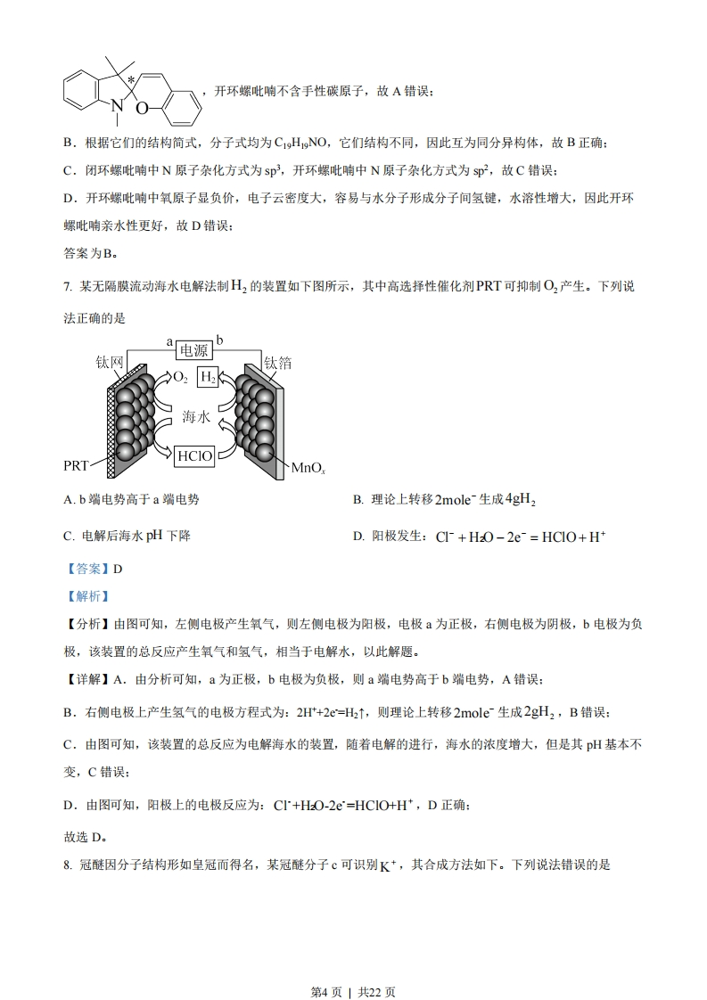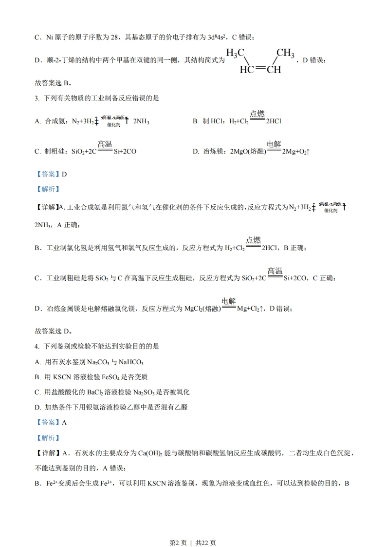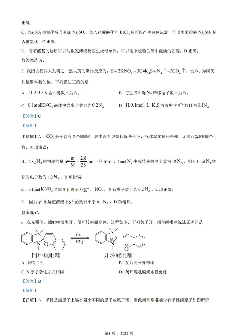 辽宁省2023年普通高等学校招生选择性考试(化学)本试卷满分100分,考试时间75分钟。可能用到的相对原子质量:H-1B-11C-12N-140-16Na-23S-32Fe-56一、选择题:本题共15小题,每小题3分,共45分。在每小题给出的四个选项中,只有一项符合题目要求。1.科技是第一生产力,我国科学家在诸多领域取得新突破,下列说法错误的是A.利用CO2合成了脂肪酸:实现了无机小分子向有机高分子的转变B.发现了月壤中的“嫦娥石[(CagY)Fe(PO4h]”:其成分属于无机盐C.研制了高效率钙钛矿太阳能电池,其能量转化形式:太阳能→电能D.革新了海水原位电解制氢工艺:其关键材料多孔聚四氟乙烯耐腐蚀【答案】A【解析】【详解】A.常见的脂肪酸有:硬脂酸(C1H35 COOH)、油酸(C1H3COOH,二者相对分子质量虽大,但没有达到高分子化合物的范畴,不属于有机高分子,A错误:B.嫦娥石因其含有Y、Ca、Fe等元素,属于无机化合物,又因含有磷酸根,是无机盐,B正确:C.电池是一种可以将其他能量转化为电能的装置,钙钛矿太阳能电池可以将太阳能转化为电能,C正确:D.海水中含有大量的无机盐成分,可以将大多数物质腐蚀,而聚四氟乙烯塑料被称为塑料王,耐酸、耐碱,不会被含水腐蚀,D正确:故答案选A。2.下列化学用语或表述正确的是A.BeCl2的空间结构:V形B.P4中的共价键类型:非极性键CH;HC.基态Ni原子价电子排布式:3d0D.顺一2一丁烯的结构简式:H【答案】B【解析】【详解】A.BeCl2的中心原子为Be,根据VSEPR模型可以计算,BeC2中不含有孤电子对,因此BeCl2为直线型分子,A错误:B.P4分子中相邻两P原子之间形成共价键,同种原子之间形成的共价键为非极性共价键,P4分子中的共价键类型为非极性共价键,B正确:第1页」共22页C.Ni原子的原子序数为28,其基态原子的价电子排布为3d84s2,C错误:HCD.顺2丁烯的结构中两个甲基在双键的同一侧,其结构简式为CH3,D错误✉HC-CH故答案选B.3.下列有关物质的工业制备反应错误的是A.合成氨:+3生帝个2NH点燃B.制HCl:H2+Ch2HCI高温电解C.制粗硅:SiO2+2CSH2COD.治炼镁:2MgO(熔融)二2Mg+O2t【答案】D【解析】【详解A.工业合成氨是利用氨气和氢气在催化剂的条件下反应生成的,反应方程式为N,+3,手干2NH3,A正确:点燃B.工业制氯化氢是利用氢气和氯气反应生成的,反应方程式为H2+C2一2HCI,B正确:高温C.工业制粗硅是将SiO2与C在高温下反应生成粗硅,反应方程式为SiO2+2C=Si+2C0,C正确:电解D.冶炼金属镁是电解熔融氯化镁,反应方程式为MgC(熔融)一Mg+C2↑,D错误:故答案选D。4.下列鉴别或检验不能达到实验目的的是A.用石灰水鉴别NaCO3与NaHCO3B.用KSCN溶液检验FeSO是香变质C.用盐酸酸化的BaCh2溶液检验NaSO3是否被氧化D.加热条件下用银氨溶液检验乙醇中是否混有乙醛【答案】A【解析】【详解】A.石灰水的主要成分为C(OHD2能与碳酸钠和碳酸氢钠反应生成碳酸钙,二者均生成白色沉淀,不能达到鉴别的目的,A错误:B.Fe2+变质后会生成Fe3t,可以利用KSCN溶液鉴别,现象为溶液变成血红色,可以达到检验的目的,B第2页1共22页正确:C.Na2SO3被氧化后会变成Na2SO4,加入盐酸酸化的BaCl2后可以产生白色沉淀,可以用来检验Na2SO3是否被氧化,C正确:D.含有醛基的物质可以与银氨溶液反应生成银单质,可以用来检验乙醇中混油的乙醛,D正确:故答案选A。5.我国古代四大发明之一黑火药的爆炸反应为:S+2KNO3+3C=K,S+N2个+3CO2个。设NA为阿伏加德罗常数的值,下列说法正确的是A.11.2LCO2含π键数目为NB.每生成2.8gN2转移电子数目为NAC.0.1 molKNO3晶体中含离子数目为0.2ND.1L0.lmol.LK,S溶液中含S2-数日为0.1N【答案】C【解析】【详解】A.CO2分子含有2个回团键,题中没有说是标况条件下,气体摩尔体积未知,无法计算团回键个数,A项错误:m2.8B.2.8gN2的物质的量n=mol=0.1mol,1molN2生成转移的电子数为12NA,则0.1molN2转M28移的电子数为1.2NA,B项错误:C.0.1 mol KNO3晶体含有离子为K+、NO,含有离子数目为0.2NA,C项正确:D.因为S2水解使溶液中S2的数目小于0.1NA,D项错误:答案选C。6.在光照下,螺吡喃发生开、闭环转换而变色,过程如下。下列关于开、闭环螺吡喃说法正确的是hv闭环螺吡喃开环螺吡喃A.均有手性B.互为同分异构体C.N原子杂化方式相同D.闭环螺吡喃亲水性更好【答案】B【解析】【详解】A.手性是碳原子上连有四个不同的原子或原子团,因此闭环螺吡喃含有手性碳原子如图所示,第3页共22页