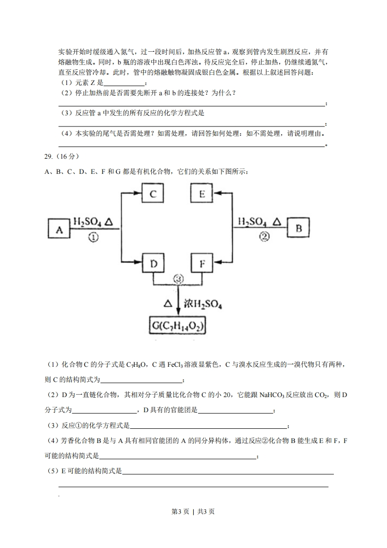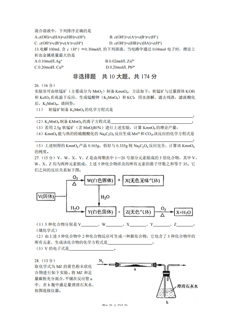 2008年普通高等学校招生全国统一考试理科综合能力测试选择题共21小题,第小题6分,共126分。以下数据可供解题时参考:相对原子质量(原子量):H1C12016Na23K39Mn 55 Cu 64 Zn 65 Ag 108 Pb 207一、选择题(本题共13小题,在每小题给出的四个选项中,只有一项是符合题目要求的。)6.在溶液中加入中量Naz02后仍能大量共存的离子组是A.NHt4、Ba2+、C、NO3B.K+、AIO2、C、SO24C.Ca2+、Mg2+、NO3、HC03D.Na、C、CO23、SO237.下列化合物,按其品体的熔点由高到低排列正确的是A.SiO2 CaCl CBr4 CF2B.SiO2 CsCl CF4 CBr4C.CsCl SiOz CBr4 CF4D.CF CBra CsCl SiO28.下列各组物质不属于同分异构体的是A.2,2-二甲基丙醇和2-甲基丁醇B.邻氯甲苯和对氯甲苯C.2-甲基丁烷和戊烷D.甲基丙烯酸和甲酸丙酯9.下列各组给定原子序数的元素,不能形成原子数之比为1:1稳定化合物的是A.3和17B.1和8C.1和6D.7和1210.下列叙述中正确的是A.NH、CO、CO2都是极性分子B.CH、CCL,都是含有极性键的非极性分子C.HF、HCI、HBr、H的稳定性依次增强D.CS2、HO、C2H2都是直线型分子11.己知:4NH3(g)+502(g)=4NO(gH6H2(g).△H=-1025KJ/mol该反应是一个可逆反应。若反应物起始物质的量相同,下列关于该反应的示意图不正确的是-1000℃阳-IX 10'Pa1200℃10×10'a时间时间1000℃能化刘-1200℃型-4000℃01000℃无催化剂时间时间12.己知乙酸(HA)的酸性比甲酸(HB)弱,在物质的量浓度均为0.1mol/L的NaA和NaB第1页|共3页混合溶液中,下列排序正确的是A.dOH)>c(HAPc(HBPc(H+)B.c(OH)>cA)>c(B->c(H+)C.c(OH))>BPcA)>c(H)D.c(OH)>c(HBPc(HA)>c(H)13.电解100mL含c(Ht)=0.30mol/L的下列溶液,当电路中通过0.04mol电子时,理论上析出金属质量最大的是A.0.10mol/LAg+B.0.02mol/L Zn2C.0.20mol/L Cu2+D.0.20mol/L Pb2+非选择题共10大题,共174分26.(16分)实验室可由软锰矿(主要成分为MnO2)制备KmnO4,方法如下:软锰矿与过量固体KOH和KclO3在高温下反应,生成锰酸钾(K2MnO4)和KCl:用水溶解,滤去残渣,滤液酸化后,K2MnO4。请回答:(1)软锰矿制备K2MO,的化学方程式是(2)K2MnOu制备KMnOa的离子方程式是(3)若用2.5g软锰矿(含MnO280%)进行上述实验,计算KmnO4的理论产量:(4)KmnO,能与热的经硫酸酸化的Na2C2O4反应生成Mn2+和CO2+该反应的化学方程式是(5)上述制得的KmnOa产品0.165g,恰好与0.335g钝Na2C204反应完全,计算该KmnO,的纯度。27.(15分)V、W、X、Y、Z是由周期表中1~20号部分元素组成的5倍化合物,其中V、W、X、Z均为两种元素组成,上述5种化合物涉及的所有元素的原子序数之和等于35。它们之间的反应关系如下图:0W(白色周体)X(无色无味气体)V(周体)H2010Y(白色固体)(无色气体)0X+H2O(1)5种化合物分别是VW(填化学式)(2)由上述5种化合物中2种化合物反应可生成一种新化合物,它包含了5种化合物中的所有元素,生成该化合物的化学方程式是(3)V的电子式是28.(13分)取化学式为MZ的黄色粉末状化合物进行如下实验。将M亿和足量碳粉充分混合,平铺在反应管a中,在b瓶中盛足量澄清石灰水,沿清石灰水按图连接仪器。实验开始时缓级通入氮气,过一段时间后,加热反应管,观察到管内发生剧烈反应,并有熔融物生成。同时,b瓶的溶液中出现白色浑浊。待反应完全后,停止加热,仍继续通氮气,直至反应管冷却。此时,管中的熔融触物凝固成银白色金属。根据以上叙述回答问题:(1)元素Z是」(2)停止加热前是否需要先断开a和b的连接处?为什么?(3)反应管a中发生的所有反应的化学方程式是(4)本实验的尾气是否需处理?如需处理,请回答如何处理:如不需处理,请说明理由。29.(16分)A、B、C、D、E、F和G都是有机化合物,它们的关系如下图所示:l2S04△HSO4△AB②△浓HSO4G(C2HO2)(1)化合物C的分子式是CHO,C遇FCl3溶液显紫色,C与溴水反应生成的一溴代物只有两种,则C的结构简式为(2)D为一直链化合物,其相对分子质量比化合物C的小20,它能跟NaHCO3反应放出CO2,则D分子式为D具有的官能团是(3)反应①的化学方程式是(4)芳香化合物B是与A具有相同官能团的A的同分异构体,通过反应②化合物B能生成E和F,F可能的结构简式是(5)E可能的结构简式是第3页|共3页