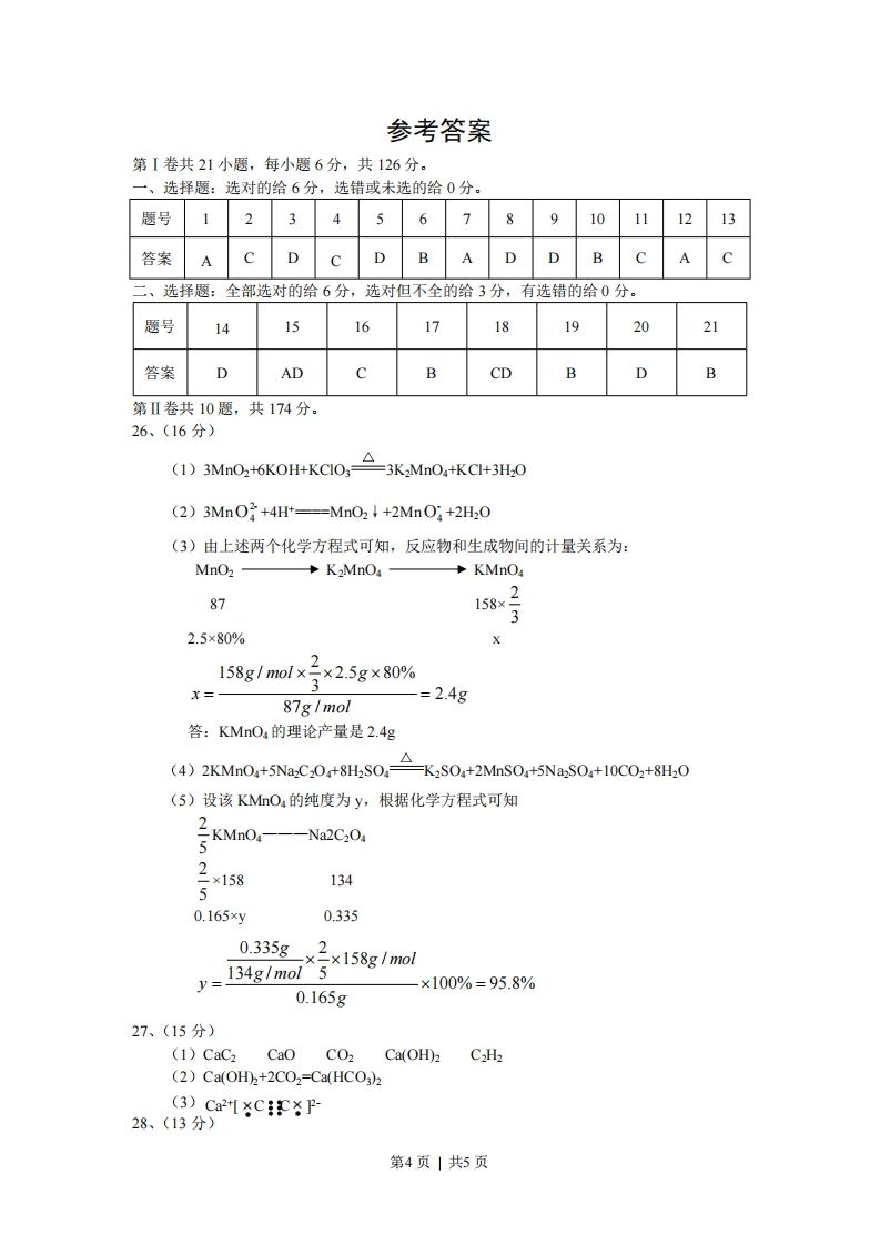 2008年普通高等学校招生全国统一考试理科综合能力测试选择题共21小题,第小题6分,共126分。以下数据可供解题时参考:相对原子质量(原子量):H1C12016Na23K39Mn 55 Cu 64 Zn 65 Ag 108 Pb 207一、选择题(本题共13小题,在每小题给出的四个选项中,只有一项是符合题目要求的。)6.在溶液中加入中量Naz02后仍能大量共存的离子组是A.NHt4、Ba2+、C、NO3B.K+、AIO2、C、SO24C.Ca2+、Mg2+、NO3、HC03D.Na、C、CO23、SO237.下列化合物,按其品体的熔点由高到低排列正确的是A.SiO2 CaCl CBr4 CF2B.SiO2 CsCl CF4 CBr4C.CsCl SiOz CBr4 CF4D.CF CBra CsCl SiO28.下列各组物质不属于同分异构体的是A.2,2-二甲基丙醇和2-甲基丁醇B.邻氯甲苯和对氯甲苯C.2-甲基丁烷和戊烷D.甲基丙烯酸和甲酸丙酯9.下列各组给定原子序数的元素,不能形成原子数之比为1:1稳定化合物的是A.3和17B.1和8C.1和6D.7和1210.下列叙述中正确的是A.NH、CO、CO2都是极性分子B.CH、CCL,都是含有极性键的非极性分子C.HF、HCI、HBr、H的稳定性依次增强D.CS2、HO、C2H2都是直线型分子11.己知:4NH3(g)+502(g)=4NO(gH6H2(g).△H=-1025KJ/mol该反应是一个可逆反应。若反应物起始物质的量相同,下列关于该反应的示意图不正确的是-1000℃阳-IX 10'Pa1200℃10×10'a时间时间1000℃能化刘-1200℃型-4000℃01000℃无催化剂时间时间12.己知乙酸(HA)的酸性比甲酸(HB)弱,在物质的量浓度均为0.1mol/L的NaA和NaB第1页|共5页混合溶液中,下列排序正确的是A.dOH)>c(HAPc(HBPc(H+)B.c(OH)>cA)>c(B->c(H+)C.c(OH))>BPcA)>c(H)D.c(OH)>c(HBPc(HA)>c(H)13.电解100mL含c(Ht)=0.30mol/L的下列溶液,当电路中通过0.04mol电子时,理论上析出金属质量最大的是A.0.10mol/LAg+B.0.02mol/L Zn2C.0.20mol/L Cu2+D.0.20mol/L Pb2+非选择题共10大题,共174分26.(16分)实验室可由软锰矿(主要成分为MnO2)制备KmnO4,方法如下:软锰矿与过量固体KOH和KclO3在高温下反应,生成锰酸钾(K2MnO4)和KCl:用水溶解,滤去残渣,滤液酸化后,K2MnO4。请回答:(1)软锰矿制备K2MO,的化学方程式是(2)K2MnOu制备KMnOa的离子方程式是(3)若用2.5g软锰矿(含MnO280%)进行上述实验,计算KmnO4的理论产量:(4)KmnO,能与热的经硫酸酸化的Na2C2O4反应生成Mn2+和CO2+该反应的化学方程式是(5)上述制得的KmnOa产品0.165g,恰好与0.335g钝Na2C204反应完全,计算该KmnO,的纯度。27.(15分)V、W、X、Y、Z是由周期表中1~20号部分元素组成的5倍化合物,其中V、W、X、Z均为两种元素组成,上述5种化合物涉及的所有元素的原子序数之和等于35。它们之间的反应关系如下图:0W(白色周体)X(无色无味气体)V(周体)H2010Y(白色固体)(无色气体)0X+H2O(1)5种化合物分别是VW(填化学式)(2)由上述5种化合物中2种化合物反应可生成一种新化合物,它包含了5种化合物中的所有元素,生成该化合物的化学方程式是(3)V的电子式是28.(13分)取化学式为MZ的黄色粉末状化合物进行如下实验。将M亿和足量碳粉充分混合,平铺在反应管a中,在b瓶中盛足量澄清石灰水,沿清石灰水按图连接仪器。实验开始时缓级通入氮气,过一段时间后,加热反应管,观察到管内发生剧烈反应,并有熔融物生成。同时,b瓶的溶液中出现白色浑浊。待反应完全后,停止加热,仍继续通氮气,直至反应管冷却。此时,管中的熔融触物凝固成银白色金属。根据以上叙述回答问题:(1)元素Z是」(2)停止加热前是否需要先断开a和b的连接处?为什么?(3)反应管a中发生的所有反应的化学方程式是(4)本实验的尾气是否需处理?如需处理,请回答如何处理:如不需处理,请说明理由。29.(16分)A、B、C、D、E、F和G都是有机化合物,它们的关系如下图所示:l2S04△HSO4△AB②△浓HSO4G(C2HO2)(1)化合物C的分子式是CHO,C遇FCl3溶液显紫色,C与溴水反应生成的一溴代物只有两种,则C的结构简式为(2)D为一直链化合物,其相对分子质量比化合物C的小20,它能跟NaHCO3反应放出CO2,则D分子式为D具有的官能团是(3)反应①的化学方程式是(4)芳香化合物B是与A具有相同官能团的A的同分异构体,通过反应②化合物B能生成E和F,F可能的结构简式是(5)E可能的结构简式是第3页|共5页