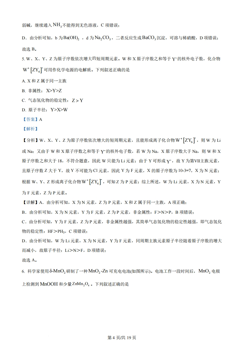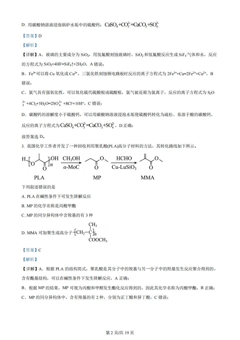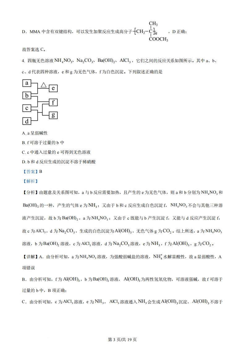 2024年普通高等学校招生全国统一考试(甲卷)理科综合能力测试注意事项:1答卷前,考生务必将自已的姓名、准考证号填写在答题卡上,并将自已的姓名、准考证号、座位号填写在本试卷上。2.回答选择题时,选出每小题答案后,用2B铅笔把答题卡上对应题目的答案标号涂黑;如需改动,用橡皮擦干净后,再选涂其他答案标号。涂写在本试卷上无效。3.作答非选释题时,将答案书写在答题卡上,书写在本试卷上无效。4考试结束后,将本试卷和答题卡一并交回。可能用到的相对原子质量:H1C12N14016S32Zn65Pb207一、选释题:本题共13小题,每小题6分,共78分。在每小题给出的四个选项中,只有一项是符合题目要求的。1.人类对能源的利用经历了柴薪、煤炭和石油时期,现正向新能源方向高质量发展。下列有关能源的叙述错误的是A.木材与煤均含有碳元素B.石油裂化可生产汽油C.燃料电池将热能转化为电能D.太阳能光解水可制氢【答案】C【解析】【详解】A.木材的主要成分为纤维素,纤维素中含碳、氢、氧三种元素,煤是古代植物埋藏在地下经历了复杂的变化逐渐形成的固体,是有机物和无机物组成的复杂混合物,主要含碳元素,A正确:B.石油裂化是将相对分子质量较大、沸点较高的烃断裂为相对分子质量较小、沸点较低的烃的过程,汽油的相对分子质量较小,可以通过石油裂化的方式得到,B正确:C.燃料电池是将燃料的化学能变成电能的装置,不是将热能转化为电能,C错误:D.在催化剂作用下,利用太阳能光解水可以生成氢气和氧气,D正确:故答案选C。2.下列过程对应的离子方程式正确的是A.用氢氟酸刻蚀玻璃:SiO+4F+6H=SiF,个+3H,OB.用三氯化铁溶液刻制覆铜电路板:2Fe+3Cu=3Cu2*+2FeC.用硫代硫酸钠溶液脱氯:S,O3+2C1,+3H,O=2S0?+4C+6H第1页供19页D.用碳酸钠溶液浸泡锅炉水垢中的硫酸钙:CSO,+=CaCO+SO【答案】D【解析】【详解】A.玻璃的主要成分为SO2,用氢氟酸刻蚀玻璃时,SiO2和氢氟酸反应生成SF4气体和水,反应的方程式为SiO2+4HF=SiF4↑+2H0,A错误:B.Fe+可以将Cu氧化成Cu2+,三氯化铁刻蚀铜电路板时反应的离子方程式为2Fe3+Cu=2Fe2+Cu2+,B错误:C.氯气具有强氧化性,可以氧化硫代硫酸根成硫酸根,氯气被还原为氯离子,反应的离子方程式为S2O3+4C+5H0=2S0+8C+10H,C错误:D.碳酸钙的溶解度小于硫酸钙,可以用碳酸钠溶液浸泡水垢使硫酸钙转化为疏松、易溶于酸的碳酸钙,反应的离子方程式为CaSO,+CO-CaCO,+SO,D正确:故答案选D。3.我国化学工作者开发了一种回收利用聚乳酸PLA)高分子材料的方法,其转化路线如下所示。H∫HCHOa-MoCCu-LuSiO:PLAMPMMA下列叙述错误的是A.PLA在碱性条件下可发生降解反应B.MP的化学名称是丙酸甲酯C.MP的同分异构体中含羧基的有3种CH3D.MA可加聚生成高分子fCH,-CnCOOCH【答案】C【解析】【详解】A.根据PLA的结构简式,聚乳酸是其分子中的羧基与另一分子中的羟基发生反应聚合得到的,含有酯基结构,可以在碱性条件下发生降解反应,A正确:B.根据MP的结果,MP可视为丙酸和甲醇发生酯化反应得到的,因此其化学名称为丙酸甲酯,B正确:C.MP的同分异构体中,含有羧基的有2种,分别为正丁酸和异丁酸,C错误:第2页供19页CH3D.MMA中含有双键结构,可以发生加聚反应生成高分子fCH,一C,D正确:COOCH3故答案选C。4.四瓶无色溶液NH,NO3Na,CO3、Ba(OH田2、AICl3,它们之间的反应关系如图所示。其中a、b、c、d代表四种溶液,e和g为无色气体,f为白色沉淀。下列叙述正确的是aebgdA.a呈弱碱性B.f可溶于过量的b中C.c中通入过量的e可得到无色溶液D.b和d反应生成的沉淀不溶于稀硝酸【答案】B【解析】【分析】由题意及关系图可知,a与b反应需要加热,且产生的e为无色气体,则a和b分别为NH,NO,和Ba(OH2的一种,产生的气体e为NH3:又由于b和c反应生成白色沉淀f,NH,NO,不会与其他三种溶液产生沉淀,故b为Ba(OH2,a为NH,NO,:又由于c既能与b产生沉淀f,又能与d反应产生沉淀f,故c为AICl,d为Na2CO3,生成的白色沉淀为AI(O田3,无色气体g为CO2。综上所述,a为NH,NO溶液,b为Ba(OH)2溶液,c为AICl,溶液,d为Na2CO3溶液,e为NH3,f为Al(OH3,g为CO2·【详解】A.由分析可知,a为NH,NO3溶液,为强酸弱碱盐的溶液,NH水解显酸性,故a显弱酸性,A项错误B.由分析可知,f为A(OH)3,b为B(OH)2溶液,AI(OH)3为两性氢氧化物,可溶液强碱,故f可溶于过量的b中,B项正确:C.由分析可知,c为AICl,溶液,e为NH3,AICl溶液通入NH3会生成AI(OH3沉淀,AI(OH3不溶于第3页供19页
