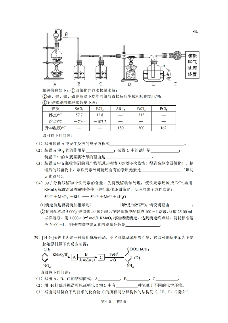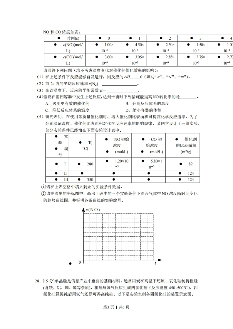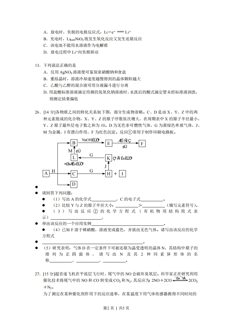 2009年高考试题一浙江理综化学部分7.下列说法正确的是A.蛋白质、纤维素、蔗糖、PVC、淀粉都是高分子化合物B.氢键在形成蛋白质二级结构和DNA双螺旋结构中起关键作用C.使用太阳能热水器、沼气的利用、玉米制乙醇都涉及到生物质能的利用D.石油、煤、天然气、可燃冰、植物油都属于化石燃料8.用NA表示阿伏加德罗常数的值,下列说法正确的是A.标准状况下,5.6LNO和5.6LO2混合后的分子总数为0.5NAB.1mol乙烷分子含有8Na个共价键C.58.5g氯化钠固体中含有Na个氯化钠分子D.在1L0.1mol/L碳酸钠溶液中,阴离子的总数大于0.1Na9.己知单位体积的稀溶液中,非挥发性溶质的分子或离子数越多,该溶液的沸点就越高。则下列溶液的沸点最高的是A.0.01molL的蔗糖溶液B.0.01mol/L的CaCl2溶液C.0.02mol/L的NaCl溶液D.0.02mol/L的CH.COOH溶液10.己知25℃时,K[Mg(OH2]=5.61×10-12,Ksp[MgF2]=7.42×10-11。下列说法正确的是A.25C时,饱和Mg(OH2溶液与饱和MgF2溶液相比,前者的cMg2+)大B.25C时,在Mg(OH2的悬浊液中加入少量的NHCI固体,cMg2+)增大C.25℃时,Mg(OH2固体在20mL0.01mol/L氨水中的Kp比在20mL0.01mol/LNH,CI溶液中的K小D.25C时,在Mg(OH2悬浊液中加入NaF溶液后,Mg(OH2不可能转化为MgF211.一种从植物中提取的天然化合物a一damascone可用于制作香水,其结构为:0义人个,有关该化合物的下列说法不正确的是A.分子式为C13H200B.该化合物可发生聚合反应C.1mol该化合物完全燃烧消耗19mol02D.与B2的CC4溶液反应生成的产物经水解、稀硝酸酸化后可用AgNO3溶液检验12.市场上经常见到的标记为Li一o的电池称为“锂离子电池”。它的负极材料是金属锂和碳的复合材料(碳作为金属锂的载体),电解质为一种能传导L+的高分子材料。这种锂离子电池的反应式为:Li+2Lio3gNiO,一A二2 PLiasNiO2.下列说法不正确的是ac第1页|共5页A.放电时,负极的电极反应式:Li一e~一Li计B.充电时,Lb8sNiO2既发生氧化反应又发生还原反应C.该电池不能用水溶液作为电解质D.放电过程中L+向负极移动13.下列说法正确的是A.仅用AgNO3溶液便可鉴别亚硝酸钠和食盐B.重结晶时,溶液冷却速度越慢得到的晶体颗粒越大C.乙酸与乙醇的混合液可用分液漏斗进行分离D.用盐酸标准溶液滴定待测的氢氧化钠溶液时,水洗后的酸式滴定管未经标准液润洗,侧测定结果偏低26.[14分]各物质之间的转化关系如下图,部分生成物省略。C、D是由X、Y、Z中的两种元素组成的化合物,X、Y、Z的原子序数依次增大,在周期表中X的原子半径最小,Y、Z原子最外层电子数之和为10。D为无色非可燃性气体,G为黄绿色单质气体,J、M为金属,I有漂白作用,F为红色沉淀。反应①常用于制作印刷电路板。BNaOHEEAINCdFM cULGK CA Ex的×0Ek白dJA HC间+回●D·请回答下列问题:(1)写出A的化学式,C的电子式●(2)比较Y与Z的原子半径大小:(填写元素符号)。●(3)写出反应②的化学方程式(有机物用结构简式表示)·举出该反应的一个应用实例·(4)己知F溶于稀硝酸,溶液变成蓝色,并放出无色气体。请写出该反应的化学方程式●●(5)研究表明:气体D在一定条件下可被还原为晶莹透明的晶体N,其结构中原子的排列为正四面体,请写出N及其2种同素异形体的名称27.[15分]超音速飞机在平流层飞行时,尾气中的NO会破坏臭氧层。科学家正在研究利用催化技术将尾气中的N0和C0转变成C0,和N2,其反应为2N0+2C0BA2CO2+N2为了测定在某种催化剂作用下的反应速率,在某温度下用气体传感器测得不同时间的第2页|共5页NO和CO浓度如表:●时间(s)●0●1234cNO)(mol/●1.00×●4.50×●2.50×●1.50×●1.00L)10-310-1010-10~c(COXmol/●3.60●3.05×●2.85×2.75×●2.7元L)10-310-310-310-310-3请回答下列问题(均不考虑温度变化对催化剂催化效率的影响):(1)在上述条件下反应能够自发进行,则反应的△H0(填写“>”、“<”、“=”).(2)前2s内的平均反应速率N2)=(3)在该温度下,反应的平衡常数K=(4)假设在密闭容器中发生上述反应,达到平衡时下列措施能提高NO转化率的是A.选用更有效的催化剂B.升高反应体系的温度C.降低反应体系的温度D.缩小容器的体积(5)研究表明:在使用等质量催化剂时,增大催化剂比表面积可提高化学反应速率。为了分别验证温度、催化剂比表面积对化学反应速率的影响规律,某同学设计了三组实验,部分实验条件己经填在下面实验设计表中。●NO初始CO初催化剂验●●浓度始浓度的比表面积编C●(mol/L)●号(mol/L)(m2g)●1.20×105.80x1●●280●3820-3●●●124●350●●●124①请在上表空格中填入剩余的实验条件数据。②请在给出的坐标图中,画出上表中的三个实验条件下混合气体中NO浓度随时间变化的趋势曲线图,并标明各条曲线的实验编号。◆c(NO)●028.[15分]单晶硅是信息产业中重要的基础材料。通常用炭在高温下还原二氧化硅制得粗硅(含铁、铝、硼、磷等杂质),粗硅与氯气反应生成四氯化硅(反应温度450~500℃),四氯化硅经提纯后用氢气还原可得高纯硅。以下是实验室制备四氯化硅的装置示意图。第3页|共5页