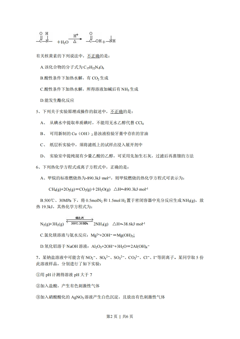 2010年高考理综化学试题(浙江卷)1、下列说法中正确的是A.光导纤维、棉花、油脂、ABS树脂都是由高分子化合物组成的物质B.开发核能、太阳能等新能源,推广基础甲醇汽油,使用无磷洗涤剂都可直接降低碳排放C.红外光谱仪、核磁共振仪、质谱仪都可用于有机化合物结构的分析D.阴极射线、α-粒子散射现象及布朗运动的发现都对原子结构模型的建立作出了贡献2、有X、Y、Z、W、M五种短周期元素,其中X、Y、Z、W同周期,Z、M同主族:X与MP具有相同的电子层结构:离子半径:Z2>W:Y的单质晶体熔点高、硬度大,是一种重要的半导体材料。下列说法中,正确的是A.X、M两种元素只能形成X2M型化合物B.由于W、Z、M元素的氢气化物相对分子质量依次减小,所以其沸点依次降低C.元素Y、Z、W的单质晶体属于同种类型的晶体D.元素W和M的某些单质可作为水处理中的消毒剂3、Li-AFS电池是一种正在开发的车载电池,该电池中正极的电极反应式为:2Li+FeS+2e-=Li2S+Fe有关该电池的下列中,正确的是A.Li-A1在电池中作为负极材料,该材料中Li的化合价为+1价B.该电池的电池反应式为:2Li+FeS=Li2S+FeC.负极的电极反应式为AI一3e-=AI3+D.充电时,阴极发生的电极反应式为:LiS+Fe一2e-=2Lit+Fes4、核黄素又称为维生素B2,可促进发育和细胞再生,有利于增进视力,减轻眼睛疲劳。核黄素分子的结构为:NHOHOH己知:第1页|共6页,oH++H20△有关核黄素的下列说法中,不正确的是:A.该化合物的分子式为C1H22NO6B.酸性条件下加热水解,有CO2生成C.酸性条件下加热水解,所得溶液加碱后有NH3生成D.能发生酯化反应5、下列关于实验原理或操作的叙述中,不正确的是:A、从碘水中提取单质碘时,不能用无水乙醇代替CC4B、可用新制的Cu(OH)2悬浊液检验牙膏中存在的甘油C、纸层析实验中,须将滤纸上的试样点浸入展开剂中D、实验室中提纯混有少量乙酸的乙醇,可采用先加生石灰,过滤后再蒸馏的方法6、下列热化学方程式或离子方程式中,正确的是:A、甲烷的标准燃烧热为-890.3kJmo1,则甲烷燃烧的热化学方程式可表示为:CH(g)+202(g)=C02(g)+2H2Og)△H=-890.3 kJ-mol-1B.500℃、30MPa下,将0.5molN2和1.5molH2置于密闭容器中充分反应生成NH(g),放热19.3kJ,其热化学方程式为:剂N2(g+3H2(g)500c302NH(g)△H=38.6kJmo1C.氯化镁溶液与氨水反应:Mg2+2OH-=Mg(OH2lD.氧化铝溶于NaOH溶液:Al2O3+2OH-+3H2O=2AI(OH4-7、某钠盐溶液中可能含有NO2、S02-、SO32-、C02-、C-、I-等阴离子。某同学取5份此溶液样品,分别进行了如下实验:①用pH计测得溶液pH大于②加入盐酸,产生有色刺激性气体③加入硝酸酸化的AgNO3溶液产生白色沉淀,且放出有色刺激性气体第2页|共6页④加足量BC2溶液,产生白色沉淀,该沉淀溶于稀硝酸且放出气体,将气体通入品红溶液,溶液不褪色⑤加足量BaC2溶液,产生白色沉淀,在滤液中加入酸化的(NH4)Fe(SO4)2溶液,再滴加KSCN溶液,显红色该同学最终确定在上述六种离子中仅含NO2~、C032-、C-三种阴离子。请分析,该同学只需要完成上述哪几个实验,即可得出此结论。A.①②④⑤B.③④C.③④⑤D.②③⑤8、洗车安全气囊是行车安全的重要保障。当车辆发生碰撞的瞬间,安全装置通电点火使其中的粉末分解释放出大量的氮气形成气囊,从而保护司机及乘客免受伤害。为研究安全气囊工作的化学原理,取安全装置中的固体粉末进行实验。经组成分析,确定该粉末仅Na、F©、N、O四种元素。水溶性试验表明,固体粉末部分溶解。经检测,可溶物为化合物甲:不溶物为红棕色固体,可溶于盐酸。取13.0g化合物甲,加热使其完全分解,生成氮气和单质乙,生成的氮气折合成标准状况下的体积为6.72L。单质乙就在高温隔绝空气的条件下与不溶物红棕色粉末反应生成化合物丙和另和一种单质。化合物丙与空气接触可转化为可溶性盐。请回答下列问题:(1)甲的化学方程式为,丙的电子式为(2)若丙在空气中转化为碳酸氢盐,则反应的化学方程式为」(3)单质乙与红棕色粉末发生反应的化学方程式为,安全气囊中红棕色粉末的作用是(4)以下物质中,有可能作为安全气囊中红棕色粉末替代品的是」A.KCI B.KNO C.NaS D.CuO(5)设计一个实验方案,探究化合物丙与空气接触后生成可溶性盐的成分(不考虑结晶水合物)9、己知:①25℃时弱电解质高电离平衡常数:K。(CH;COOH)=1.8×10-5,Ka(HSCN)=0.13:难溶电解质的溶度积学数:Kp(CF2)=1.5×10-10②25℃时,2.0×10-3molL1氢氟酸水溶液中,调节溶液pH(忽略体积变化),得到c(HF)、c(F)与溶液pH的变化关系,如下图所示:第3页|共6页