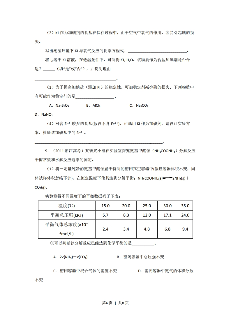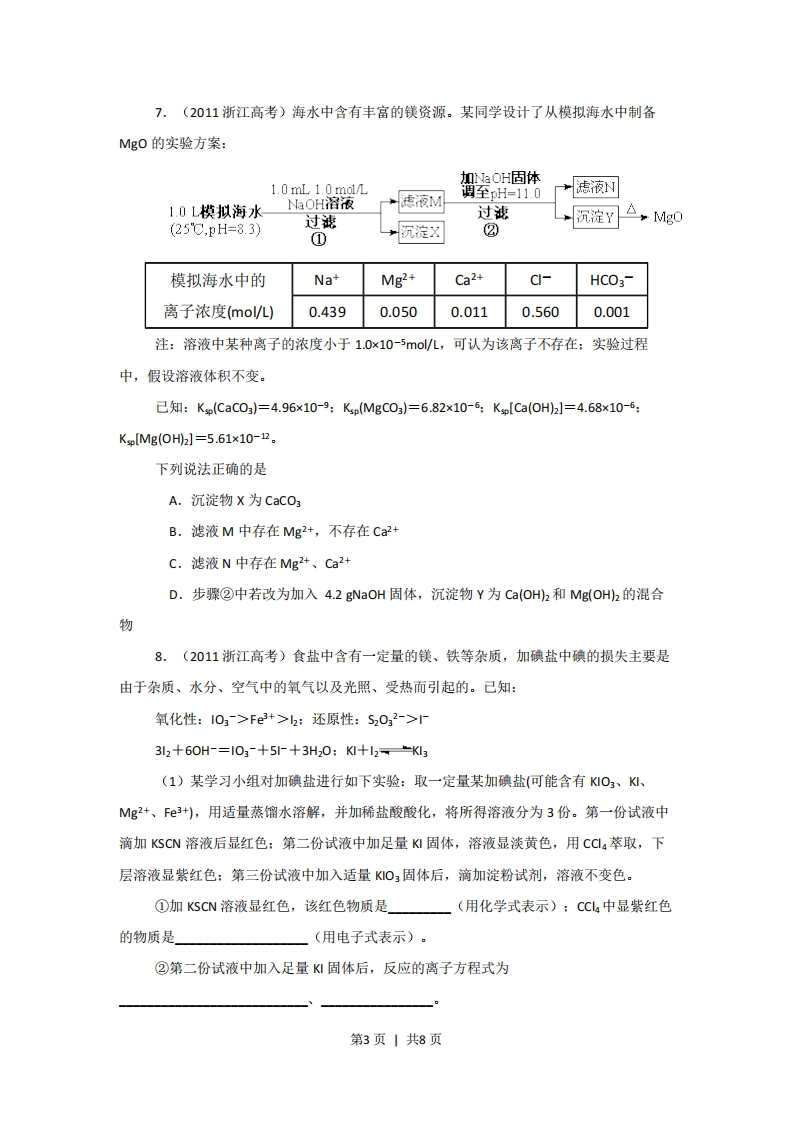 2011年高考浙江化学试题及答案1.(2011浙江高考)下列说法不正确的是A.化学反应有新物质生成,并遵循质量守恒定律和能量守恒定律B.原子吸收光谱仪可用于测定物质中的金属元素,红外光谱仪可用于测定化合物的官能团C.分子间作用力比化学键弱得多,但它对物质熔点、沸点有较大影响,而对溶解度无影响D.酶催化反应具有高效、专一、条件温和等特点,化学模拟生物酶对绿色化学、环境保护及节能减排具有重要意义2.(2011浙江高考)下列说法不正确的是A.变色硅胶干燥剂含有C0C2,干燥剂呈蓝色时,表示不具有吸水干燥功能B.硝基苯制备实验中,将温度计插入水浴,但水银球不能与烧杯底部和烧杯壁接触C.中和滴定实验中,容量瓶和锥形瓶用蒸馏水洗净后即可使用,滴定管和移液管用蒸馏水洗净后,必须干燥或润洗后方可使用D.除去干燥CO2中混有的少量SO2,可将混合气体依次通过盛有酸性KMO,溶液、浓硫酸的洗气瓶3.(2011浙江高考)X、Y、Z、M、W为五种短周期元素。X、Y、Z是原子序数依次递增的同周期元素,且最外层电子数之和为15,X与Z可形成Z2分子:Y与M形成的气态化合物在标准状况下的密度为0.76gL:W的质子数是X、Y、Z、M四种元素质子数之和的1/2。下列说法正确的是A.原子半径:W>Z>Y>X>MB.Z2、XzM2、WZ2均为直线型的共价化合物C.由X元素形成的单质不一定是原子晶体D.由X、Y、Z、M四种元素形成的化合物一定既有离子键,又有共价键4.(2011浙江高考)将Nac1溶液滴在一块光亮清洁的铁板表面上,一段时间后发现液滴覆盖的圆周中心区()己被腐蚀而变暗,在液滴外沿棕色铁锈环(b),如图所示。导致该现象的主要原因是液滴之下氧气含量比边缘少。下列说法正确的是A.液滴中的d-由a区向b区迁移第1页」共8页B.液滴边缘是正极区,发生的电极反应为:铁锈环)02+2H20+4e-=40H腐蚀区()C.液滴下的Fe因发生还原反应而被腐蚀,生成的Fe2+由a区向b区迁移,与b区的O什形成Fe(OH2,进一步氧化、脱水形成铁锈D.若改用嵌有一铜螺丝钉的铁板,在铜铁接触处滴加NaC溶液,则负极发生的电极反应为Cu一2e-=Cu2+5.(2011浙江高考)褪黑素是一种内源性生物钟调节剂,在人体内由食物中的色氨酸转化得到。HHNH2CH2CHCOOHCHCH NH-CCH3色氨酸褪黑素下列说法不正确的是A。色氨酸分子中存在氨基和羧基,可形成内盐,具有较高的熔点B.在色氨酸水溶液中,可通过调节溶液的pH使其形成晶体析出C.在一定条件下,色氨酸可发生缩聚反应D.褪黑素与色氨酸结构相似,也具有两性化合物的特性6.(2011浙江高考)下列说法不正确的是A.己知冰的熔化热为6.0kJ/mol,冰中氢键键能为20k/mol,假设1mol冰中有2mo氢键,且熔化热完全用于破坏冰的氢键,则最多只能破坏冰中15%的氢键Ka(ca)2B。己知一定温度下,醋酸溶液的物质的量浓度为c,电离度为α,c1-),若加入少量醋酸钠固体,则CH3CO0H一CH3C00-十H+向左移动,a减小,K。变小C.实验测得环己烷()、环己烯()和苯(0的标准燃烧热分别为一3916k/mol、一3747kJ/mol和一3265kJ/mol,可以证明在苯分子中不存在独立的碳碳双键D.己知:Fe203(s)+3C(石墨)=2Fe(s)+3c0g),△H=+489.0kJ/mol.c0g)+20z(g)=C02(g,△H=-283.0kJ/mol:c(石墨)+02(g)=C02g,△H=-393.5k/mol:则4Fe(s)+30(g=2Fe203(S),△H=-1641.0kJ/mol第2页」共8页7.(2011浙江高考)海水中含有丰富的镁资源。某同学设计了从模拟海水中制备MgO的实验方案:加aOH固体1.0 mL 1.0 mol/L滤液N1.0L摸拟海水NaOH溶液滤液调至pH=11.0过滤过滤沉淀Y△,MgO(25℃,pH=8.3)①沉淀X②模拟海水中的Na+Mg2+Ca2+cl-HCO3-离子浓度(mo/L)0.4390.0500.0110.5600.001注:溶液中某种离子的浓度小于1.0×10-5mol/儿,可认为该离子不存在:实验过程中,假设溶液体积不变。己知:Kp(CaC03)=4.96×10-9:Kp(MgC03)=6.82x10-6 Ksp[Ca(0H2]=4.68×10-6:Ksp[Mg(OH2l=5.61×10-2。下列说法正确的是A.沉淀物X为CaCO3B.滤液M中存在Mg2+,不存在Ca2+C.滤液N中存在Mg2+、Ca2+D.步骤②中若改为加入4.2 gNaOH固体,沉淀物Y为Ca(OH2和MgOH2的混合物8.(2011浙江高考)食盐中含有一定量的镁、铁等杂质,加碘盐中碘的损失主要是由于杂质、水分、空气中的氧气以及光照、受热而引起的。己知:氧化性:I103>Fe3+>2:还原性:S2032->32+60H-=I03-+5F+3H20:K1+l2Kl3(1)某学习小组对加碘盐进行如下实验:取一定量某加碘盐(可能含有KIO3、K、Mg2+、F3+),用适量蒸馏水溶解,并加稀盐酸酸化,将所得溶液分为3份。第一份试液中滴加KSCN溶液后显红色:第二份试液中加足量K固体,溶液显淡黄色,用CC,萃取,下层溶液显紫红色:第三份试液中加入适量KO3固体后,滴加淀粉试剂,溶液不变色。①加KSCN溶液显红色,该红色物质是」一(用化学式表示):cC中显紫红色的物质是(用电子式表示)。②第二份试液中加入足量KI固体后,反应的离子方程式为第3页1共8页