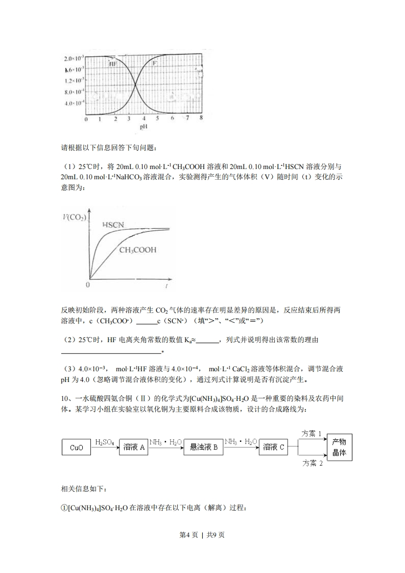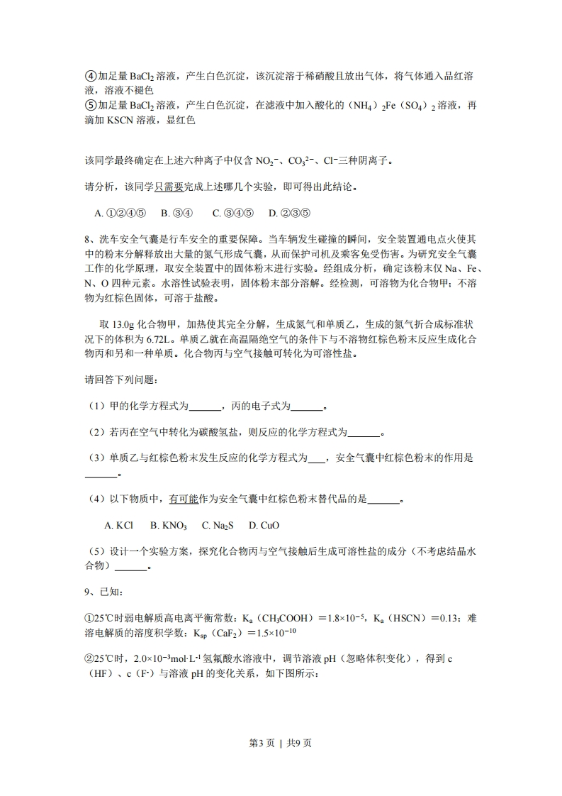 2010年高考理综化学试题(浙江卷)1、下列说法中正确的是A.光导纤维、棉花、油脂、ABS树脂都是由高分子化合物组成的物质B.开发核能、太阳能等新能源,推广基础甲醇汽油,使用无磷洗涤剂都可直接降低碳排放C.红外光谱仪、核磁共振仪、质谱仪都可用于有机化合物结构的分析D.阴极射线、α-粒子散射现象及布朗运动的发现都对原子结构模型的建立作出了贡献2、有X、Y、Z、W、M五种短周期元素,其中X、Y、Z、W同周期,Z、M同主族:X与MP具有相同的电子层结构:离子半径:Z2>W:Y的单质晶体熔点高、硬度大,是一种重要的半导体材料。下列说法中,正确的是A.X、M两种元素只能形成X2M型化合物B.由于W、Z、M元素的氢气化物相对分子质量依次减小,所以其沸点依次降低C.元素Y、Z、W的单质晶体属于同种类型的晶体D.元素W和M的某些单质可作为水处理中的消毒剂3、Li-AFS电池是一种正在开发的车载电池,该电池中正极的电极反应式为:2Li+FeS+2e-=Li2S+Fe有关该电池的下列中,正确的是A.Li-A1在电池中作为负极材料,该材料中Li的化合价为+1价B.该电池的电池反应式为:2Li+FeS=Li2S+FeC.负极的电极反应式为AI一3e-=AI3+D.充电时,阴极发生的电极反应式为:LiS+Fe一2e-=2Lit+Fes4、核黄素又称为维生素B2,可促进发育和细胞再生,有利于增进视力,减轻眼睛疲劳。核黄素分子的结构为:NHOHOH己知:第1页|共9页,oH++H20△有关核黄素的下列说法中,不正确的是:A.该化合物的分子式为C1H22NO6B.酸性条件下加热水解,有CO2生成C.酸性条件下加热水解,所得溶液加碱后有NH3生成D.能发生酯化反应5、下列关于实验原理或操作的叙述中,不正确的是:A、从碘水中提取单质碘时,不能用无水乙醇代替CC4B、可用新制的Cu(OH)2悬浊液检验牙膏中存在的甘油C、纸层析实验中,须将滤纸上的试样点浸入展开剂中D、实验室中提纯混有少量乙酸的乙醇,可采用先加生石灰,过滤后再蒸馏的方法6、下列热化学方程式或离子方程式中,正确的是:A、甲烷的标准燃烧热为-890.3kJmo1,则甲烷燃烧的热化学方程式可表示为:CH(g)+202(g)=C02(g)+2H2Og)△H=-890.3 kJ-mol-1B.500℃、30MPa下,将0.5molN2和1.5molH2置于密闭容器中充分反应生成NH(g),放热19.3kJ,其热化学方程式为:剂N2(g+3H2(g)500c302NH(g)△H=38.6kJmo1C.氯化镁溶液与氨水反应:Mg2+2OH-=Mg(OH2lD.氧化铝溶于NaOH溶液:Al2O3+2OH-+3H2O=2AI(OH4-7、某钠盐溶液中可能含有NO2、S02-、SO32-、C02-、C-、I-等阴离子。某同学取5份此溶液样品,分别进行了如下实验:①用pH计测得溶液pH大于②加入盐酸,产生有色刺激性气体③加入硝酸酸化的AgNO3溶液产生白色沉淀,且放出有色刺激性气体第2页|共9页④加足量BC2溶液,产生白色沉淀,该沉淀溶于稀硝酸且放出气体,将气体通入品红溶液,溶液不褪色⑤加足量BaC2溶液,产生白色沉淀,在滤液中加入酸化的(NH4)Fe(SO4)2溶液,再滴加KSCN溶液,显红色该同学最终确定在上述六种离子中仅含NO2~、C032-、C-三种阴离子。请分析,该同学只需要完成上述哪几个实验,即可得出此结论。A.①②④⑤B.③④C.③④⑤D.②③⑤8、洗车安全气囊是行车安全的重要保障。当车辆发生碰撞的瞬间,安全装置通电点火使其中的粉末分解释放出大量的氮气形成气囊,从而保护司机及乘客免受伤害。为研究安全气囊工作的化学原理,取安全装置中的固体粉末进行实验。经组成分析,确定该粉末仅Na、F©、N、O四种元素。水溶性试验表明,固体粉末部分溶解。经检测,可溶物为化合物甲:不溶物为红棕色固体,可溶于盐酸。取13.0g化合物甲,加热使其完全分解,生成氮气和单质乙,生成的氮气折合成标准状况下的体积为6.72L。单质乙就在高温隔绝空气的条件下与不溶物红棕色粉末反应生成化合物丙和另和一种单质。化合物丙与空气接触可转化为可溶性盐。请回答下列问题:(1)甲的化学方程式为,丙的电子式为(2)若丙在空气中转化为碳酸氢盐,则反应的化学方程式为」(3)单质乙与红棕色粉末发生反应的化学方程式为,安全气囊中红棕色粉末的作用是(4)以下物质中,有可能作为安全气囊中红棕色粉末替代品的是」A.KCI B.KNO C.NaS D.CuO(5)设计一个实验方案,探究化合物丙与空气接触后生成可溶性盐的成分(不考虑结晶水合物)9、己知:①25℃时弱电解质高电离平衡常数:K。(CH;COOH)=1.8×10-5,Ka(HSCN)=0.13:难溶电解质的溶度积学数:Kp(CF2)=1.5×10-10②25℃时,2.0×10-3molL1氢氟酸水溶液中,调节溶液pH(忽略体积变化),得到c(HF)、c(F)与溶液pH的变化关系,如下图所示:第3页|共9页