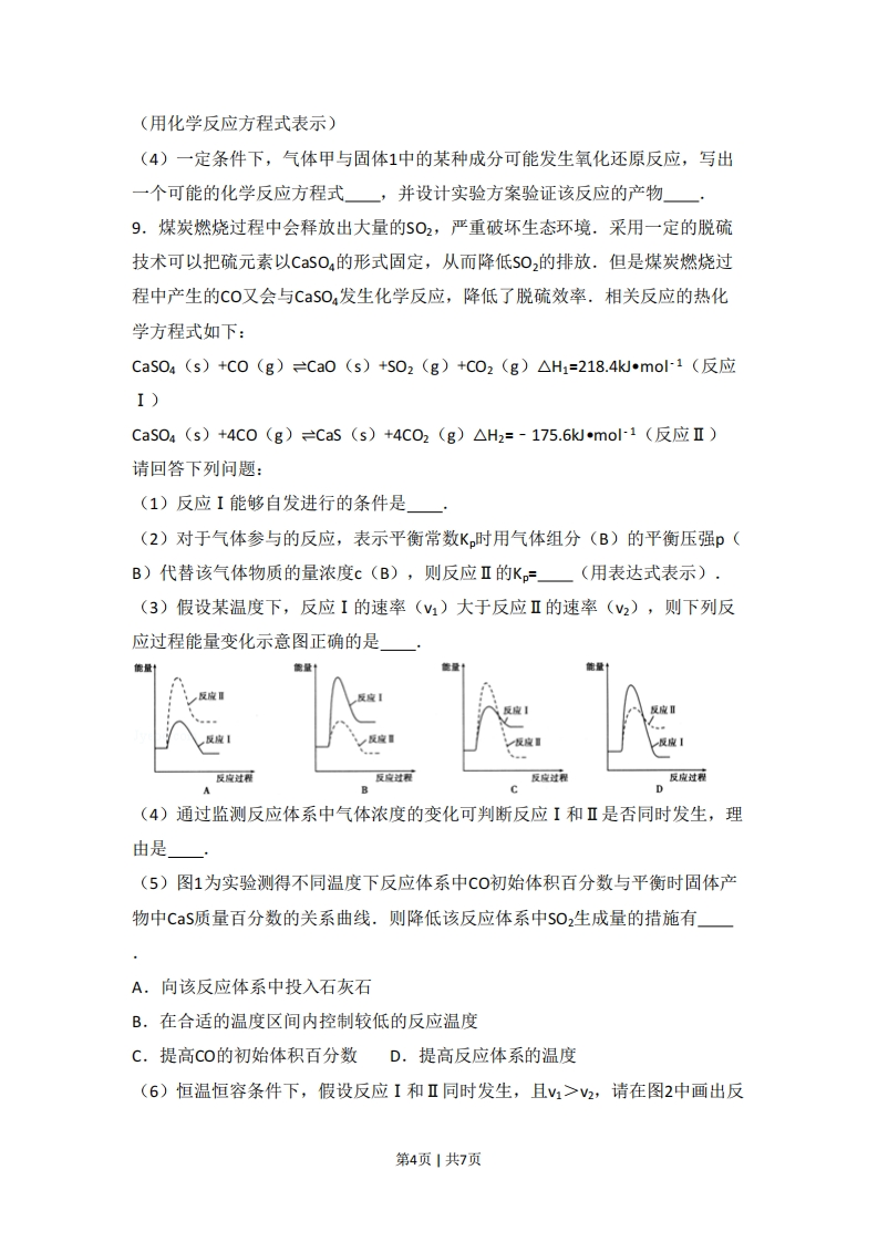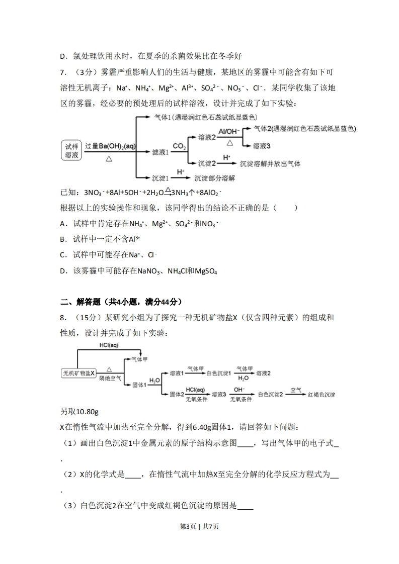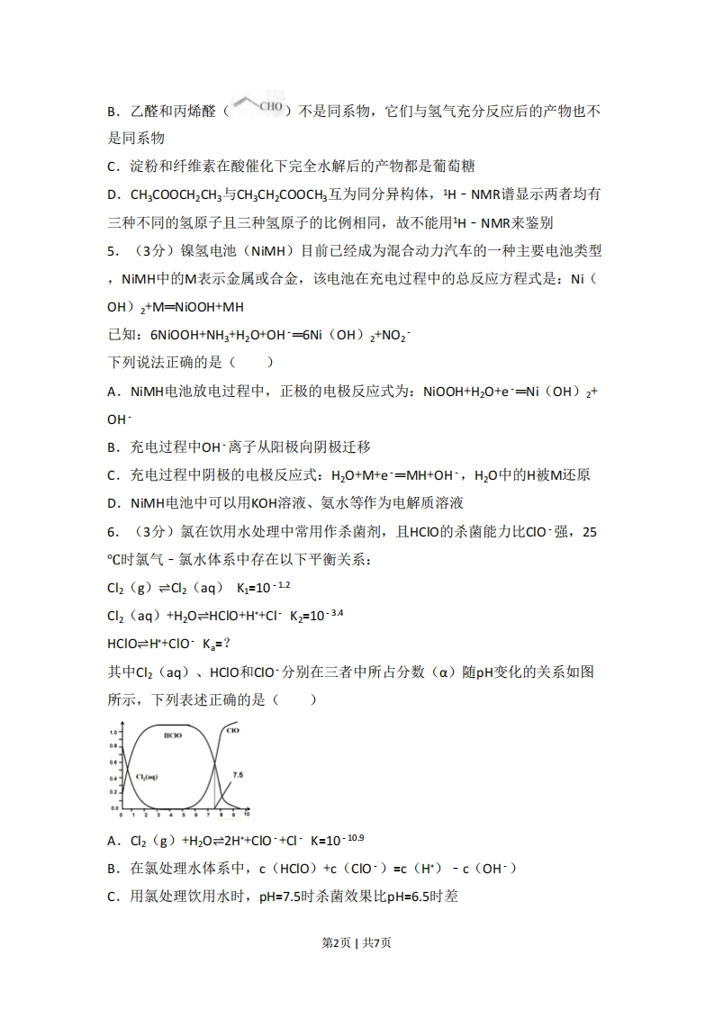 2014年浙江省高考化学试卷一、选择题(共7小题,每小题3分,满分21分)1.(3分)下列说法不正确的是()A.光催化还原水制氢比电解水制氢更节能环保、更经济B.氨氮废水(含NH4及NH3)可用化学氧化法或电化学氧化法处理C,某种光学检测技术具有极高的灵敏度,可检测到单个细胞(V10~12L)内的数个目标分子,据此可推算该检测技术能检测细胞内浓度约为10-12-10-11mol·L1的目标分子D.向汽油中添加甲醇后,该混合燃料的热值不变2.(3分)下列说法正确的是()A.金属汞一旦酒落在实验室地面或桌面时,必须尽可能收集,并深埋处理B.用H计、电导率仪(一种测量溶液导电能力的仪器)均可监测乙酸乙酯的水解程度C,邻苯二甲酸氢钾可用于标定NaOH溶液的浓度,假如称量邻苯二甲酸氢钾时电子天平读数比实际质量偏大,则测得的NaOH溶液浓度比实际浓度偏小D.向某溶液中加入茚三铜试剂,加热煮沸后溶液若出现蓝色,则可判断该溶液含有蛋白质3.(3分)如图所示的五中元素中,W、X、Y、Z为短周期元素,这四种元素的原子最外层电子数之和为22,下列说法正确的是()A.X、Y、Z三种元素最低价氢化物的沸点依次升高B.由X、Y和氢三种元素形成的化合物中只有共价键C.物质WY2,W3X4,WZ均有熔点高,硬度大的特性D.T元素的单质具有半导体的特性,T与Z元素可形成化合物TZ4.(3分)下列说法正确的是()A.乳酸薄荷醇酯(子之)仅能发生水解、氧化、消去反应第1页1共7页B.乙醛和丙烯醛(个0)不是同系物,它们与氢气充分反应后的产物也不是同系物C,淀粉和纤维素在酸催化下完全水解后的产物都是葡萄糖D.CH3 COOCH2CH3与CH3CH2 COOCH3互为同分异构体,H-NMR谱显示两者均有三种不同的氢原子且三种氢原子的比例相同,故不能用H-NMR来鉴别5.(3分)镍氢电池(NMH)目前已经成为混合动力汽车的一种主要电池类型,NiMH中的M表示金属或合金,该电池在充电过程中的总反应方程式是:Ni(OH)2+M-NiOOH+MH已知:6 NiOOH+NH3tH2O+OH=6Ni(OH)2tNO2下列说法正确的是()A.NiMH电池放电过程中,正极的电极反应式为:NiOOH+H2O+e=Ni(OH)2tOHB.充电过程中OH~离子从阳极向阴极迁移C.充电过程中阴极的电极反应式:H2O+M什e=MH+OH,H2O中的H被M还原D.NiMH电池中可以用KOH溶液、氨水等作为电解质溶液6.(3分)氯在饮用水处理中常用作杀菌剂,且HCIO的杀菌能力比CI0~强,25℃时氯气-氯水体系中存在以下平衡关系:Cl2(g)=Cl2(aq)K1=10-1.2Cl2 (aq)+H2OHCIO+H*+CI-K2=10-34HCIO-H'+CIO-K=?其中Cl2(ag)、HCIo和Cl0分别在三者中所占分数(a)随pH变化的关系如图所示,下列表述正确的是()10QB-16A.Cl2(g)+H20=2H+C10~+C-K=10-10.9B.在氯处理水体系中,c(HCIO)+c(CIO)=C(H)-c(OH)C,用氯处理饮用水时,pH=7.5时杀菌效果比pH=6.5时差第2页1共7页D.氯处理饮用水时,在夏季的杀菌效果比在冬季好7.(3分)雾霾严重影响人们的生活与健康,某地区的雾霾中可能含有如下可溶性无机离子:Na°、NHa、Mg2、AB、S02、NO3、C,某同学收集了该地区的雾霾,经必要的预处理后的试样溶液,设计并完成了如下实验:气体1(遇湿润红色石蕊试纸显蓝色)气体2(遇湿润红色石蕊试纸显蓝色)溶液2试样过量Ba(OH)z(aqCO.△·溶液3溶液滤液1△H一沉淀2→沉淀溶解并放出气体H◆沉淀1→沉淀部分溶解己知:3NO3+8AI+5OH+2H203NH3个+8AIO2根据以上的实验操作和现象,该同学得出的结论不正确的是()A.试样中肯定存在NH4、Mg2、S0a2-和NO3B.试样中一定不含A3C.试样中可能存在Na、CD.该雾霾中可能存在NaNO3、NHCI和MgSOa二、解答题(共4小题,满分44分)8.(15分)某研究小组为了探究一种无机矿物盐X(仅含四种元素)的组成和性质,设计并完成了如下实验:HCK(aq)气体甲无机矿物盐X溶液1溶液2隔绝空气色沉淀1气体甲体1生0HOOH-固体2HCKaq)液3白色沉淀2空气红褐色沉淀无氧条件无氧条件另取10.80gX在惰性气流中加热至完全分解,得到6.40g固体1,请回答如下问题:(1)画出白色沉淀1中金属元素的原子结构示意图,写出气体甲的电子式(2)X的化学式是,在惰性气流中加热X至完全分解的化学反应方程式为(3)白色沉淀2在空气中变成红褐色沉淀的原因是第3页1共7页