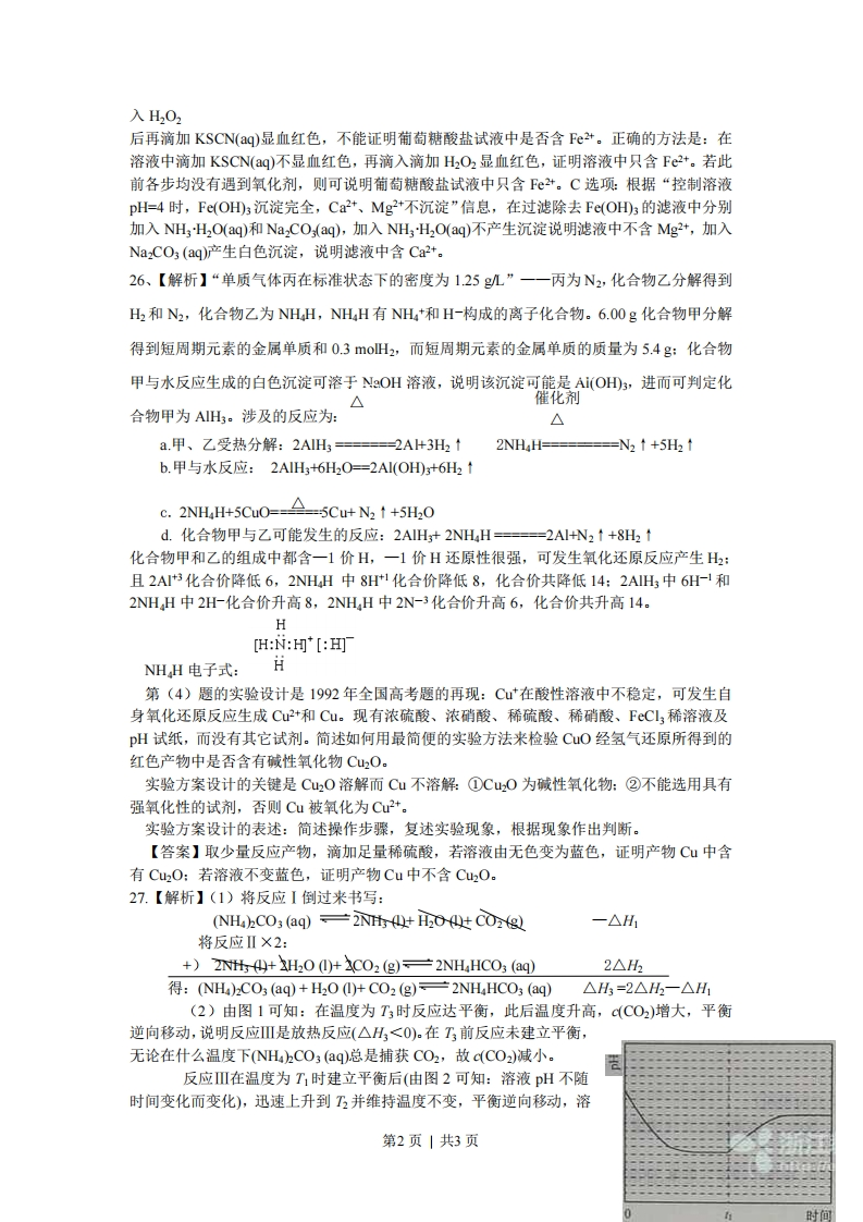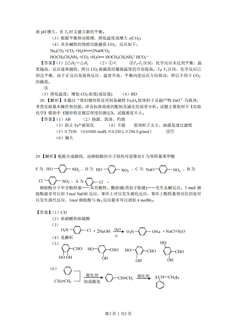 2013年浙江高考化学试卷参考答案7、B【解析】A选项:氢氧燃料电池要求电极必须多孔具有很强的吸附能力,并具一定的催化作用,同时增大气固的接触面积,提高反应速率。C选项:As和P同主族。甲基环氧乙烷与二氧化碳在一定条件下反应生成聚碳酸酯,原子利用率达到100%,生成的聚碳酸酯易降解生成无毒无害物质,所以此反应符合绿色化学原则。B选项:pH计可用于酸碱中和滴定终点的判新。8、C【解析】A选项:实验室从海带提取单质碘缺少了氧化过程,萃取后还要分液。B选项:用乙醇和浓HSO,制备乙烯时必须使温度迅速提高至约170℃,不可能是水浴加热(水浴加热温度最高只能达到100℃)。D选项:蛋白质溶液中加入饱和NH)2SO4溶液发生盐析(盐析是可逆过程,不破坏蛋白质的生理活性,加水后又溶解),蛋白质溶液中加入CuSO,等重金属盐溶液变性析出(变性是不可逆过程,蛋白质失去了生理活性,加水不再溶解)。C选项:通常认为是C一替换氧化铝中的O2-而形成可溶性的氯化物,所以铝表面的氧化膜易被C-破坏。9、A【解析】由“X元素的原子内层电子数是最外层电子数的一半”可推出X为C,因此Y为O,Z为Si,W为S,Q为Cl。A选项:Na和S可形成类似于NaO2的NaS2。Z与Y组成的物质是SO2,SiO2是原子晶体,熔融时不能导电。C选项S得电子能力比CI弱。D选项:C、O元素都能形成多种同素异形体。10、D【解析】A选项:题给化会物正确的名称为2,2,4,5-四甲基-3,3-二乙基己烷。B选项:苯甲酸的分子式为CHO2,榜货子式变形为CH6C02,因此等物质的量的苯和苯甲酸完全燃烧消耗氧气的量相等。C选项:苯不能使酸性高锰酸钾溶液褪色。11、D【解析】电解的电极反应为:阳极2-一2e-=2左侧溶液变蓝色32+60H=I03+5-+3H20一段时间后,蓝色变浅阴离子交换膜向右侧移动阴极2H0+2e-=H2↑+2OH右侧放出氢气如果用阳离子交换膜代替阴离子交换膜:电极反应为:阳极2-一2e-=2多余K↓通过阳离子交换膜迁移至阴极阴极2H20+2e-=H2↑+2OH保证两边溶液呈电中性12、B【解析】浓度均为0.1000mol/L的三种酸HX、HY、HZ,根据滴定曲线0点三种酸的pH可得到HZ是强酸,HY和HX是弱酸,但酸性:HY>HX。因此,同温同浓度时,三种酸的导电性:HZ>HY>HX。B选项:当NaOH溶液滴加到10mL时,溶液中cHY)≈cY-),即KHY)≈cH)=10一p=10一5。C选项:用NaOH溶液滴定至HX恰好完全反应时,Y早被完全中和,所得溶液是NaY和NaX混合溶液,但因酸性Y>HX,即X-的水解程度大于Y-,溶液中c(Y-)>cX一)。D选项:HY与HZ混合,溶液的电荷守恒式为:C(H+c(Y-+c(亿-一)+c(OH),又根据HY的电离平衡常数:dH)dY)K (HY).c(HY)K (HY)=c(HY)即有:cY-dH)所以达平衡后:cHFK(HY).c(HY)+c(Z-)+dOH-)c(H)13、C【解析】A选项:因m入了NaOH(aq)和Na2CO,(aq),在滤液中引入了Na*,不能根据滤液焰色反应的黄色火焰判断试液是否含Na。B选项:试液是葡萄糖酸盐溶液,其中一定含葡萄糖酸根,葡萄糖能发生银镜反应,葡萄糖酸根不能发生银镜反应。D选项溶液加第1页|共3页入H202后再滴加KSCN(aq)显血红色,不能证明葡萄糖酸盐试液中是否含Fe2+。正确的方法是:在溶液中滴加KSCN(q)不显血红色,再滴入滴加HO2显血红色,证明溶液中只含Fe2+。若此前各步均没有遇到氧化剂,则可说明葡萄糖酸盐试液中只含F©2+。C选项:根据“控制溶液pH=4时,Fe(OHD3沉淀完全,Ca2+、Mg2+不沉淀”信息,在过滤除去Fe(OD3的滤液中分别加入NH3H2O(aq)和NaCO:(aq),加入NH3H2O(aq)不产生沉淀说明滤液中不含Mg2+,加入Na2CO3(aq)产生白色沉淀,说明滤液中含Ca2+。26、【解析】“单质气体丙在标准状态下的密度为125gL”一一丙为N2,化合物乙分解得到H2和N2,化合物乙为NHH,NHH有NH+和H-构成的离子化合物。6.00g化合物甲分解得到短周期元素的金属单质和0.3moH2,而短周期元素的金属单质的质量为5.4g:化合物甲与水反应生成的白色沉淀可溶于NOH溶液,说明该沉淀可能是A(OH3,进而可判定化催化剂合物甲为AH3。涉及的反应为:△a.甲、乙受热分解:2AIH3=====2A+3H2↑2NHH==N2↑+5H2↑b.甲与水反应:2AIH3+6H2O2AI(OHD3+6H2↑c.2NH,H+5Cu0=_△=5C+N2↑+5H,0d.化合物甲与乙可能发生的反应:2AIH+2NHH--2Al+N2↑+8H2↑化合物甲和乙的组成中都含一1价H,一1价H还原性很强,可发生氧化还原反应产生H2:且2AI3化合价降低6,2NHH中8H1化合价降低8,化合价共降低14:2AIH3中6H-1和2NHH中2H-化合价升高8,2NHH中2N-3化合价升高6,化合价共升高14。H[H:N:可[:玎NHH电子式:第(4)题的实验设计是1992年全国高考题的再现:C在酸性溶液中不稳定,可发生自身氧化还原反应生成Cu2+和Cu。现有浓硫酸、浓硝酸、稀硫酸、稀硝酸、FCL3稀溶液及pH试纸,而没有其它试剂。简述如何用最简便的实验方法来检验CuO经氢气还原所得到的红色产物中是否含有碱性氧化物C20。实验方案设计的关键是Cu20溶解而Cu不溶解:①Cu20为碱性氧化物:②不能选用具有强氧化性的试剂,否则Cu被氧化为Cu+。实验方案设计的表述:简述操作步骤,复述实验现象,根据现象作出判断。【答案】取少量反应产物,滴加足量稀硫酸,若溶液由无色变为蓝色,证明产物C中含有C2O:若溶液不变蓝色,证明产物Cu中不含C20.27.【解析】(1)将反应I倒过来书写:(NH)CO3 (aq)2NH ()H20+CO2(g)-△H1将反应Ⅱ×2:+)2NH+2H200)+2CO2(g)=2NHHC03(aq)2△H得:(NH)zCO3(aq)+HO+CO2(g)=2 NHHCO3(aq)△H3=2△H2-△H1(2)由图1可知:在温度为T3时反应达平衡,此后温度升高,(CO2)增大,平衡逆向移动,说明反应Ⅲ是放热反应(△H3<0).在T前反应未建立平衡,无论在什么温度下(NHa)CO3(aq)总是捕获CO2,故c(CO2)减小。反应Ⅲ在温度为T时建立平衡后(由图2可知: