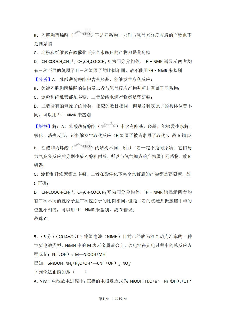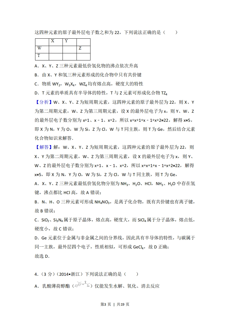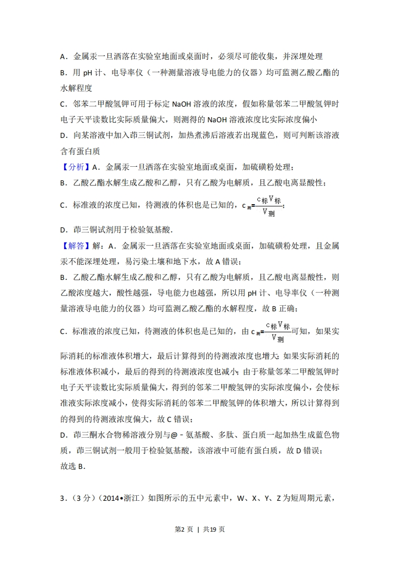 2014年浙江省高考化学试卷◆考答案与试题解析一、选择题(共7小题,每小题3分,满分21分)1.(3分)(2014·浙江)下列说法不正确的是()A.光催化还原水制氢比电解水制氢更节能环保、更经济B.氨氮废水(含NHa'及NH3)可用化学氧化法或电化学氧化法处理C.某种光学检测技术具有极高的灵敏度,可检测到单个细胞(V≈10~12L)内的数个目标分子,据此可推算该检测技术能检测细胞内浓度约为10-12-10-1moL-1的目标分子D.向汽油中添加甲醇后,该混合燃料的热值不变【分析】A.电解消耗电能,而光催化还原水制氢可利用太阳能:B.氨氮废水中N为-3价,可利用氧化还原反应原理转化为无毒物质:C.可检测到单个细胞(V≈1012L)内的数个目标分子,结合c=计算:D.汽油与甲醇均可燃烧,且热值不同.【解答】解:A.电解消耗电能,而光催化还原水制氢可利用太阳能,前者浪费能源,则光催化还原水制氢比电解水制氢更节能环保、更经济,故A正确:B,氨氮废水中N为-3价,可利用氧化还原反应原理发生氧化反应转化为无毒物质,所以可用化学氧化法或电化学氧化法处理,故B正确:C.可检测到单个细胞(V≈1012L)内的数个目标分子,体积为1012L,设数个N分子为N,则即该检测技术能检测细胞内浓度为5.02X102501一,N可能介于10-1211~10之间,则约为102-10-11molL1的目标分子,故C正确:D.汽油与甲醇均可燃烧,且热值不同,则向汽油中添加甲醇后,该混合燃料的热值发生变化,故D错误:故选D.2.(3分)(2014浙江)下列说法正确的是()第1页|共19页A.金属汞一旦酒落在实验室地面或桌面时,必须尽可能收集,并深埋处理B.用pH计、电导率仪(一种测量溶液导电能力的仪器)均可监测乙酸乙酯的水解程度C,邻苯二甲酸氢钾可用于标定NaOH溶液的浓度,假如称量邻苯二甲酸氢钾时电子天平读数比实际质量偏大,则测得的NOH溶液浓度比实际浓度偏小D,向某溶液中加入茚三铜试剂,加热煮沸后溶液若出现蓝色,则可判断该溶液含有蛋白质【分析】A,金属汞一旦洒落在实验室地面或桌面,加硫磺粉处理:B,乙酸乙酯水解生成乙酸和乙醇,只有乙酸为电解质,且乙酸电离显酸性:C.标准液的浓度已知,待测液的体积也是已知的,c=c标V标V则D.茚三铜试剂用于检验氨基酸,【解答】解:A.金属汞一旦洒落在实验室地面或桌面,加硫磺粉处理,且金属汞不能深埋处理,易污染土壤和地下水,故A错误:B.乙酸乙酯水解生成乙酸和乙醇,只有乙酸为电解质,且乙酸电离显酸性,则乙酸浓度越大,酸性越强,导电能力也越强,所以用p州计、电导率仪(一种测量溶液导电能力的仪器)均可监测乙酸乙酯的水解程度,故B正确:C.标准液的浓度已知,待测液的体积也是已知的,由c=标V标可知,如果实V则际消耗的标准液体积增大,最后计算得到的待测液浓度也增大如果实际消耗的标准液体积减小,最后的得到的待测液浓度也减小:由于称量邻苯二甲酸氢钾时电子天平读数比实际质量偏大,得到的邻苯二甲酸氢钾的实际浓度偏小,会使标准液实际浓度减小,使得实际消耗的邻苯二甲酸氢钾的体积增大,所以计算得到的得到的待测液浓度偏大,故C错误:D.茚三酮水合物稀溶液分别与@-氨基酸、多肽、蛋白质一起加热生成蓝色物质,茚三铜试剂一般用于检验氨基酸,该溶液中可能有蛋白质,故D错误:故选B。3.(3分)(2014•浙江)如图所示的五中元素中,W、X、Y、Z为短周期元素,第2页|共19页这四种元素的原子最外层电子数之和为22,下列说法正确的是()公A.X、Y、Z三种元素最低价氢化物的沸点依次升高B.由X、Y和氢三种元素形成的化合物中只有共价键C.物质WY2,W3X,WZ均有熔点高,硬度大的特性D.T元素的单质具有半导体的特性,T与Z元素可形成化合物TZ【分析】W、X、Y、Z为短周期元素,这四种元素的原子最外层为22,则X、Y为第二周期元素,W、Z为第三周期元素,设X的最外层电子为x,则Y、W、Z的最外层电子数分别为x+1、×-1、x+2,所以x+x+1+×-1+x+2=22,解得x=5,即X为N,Y为O,W为Si,Z为C,W与T同主族,则T为Ge,然后结合元素化合物知识来解答,【解答】解:W、X、Y、Z为短周期元素,这四种元素的原子最外层为22,则X、Y为第二周期元素,W、Z为第三周期元素,设X的最外层电子为x,则Y、W、Z的最外层电子数分别为x+1、×-1、x+2,所以x+x+1+x-1+x+2=22,解得x=5,即X为N,Y为O,W为Si,Z为Cl,W与T同主族,则T为Ge,A.X、Y、Z三种元素最低价氢化物分别为NH3、H2O、HCl,NH3、H2O中存在氢键,沸点都比HCI高,故A错误:B.N、H、O三种元素可形成NH4NO3,是离子化合物,既有共价键也有离子键,故B错误;C.SiO2、SN4属于原子晶体,熔点高,硬度大,而SiC4属于分子晶体,熔点低,硬度小,故C错误:D.Ge元素位于金属与非金属之间的分界线,因此具有半导体的特性,与碳属于同一主族,最外层四个电子,性质相似,可形成GeC4,故D正确:故选D.4.(3分)(2014·浙江)下列说法正确的是()A.乳酸薄荷醇酯(户之)仅能发生水解、氧化、消去反应第3页|共19页