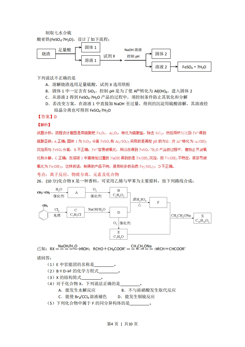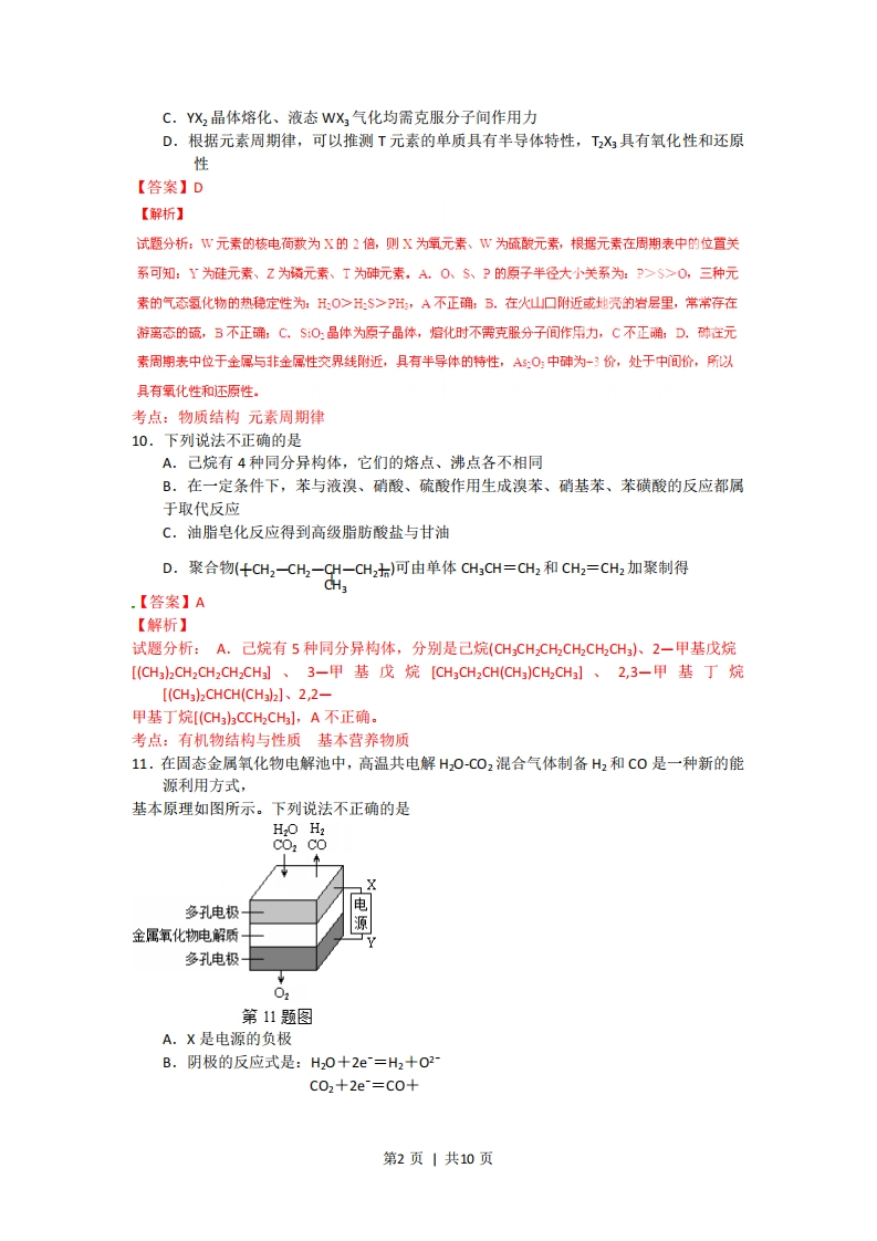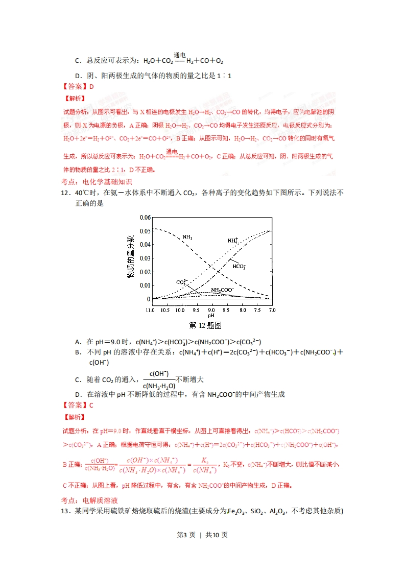 12015年普通高等学校招生全国统一考试(浙江卷)理科综合能力测试化学试题可能用到的相对原子质量:H1C12N14016Na23Al27S32Fe56Ag108I1277.下列说法不正确的是A.液晶态介于晶体状态和液态之间,液晶具有一定程度的晶体的有序性和液体的流动性B.常压下,0℃时冰的密度比水的密度小,水在4℃时密度最大,这些都与分子间的氢键有关C.石油裂解、煤的干馏、玉米制醇、蛋白质的变性和纳米银粒子的聚集都是化学变化D.燃料的脱硫脱氮、SO2的回收利用和NOx的催化转化都是减少酸雨产生的措施【答案】C【解析】试题分析:C.纳米银粒子的聚集属于物理变化。考点:考查液晶的性质、氢键、化学变化、减少酸雨的措施8.下列说法正确的是A.为测定新制氯水的pH,用玻璃棒蘸取液体滴在pH试纸上,与标准比色卡对照即可B.做蒸馏实验时,在蒸馏烧瓶中应加入沸石,以防暴沸。如果在沸腾前发现忘记加沸石,应立即停止加热,冷却后补加C.在未知溶液中滴加BCh2溶液出现白色沉淀,加稀硝酸,沉淀不溶解,说明该未知溶液中存在S0,2-或S032D.提纯混有少量硝酸钾的氯化钠,应采用在较高温度下制得浓溶液再冷却结晶、过滤、干燥的方法【答案】B【解析】试题分析:A,新制氟水具有漂白性,可氧化时试纸上的指示剂而使颜色变花或褪色,测定结果不准确,A不正确:C.该未知液中可能含有银离子,生成的白色沉淀可能是AgC,C不正确:D.提纯混有少量硝酸钾的氯化钠的正确操作是:燕发结晶、趁热过滤、洗涤、干燥,D不正确。考点:化学实验基本操作物质检验9.右下表为元素周期表的一部分,其中X、Y、Z、W为短周期元素,W元素的核电荷数为X元素的2倍。下列说法正确的是XTA.X、第9题表W、Z元素的原子半径及它们的气态氢化物的热稳定性均依次递增B.Y、Z、W元素在自然界中均不能以游离态存在,它们的最高价氧化物的水化物的酸性依次递增第1页1共10页C.YX2晶体熔化、液态WX3气化均需克服分子间作用力D.根据元素周期律,可以推测T元素的单质具有半导体特性,T2X3具有氧化性和还原性【答案】D【解析】试题分析:W元素的核电荷数为X的2倍,则X为氧元素、W为硫酸元素,根据元素在周期表中的位置关系可知:了为硅元素、Z为磷元素、T为砷元素,A.0、S、P的原子半径大小关系为:P>S>0,三种元素的气态氢化物的热稳定性为:H:O>H:S>PH:,A不正确:B.在火山口附近或出壳的岩层里,常常存在游离态的硫,B不正确:C.S:O:晶体为原子品体,熔化时不需克服分子间作用力,C不正确:D.在元素周期表中位于金属与非金属性交界线附近,具有半导体的特性,A:0:中砷为-3价,处于中间价,所以具有氧化性和还原性。考点:物质结构元素周期律10.下列说法不正确的是A.己烷有4种同分异构体,它们的熔点、沸点各不相同B.在一定条件下,苯与液溴、硝酸、硫酸作用生成溴苯、硝基苯、苯磺酸的反应都属于取代反应C.油脂皂化反应得到高级脂肪酸盐与甘油D.聚合物+CH2CH,2-9H-CH,)可由单体CHCH=CH2和CH2=CH2加聚制得CH3.【答案】A【解析】试题分析:A.己烷有5种同分异构体,分别是己烷(CH3CH2CH2CH2CH2CH3小、2一甲基戊烷[(CH32CH2CH2 CH2CH3]、3-甲基戊烷[CH3CH2CH(CH3CH2CHI、2,3-甲基丁烷[CH32 CHCH(CH3)2l、2,2-甲基丁烷(CH3CCH2CHl,A不正确。考点:有机物结构与性质基本营养物质11.在固态金属氧化物电解池中,高温共电解Hz0-C02混合气体制备H2和C0是一种新的能源利用方式,基本原理如图所示。下列说法不正确的是H20H2C02C0X多孔电极电源金属氧化物电解质多孔电极0第11题图A.X是电源的负极B.阴极的反应式是:H20+2e=H2十O2C02+2e=C0+第2页|共10页通电C.总反应可表示为:H20十C02=H2十C0十O2D.阴、阳两极生成的气体的物质的量之比是1:1【答案】D【解析】试题分析:从图示可看出,与X相连的电极发生H:0一H、C0一C0的转化,均得电子,应为电解池的阴极,则X为电源的负极,A正确:阴极H0一H、C0:一C0均得电子发生还原反应,电极反应式分别为:H0十2:=H+02、C0十2e=C0+0,B正确,从图示可知,H0一H2、C0一C0转化的同时有辆气生成,所以总反应可表示为:0+C0,通电+C0十0,C正确,从总反应可知,阴、阳两极生成的气体的物质的量之比2:1,D不正确.考点:电化学基础知识12.40℃时,在氨一水体系中不断通入C02,各种离子的变化趋势如下图所示。下列说法不正确的是0.060.05游、NH0.04锄岳0.03HCO湖0.020.010g…011.010.510.09.5908.58.07.57.0pH第12题图A.在pH=9.0时,c(NH4>c(HC0)>c(NH2C00)>c(CO32-)B.不同pH的溶液中存在关系:c(NH,1+c(H)=2c(CO32-)+c(HCO3)+c(NH2CO0)+c(OH)C(OHC.随着CO2的通入,一不断增大c(NHg-H2O)D.在溶液中pH不断降低的过程中,有含NH2COO的中间产物生成【答案】C【解析】试题分析:在pH=9.0时,作直线垂直于横坐标,从图上可直接看得出:c,>cHC0>c心Hi:C00)>cC0:,A正确,根据电荷守恒可得:c0NH.+cH=2cC0:)+cHC0:)十cNh:C00)+a0H,C(OH)c(OH)xc(H)K.B正:HOH,H.0)xc(WH7eH一,K不变,cH不断增大,则比值不断减小C不正确;从图上看,pH降低过程中,有含,有含H:C00的中间产物生成,D正确。考点:电解质溶液13.某同学采用硫铁矿焙烧取硫后的烧渣(主要成分为,Fe0g、SiO2、Al2O3,不考虑其他杂质)第3页|共10页