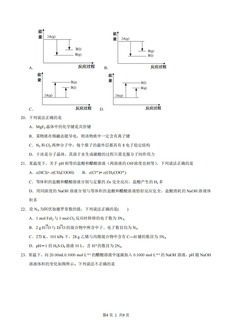 2016年4月浙江省普通高校招生选考科目考试化学试题第I卷(选择题)1.下列属于氧化物的是A.NaCl B.Mgo C.H2SO4 D.NaOH2.仪器名称为“烧瓶”的是3.下列属于非电解质的是(A.铜B.硝酸钾C.氢氧化钠D.蔗糖4.下列属于氧化还原反应的是A.2KBr+Ch=2KCI+Br2 B.CaCO3=CaO +CO21C.SO3+H2O=H2SO D.MgCl2+2NaOH=Mg(OH)2+NaCl5.下列物质的水溶液因水解而呈碱性的是A.NaCl B.NH4CI C.NaCO3 D.NaOH6.下列说法不正确的是A.氯气可用于自来水的消毒B.镁可用于制造信号弹和焰火C.氢氧化铁胶体能用于净水D.二氧化硫不可用于漂白纸浆7.下列表示正确的是()A.C02的电子式:QC:0:B.乙炔的结构式:CH=CHC.CH的球棍模型:D.C的结构示意图:8.下列有关钠及其化合物的说法不正确的是A.电解饱和食盐水可制取金属钠B.钠与氧气反应的产物与反应条件有关C.氧化钠与水反应生成氢氧化钠D.钠可以从四氯化钛中置换出钛9.下列说法正确的是A.某试样焰色反应呈黄色,则试样中含有K第1页丨共9页B.广泛pH试纸测得某碱性溶液的pH为12.5C.容量瓶不能用作溶解物质的容器D.粗盐的提纯试验中,滤液在坩埚中加热蒸发结晶10.下列说法不正确的是()A.C和C是一种核素B.红磷和白磷互为同素异形体C.CH3 COOCH-CH3和CHCH-COOCH3是不同物质D.CH;CH2OH可看成是由一C2H和一OH两种基团组成11.下列说法正确的是A.煤是无机化合物,天然气和石油是有机化合物B.利用化石燃料燃烧放出的热量使水分解产生氢气,是氢能开发的研究方向C.化学电源放电、植物光合作用都能发生化学变化,并伴随能量的转化D.若化学过程中断开化学键放出的能量大于形成化学键所吸收的能量,则反应放热12.可逆反应在一定条件下达到化学平衡时,下列说法不正确的是A.正反应速率等于逆反应速率B.反应物和生成物浓度不再发生变化C.反应体系中混合物的组成保持不变D.正、逆反应速率都为零13.下列离子方程式正确的是A.二氧化锰和浓盐酸反应:MnO2+4Ht+4C=Mn2+2C2↑+2H20B.二氧化硅和氢氧化钠溶液反应:SiO2+2OH=SiO32+H2OC.碳酸钡和稀硝酸反应:CO32+2H=CO2↑+H0D.铜和氯化铁溶液反应:Fe3t+Cu=Fe2+Cu2+14.W、X、Y、Z、N、M六种主族元素,它们在周期表中位置如图所示,下列说法不正确的是WNA.原子半径:Y>Z>WB.单质的还原性:X>YC.溴与元素M同主族,最高价氧化物的水化物的酸性比M的强D.元素N位于金属与非金属的分界线附近,可以推断N元素的单质可作半导体材料第2页1共9页15.有关苯的结构和性质,下列说法正确的是CHCHCH与CH:是同分异构体B.苯在空气中不易燃烧完全,燃烧时冒浓烟C.煤干馏得到的煤焦油可以分离出苯,苯是无色无味的液态烃D.向2mL苯中加入1mL酸性高锰酸钾溶液,震荡后静置,可观察到液体分层,上层呈紫红色16.下列说法不正确的是A.硬脂酸甘油酯属于高级脂肪酸甘油酯,是高分子化合物B.含淀粉或纤维素的物质可以制造酒精C.鸡蛋清的溶液中加入硫酸铜溶液,鸡蛋清凝聚,蛋白质变性D.不同种类的氨基酸能以不同的数目和顺序彼此结合,形成更复杂的多肽化合物17.MgH2O2电池是一种化学电源,以Mg和石墨为电极,海水为电解质溶液,示意图如图所示。下列说法不正确的是()电板一⑥石墨电极H.OA.石墨电极是该电池的正极B.石墨电极上发生还原反应C.Mg电极的电极反应式:Mg-2e-=Mg2+D.电池工作时,电子从Mg电极经导线流向石墨电极,再从石墨电极经电解质溶液流向Mg电极18.X(g+3Y(g)三2Z(g)△H=-a kJ-mol-1,一定条件下,将1molX和3molY通入2L的恒容密闭容器中,反应10min,测得Y的物质的量为2.4mol。下列说法正确的是A.10min内,Y的平均反应速率为0.03molL1s1B.第10min时,X的反应速率为0.01molL-lminC.10min内,消耗0.2molX,生成0.4molZD.l0min内,X和Y反应放出的热量为akJ19.2A(g)=B(g)△H1(△H1<0),2A(g)=B①)△H2,下列能量变化示意图正确的是第3页丨共9页