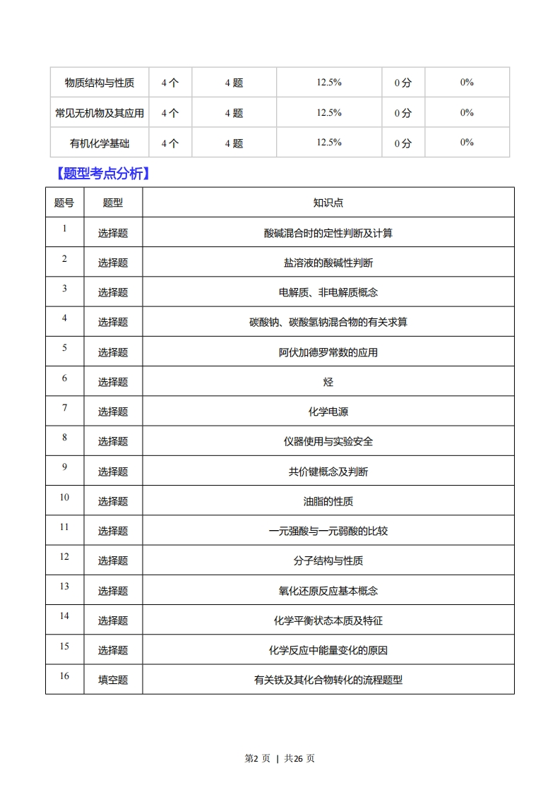 2016年4月浙江省普通高校招生选考科目考试化学试题【整体分析】题型统计(试题总量32)选择题25题78.1%推断题2题6.3%填空题1题3.1%实验题2题6.3%计算题1题3.1%简答题1题3.1%难易度统计(平均难度:0.56)容易3题9.4%较易6题18.8%一般18题56.3%较难5题15.6%困难0题知识点统计(考核知识点7个)知识点数量试题数量试题数量比分数分数占比认识化学科学7个7题21.9%0分0%化学实验基础3个3题9.4%0分0%化学反应原理9个9题28.1%0分0%化学与STSE1个1题3.1%0分0%第1页|共26页物质结构与性质4个4题12.5%0分0%常见无机物及其应用4个4题12.5%0分0%有机化学基础4个4题12.5%0分0%【题型考点分析】题号题型知识点1选择题酸碱混合时的定性判断及计算2选择题盐溶液的酸碱性判断3选择题电解质、非电解质概念选择题碳酸钠、碳酸氢钠混合物的有关求算J选择题阿伏加德罗常数的应用6选择题烃>选择题化学电源8选择题仪器使用与实验安全9选择题共价键概念及判断10选择题油脂的性质11选择题一元强酸与一元弱酸的比较12选择题分子结构与性质13选择题氧化还原反应基本概念14选择题化学平衡状态本质及特征15选择题化学反应中能量变化的原因16填空题有关铁及其化合物转化的流程题型第2页〡共26页17选择题常用仪器及使用18简答题盖斯定律与热化学方程式19计算题氧化还原反应的规律20选择题离子反应的发生条件21实验题物质分离、提纯综合应用22选择题酸、碱、盐、氧化物的概念及其相互联系23选择题化学反应的速率24选择题离子反应在化合物组成的分析、鉴定的应用25选择题能量的相互转化26选择题钠的化学性质27选择题化学在工业中的应用28推断题酯化反应29推断题有机合成综合考查30实验题碳酸氢钠的不稳定性31选择题元素周期表元素周期律32选择题元素周期表元素周期律第3页|共26页