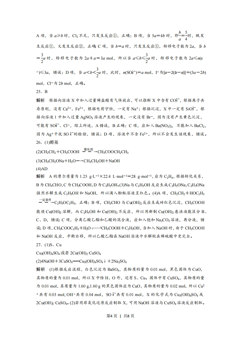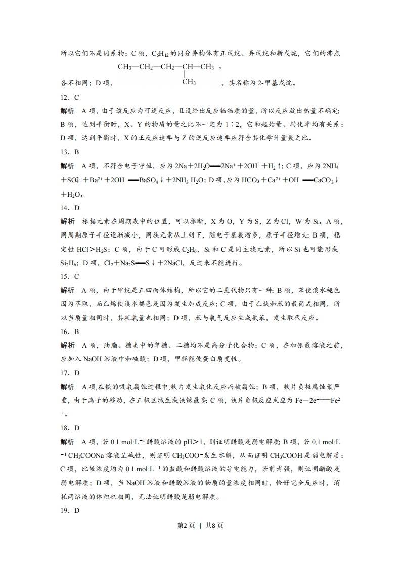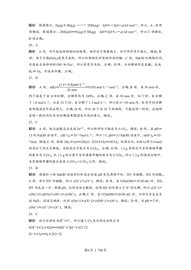 化学参考答案1.A解析酸是电离时生成的阳离子全部是H+的化合物,CO2为酸性氧化物,NaCl属于盐,NaOH属于碱。2.B解析A为烧杯,C为容量瓶,D为烧瓶。3.C解析酒精、蔗糖属于非电解质,铜丝属于单质,既不是电解质,也不是非电解质。4.A解析B项,H2还原CuO,H2作还原剂,H2O是氧化产物:C项,C2和H0反应,C2既是氧化剂又是还原剂:D项,SO3和HO反应不是氧化还原反应。5.B解析A项,NaOH水溶液显碱性是因为NaOH的电离:C项,NaCO,的水溶液因为CO的水解呈碱性:D项,NaCI的水溶液呈中性。6.C解析配制生理盐水用的是食盐:工业上利用SiO2、Na2CO3、CCO3在高温下制造普通玻璃:MgO的熔点很高,所以可用作耐高温材料:在海水中钠元素是以Na+形式存在。7.D解析A项,NaCl的电子式应为Na+[CI]:B项,二氧化碳的结构式应为OCO;C项,S2·的结构示意图:8.A解析SO2和品红发生化合反应而使品红溶液褪色,但褪色不稳定,加热会恢复红色。9.A解析石油、煤、天然气属于传统能源,均不能再生。10.A解析B项,烧瓶不能用酒精灯直接加热,应垫石棉网:C项,氯化氢在水中才能发生电离,所以氯化氢气体不能使千燥的蓝色石蕊试纸变红:D项,由于玻璃中的SiO2能和NOH反应,所以盛放NOH的试剂瓶不能用玻璃塞,应用橡胶塞。11.B解析A项,16C中质子数为6,中子数为8:B项,CHOH是一元醇,而甘油是三元醇,第1页」共8页所以它们不是同系物:C项,CH2的同分异构体有正戊烷、异戊烷和新戊烷,它们的沸点CH3-CH2-CH2-CH-CH3各不相同:D项,CH3,其名称为2甲基戊烷。12.C解析A项,由于该反应为可逆反应,且没给出反应物物质的量,所以反应放出热量不确定:B项,达到平衡时,X、Y的物质的量之比不一定为1:2,它和起始量、转化率均有关系:D项,达到平衡时,X的正反应速率与Z的逆反应速率应符合其化学计量数之比。13.B解析A项,不符合电子守恒,应为2Na+2H,O一2Na++2OH+H2↑:C项,应为2NH+SO-+Ba2++20H-=BaS04↓+2NH3H20:D项,应为HC05+Ca2++OH-=CaC03+H20。14.D解析根据元素在周期表中的位置,可以推断,X为O,Y为S,Z为C,W为Si。A项,同周期原子半径逐渐减小,同族元素从上到下,随电子层数增多,原子半径增大:B项,稳定性HC>HS:C项,由于C可形成C2H6,Si和C是同主族元素,所以Si也可能形成Si2H6:D项,C2+NaS-S↓十2 NaCI,,反过来不能进行。15.C解析A项,由于甲烷是正四面体结构,所以它的二氯代物只有一种:B项,苯使溴水褪色因为萃取,而乙烯使溴水褪色是因为发生加成反应:C项,由于乙炔和苯的最简式相同,所以当质量相同时,其耗氧量也相同:D项,苯与氯气反应生成氯苯,发生取代反应。16.B解析A项,油脂、糖类中的单糖、二糖均不是高分子化合物:C项,在加银氨溶液之前,应加入NaOH溶液中和硫酸:D项,甲醛能使蛋白质变性。17.D解析A项,在铁的吸氧腐蚀过程中,铁片发生氧化反应而被腐蚀:B项,铁片负极腐蚀最严重,由于离子的移动,在正极区域生成铁锈最多:C项,铁片负极反应式应为Fe-2e一Fe2+。18.D解析A项,若0.1molL-1醋酸溶液的pH>1,则证明醋酸是弱电解质:B项,若0.1molL-1 CH;COONa溶液呈碱性,则证明CH;COO-发生水解,从而证明CH;COOH是弱电解质:C项,比较浓度均为0.1moL-1的盐酸和醋酸溶液的导电能力,若前者强,则证明醋酸是弱电解质:D项,当NOH溶液和醋酸溶液的物质的量浓度相同时,恰好完全反应时,消耗两溶液的体积也相同,无法证明酷酸是弱电解质。19.D第2页」共8页解析根据图示,N2(g)+3H(g)三2NH(g)△H=一2(b-a)kJ-mol-1,所以,A、B两项错误,根据图示:2NH)—N2(g)十3H2(g)△H=2(b十c-a)kJ-mol-1,所以C项错误,D项正确。20.A解析A项,对于组成结构相似的物质,相对分子质量越大,分子间作用力越大,错误:B项,由于石英(SiO2)是原子晶体,所以加热熔化时需破坏共价键:C项,NaOH加热熔化时,电离成自由移动的OH-和Na+,所以具有导电性,正确:D项,水分解破坏氢氧键,生成H2和02,形成共价键,正确。21.D解析A项,cR)=L4-0.8molL-=0.030molL-lmin-1,正确B项,在50min时,20 min两个温度下R全部分解,分解率均为100%,正确:C项,在50min时,30℃时,R分解了1.6molL-1,而在25℃时,R分解了1.3molL-1,所以在0~50min内,R的平均分解速率随温度升高而增大,正确:D项,对比30℃和10℃的曲线,不能在同一时刻,应指明在同一段时间内R的分解速率随温度升高而增大,错误。22.C解析A项,铁与盐酸反应生成F©2+,所以转移电子数应为0.1N,错误:B项,在pH=13的NaOH溶液中,cH+)*=10-13molL-1,所以1LpH=13NaOH溶液中,n(H+)*=10-13mol,错误C项,根据2H2十02一2H20、2C0+02=2C02,标准状况,8.96L(即0.4mol)该混合气体完全燃烧,消耗氧分子数目为02NA,正确:D项,1.2g金刚石中含有碳碳单键的数目为0.2NA,而12g的石墨中含有碳碳单键的数目为0.15NA,所以1.2g的该混合物中,含有碳碳单键的数日应在0.15NA~0.2NA之间,错误。23.B解析根据加入的NaOH溶液体积和混合溶液pH变化曲线可知,HY为强酸,HX为弱酸。A项,由于HY为强酸,所以c(X-)cNa+)>cHX)>c(H+)>c(OH),正确:C项,当V(NaOH=20.00mL时,正好完全反应生成NaX,溶液呈碱性,此时cNa+)>c(X-)>c(OH-)>cH+),错误:D项,当pH=7时,cNa+)=cY-)>cX-),错误。24.C解析由于还原性SO乃>~,所以通入C2发生的反应依次为S03-+Ch2+H20=S03-+2H++2C-①2I-+Cl—↓2+2C-②第3页|共8页