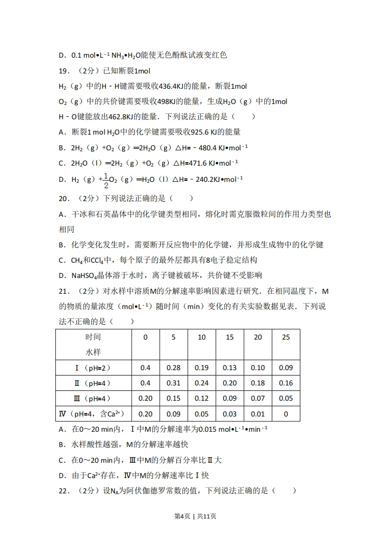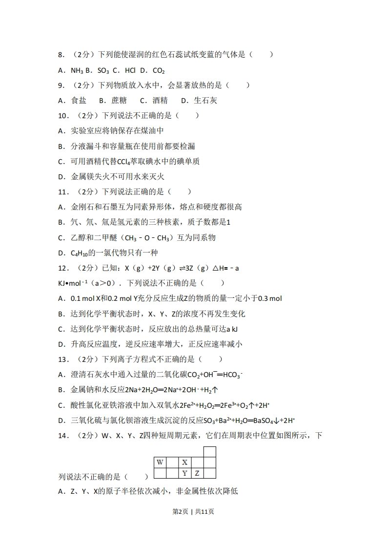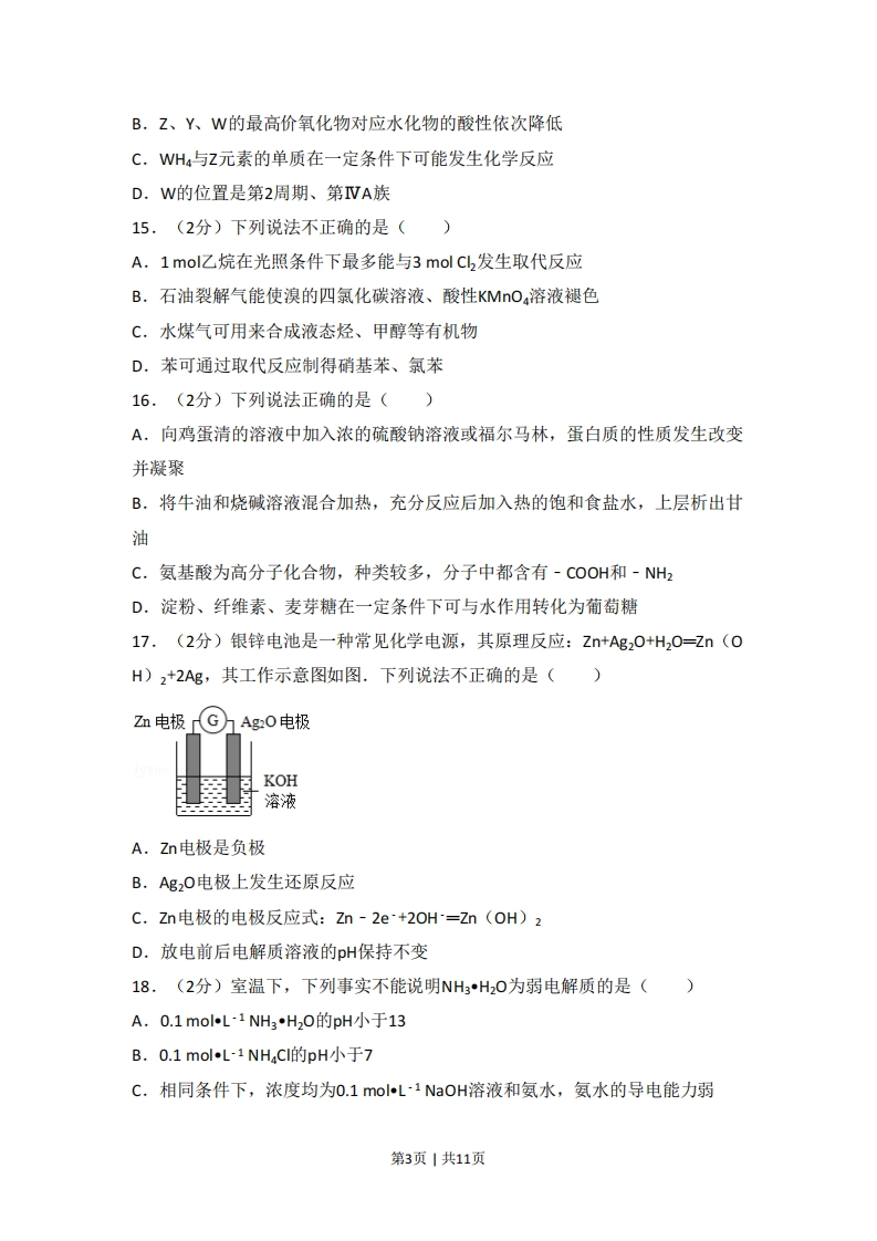 2017年浙江省普通高校招生选考化学试卷(4月份)一、选择题(本大题共25小题,每小题2分,共50分.每个小题列出的四个备选项中只有一个是符合题目要求的,不选、多选、错选均不得分)1.(2分)下列属于盐的是()A.NaClB.KOHC.HNO3 D.CO22.(2分)仪器名称为“量筒”的是().9D3.(2分)下列属于非电解质的是(A.葡萄糖B.氢氧化钠C.氯化钾D.铁4.(2分)下列属于氧化还原反应的是()A.2NaHCO3△Na2C03+H20+C02个B.Na,0+H2O=2NaOHC.2KI+Br=2KBr+l2D.Mg0+2HCEMgCl2+H2O5.(2分)下列分散系能产生丁达尔效应”的是()A.稀硫酸B.硫酸铜溶液C.氢氧化铁胶体D.酒精溶液6.(2分)下列说法不正确的是()A.二氧化碳是酸雨的主要成分B.氢气是一种理想的清洁燃料C.碳酸氢钠可用于治疗胃酸过多D.氯化铁溶液可用于制作印刷铜电路板7.(2分)下列表示不正确的是()A.c0的电子式0:C:过B.C2的结构式:Cl-CIC.CH4的球棍模型D.C离子的结构示意图第1页1共11页8.(2分)下列能使湿润的红色石蕊试纸变蓝的气体是()A.NH3 B.SO3 C.HCI D.CO29.(2分)下列物质放入水中,会显著放热的是()A.食盐B.蔗糖C.酒精D.生石灰10.(2分)下列说法不正确的是()A.实验室应将钠保存在煤油中B.分液漏斗和容量瓶在使用前都要检漏C.可用酒精代替cC4萃取碘水中的碘单质D.金属镁失火不可用水来灭火11.(2分)下列说法正确的是()A.金刚石和石墨互为同素异形体,熔点和硬度都很高B.氕、氘、氚是氢元素的三种核素,质子数都是1C.乙醇和二甲醚(CH3-O-CH3)互为同系物D.C4Ho的一氯代物只有一种12.(2分)已知:X(g)+2Y(g)=3Z(g)△H=-aKJmo1(a>0),下列说法不正确的是()A.0.1molX和0.2molY充分反应生成Z的物质的量一定小于0.3molB.达到化学平衡状态时,X、Y、Z的浓度不再发生变化C.达到化学平衡状态时,反应放出的总热量可达akJD.升高反应温度,逆反应速率增大,正反应速率减小13.(2分)下列离子方程式不正确的是()A.澄清石灰水中通入过量的二氧化碳C02+OHT=HC03B.金属钠和水反应2Na+2H2O=2Na+2OH+H2个C.酸性氯化亚铁溶液中加入双氧水2Fe2+H2O2=2Fe3+02个+2HD.三氧化硫与氯化钡溶液生成沉淀的反应S03+Ba2+H20=BaS04↓+2H14,(2分)W、X、Y、Z四种短周期元素,它们在周期表中位置如图所示,下X列说法不正确的是(YZA.Z、Y、X的原子半径依次减小,非金属性依次降低第2页1共11页B.Z、Y、W的最高价氧化物对应水化物的酸性依次降低C.WH4与Z元素的单质在一定条件下可能发生化学反应D.W的位置是第2周期、第IVA族15.(2分)下列说法不正确的是()A.1mol乙烷在光照条件下最多能与3 mol Cl2发生取代反应B.石油裂解气能使溴的四氯化碳溶液、酸性KMO,溶液褪色C.水煤气可用来合成液态烃、甲醇等有机物D,苯可通过取代反应制得硝基苯、氯苯16.(2分)下列说法正确的是()A,向鸡蛋清的溶液中加入浓的硫酸钠溶液或福尔马林,蛋白质的性质发生改变并凝聚B,将牛油和烧碱溶液混合加热,充分反应后加入热的饱和食盐水,上层析出甘油C.氨基酸为高分子化合物,种类较多,分子中都含有-C0OH和-NH2D.淀粉、纤维素、麦芽糖在一定条件下可与水作用转化为葡萄糖17.(2分)银锌电池是一种常见化学电源,其原理反应:Zn+Ag0+H20=Zn(0H)2+2Ag,其工作示意图如图.下列说法不正确的是()Zm电极GhAg0电极KOH溶液A.Zn电极是负极B.Ag20电极上发生还原反应C.Zn电极的电极反应式:Zn-2e+2OH=Zn(OH)2D.放电前后电解质溶液的pH保持不变18.(2分)室温下,下列事实不能说明NH3H20为弱电解质的是()A.0.1molL1NH3H20的pH小于13B.0.1molL-1NH4CI的pH小于7C.相同条件下,浓度均为0.1molL1NaOH溶液和氨水,氨水的导电能力弱第3页1共11页