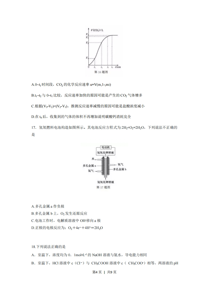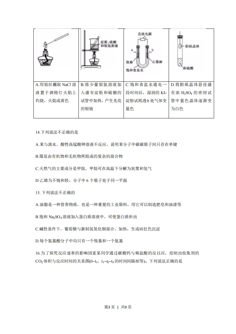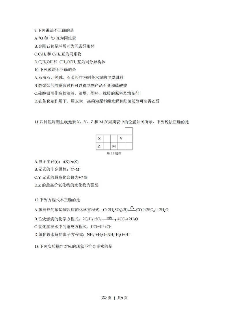 2019年1月浙江省学业水平测试化学试卷可能用到的相对原子质量:H1C12016Na23S32Fe6Cu64Ba137一、选择题(本大题共25小题,每小题2分,共50分。每小题列出的四个备选项中只有一个是符合题目要求的,不选、多选、错选均不得分)1.水的分子式是A.H2BO2C HODCO22.根据物质的组成与性质进行分类,Mg0属于A.氧化物B.酸C碱D.盐3.仪器名称为“胶头滴管”的是4.冰毒有剧毒,人体摄入后将严重损害心脏、大脑组织甚至导致死亡,严禁吸食。它的分子式为C1HN,其中的氮元素在周期表中处于A.第A族B.第ⅢA族C.第IVA族C.第VA族5.萃取碘水中的碘单质,可作萃取剂的是A.水B四氯化碳C.酒精D.食醋6.反应2Na+2Hz0=2NaOH+H2↑中,氧化剂是A.NaB.H2OC.NaOHD.H27.下列属于弱电解质的A.NH3H2OB.NaOHC.NaClD.CHCHOH8.下列表示不正确的是A.甲烷分子的比例模型B.乙烷的结构简式为CH,CH285C.磷原子的结构示意图为CI Mg CID.MgCI2的电子式为:第1页1共9页9.下列说法不正确的是A160和180互为同位素B.金刚石和足球烯互为同素异形体C.CH和C3H6互为同系物D.C2HOH和CH;OCH3互为同分异构体10.下列说法不正确的是A.石灰石、纯碱、石英可作为制备水泥的主要原料B.燃煤烟气的脱硫过程可以得到副产品石膏和硫酸铵C.硫酸钡可作高档油漆、油墨、塑料、橡胶的原料及填充剂D.在催化剂作用下,用玉米、高梁为原料经水解和细菌发酵可制得乙醇11四种短周期主族元素X、Y、Z和M在周期表中的位置如图所示。下列说法正确的是XZM第11题图A.原子半径():rX)>r(Z)B.元素的非金属性:Y>MC.Y元素的最高化合价为+7价D.Z的最高价氧化物的水化物为强酸12.下列方程式不正确的是A.碳与热的浓硫酸反应的化学方程式:C+2H2S0(浓)△C0↑+2S02↑+2H20B.乙炔燃烧的化学方程式:2C2H2+502点“)4C02+2H20C.氯化氢在水中的电离方程式:HC=H+CD.氯化铵水解的离子方程式:NHt+H2O=NHHO+H13.下列实验操作对应的现象不符合事实的是第2页1共9页直流电源淀粉、硫酸和银氨溶液开胆矾品体铁棒石墨棒饱和食盐水浓硫酸A.用铂丝蘸取NaCI溶B.将少量银氨溶液加C.饱和食盐水通电D.将胆矾晶体悬挂盛液置于酒精灯火焰上入盛有淀粉和硫酸的段时间后,湿润的KI有浓H2SO4的密闭试灼烧,火焰成黄色试管中加热,产生光亮淀粉试纸遇b处气体变管中蓝色晶体逐渐变的银镜蓝色为白色14.下列说法不正确的是A苯与溴水、酸性高锰酸钾溶液不反应,说明苯分子中碳碳原子间只存在单键B.煤是由有机物和无机物所组成的复杂的混合物C.天然气的主要成分是甲烷,甲烷可在高温下分解为炭黑和氢气D.乙烯为不饱和烃,分子中6个原子处于同一平面15.下列说法不正确的A油脂是一种营养物质,也是一种重要的工业原料,用它可以制造肥皂和油漆等B.饱和Na2SO4溶液加入蛋白质溶液中,可使蛋白质析出C碱性条件下,葡萄糖与新制氢氧化铜混合、加热,生成砖红色沉淀D.每个氨基酸分子中均只有一个羧基和一个氨基16.为了探究反应速率的影响因素某同学通过碳酸钙与稀盐酸的反以应,绘制出收集到的CO2体积与反应时间的关系图(0~1、1~~3的时间间隔相等)。下列说法正确的是第3页丨共9页