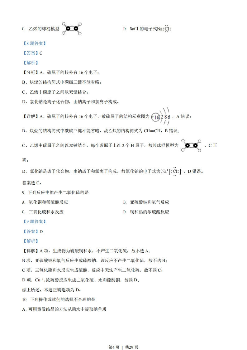 浙江省普通高校招生选考科目2018年4月考试化学试题1.下列属于酸的是A.HNO,B.CaCOC.C02D.NaOH【1题答案】【答案】A【解析】【分析】酸是在水溶液中电离出的阳离子全部是氢离子的化合物,据此分析。【详解】A项,NO水溶液中电离出的阳离子全部是氢离子,属于酸,故A项正确:B项,CCO2是金属阳离子和酸根阴离子结合的盐,故B项错误:C项,二氧化碳不能电离,属于非金属氧化物,故C项错误:D项,氢氧化钠电离产生的阳离子为钠离子,阴离子为氢氧根离子,属于碱,故D项错误。综上所述,本题正确答案为A。2.下列仪器名称为“漏斗”的是C.【2题答案】【答案】D【解析】【分析】根据仪器的特征分析仪器的名称。【详解】根据仪器的特征知:A为冷凝管,B为容量瓶,C为量筒,D为漏斗,故该题选D。3.下列属于电解质的是A.氯化钠B.蔗糖C.氯气D.铁【3题答案】【答案】A【解析】第1页」共29页【分析】电解质:在水溶液中或熔融状态下能导电的化合物:例酸、碱、盐,金属氧化物等:非电解质:在水溶液中和熔融状态下不能导电的化合物:例:大多数有机物,非金属氧化物:电解质与非电解质都是化合物,据此分析解答。【详解】A项,氯化钠溶于水或熔融状态下可以导电,是电解质,故A项正确:B项,蔗糖的水溶液或熔融状态都不导电,是非电解质,故B项错误:C项,氯气是单质,既不是电解质也不是非电解质,故C项错误:D项,铁是单质,既不是电解质也不是非电解质,故D项错误。综上所述,本题正确答案为A。【点睛】本题考查了电解质的判断,注意电解质和非电解质都必须是化合物,单质和混合物既不是电解质也不是非电解质。4.下列物质溶于水后溶液显酸性的是A.KCIB.Na2OC.NH CID.CHCOONa【4题答案】【答案】C【解析】【详解】A项,KC1为强酸强碱盐,溶液呈中性,故A项错误:B项,Nz0为碱性氧化物,溶于水生成氢氧化钠,溶液呈碱性,故B项错误:C项,NH,C1为强酸弱碱盐,溶于水后铵根离子水解产生H,溶液呈酸性,故C项正确:D项,CH,C0ONa为强碱弱酸盐,溶于水后醋酸根离子水解产生OH,溶液呈碱性,故D项错误。综上所述,本题的正确答案为C。5.下列属于物理变化的是A.煤的气化B.天然气的燃烧C.烃的裂解D.石油的分馏【5题答案】【答案】D【解析】【分析】无新物质生成的变化为物理变化,有新物质生产的变化为化学变化,据此分析。【详解】A、煤的气化是用煤和水在高温条件下来生产C0和H2的过程,故为化学变化,A错误:B、天然气燃烧生成二氧化碳和水,故为化学变化,B错误:C、烃的裂解是用重油为原料来生产乙烯等短链烯烃的过程,有新物质生成,故为化学变化,C错误:D、石油的分馏是利用石油中各组分的沸点的不同、用加热的方法将各组分分离的方法,无新物质生成,故为物理变化,D正确:第2页」共29页答案选D。6.下列说法不正确的是A.纯碱可用于去除物品表面的油污B.二氧化碳可用作镁燃烧的灭火剂C.植物秸秆可用于制造酒精D.氢氧化铁胶体可用作净水剂【6题答案】【答案】B【解析】【详解】A项,纯碱水溶液呈碱性,油脂在碱溶液中水解生成溶于水的物质,可用于去除物品表面的油污,故A项正确:B项,镁可以与二氧化碳发生反应,二氧化碳不能作为镁的灭火剂,故B项错误:C项,纤维素能够水解变成葡萄糖,葡萄糖在某些酶的作用下可以转化为乙醇,故C项正确:D项,氢氧化铁的胶体具有吸附性,能够吸附水中固体杂质颗粒,可以作为净水剂,故D项正确。综上所述,本题的答案选项为B项。.下列变化过程中,加入氧化剂才能实现的是A.C12→C1B.II2C.S02→S02D.Cu0-Cu【7题答案】【答案】B【解析】【分析】化合价升高元素所在的反应物是还原剂,实现化合价的升高要加入氧化剂,以此解答。【详解】A、C2→C,氯元素化合价由0价降到-1价,所以可以加入还原剂来实现,故A错误:B、下→2,碘元素的化合价由1价升高到0价,所以需加入氧化剂才能实现,故B正确:C、SO2→SO2中,没有元素化合价变化,不是氧化还原反应,故C错误:D、CuO→C山铜元素的化合价降低了,所以需加入还原剂才能实现,故D错误。故选B。【点睛】该题的关键是要理解氧化还原反应的概念,例如,还原剂、氧化剂,被氧化、被还原等。其次要根据题给信息得出所给微粒中有关元素的化合价必须升高这一关键。最后要注意自身发生氧化还原反应的微粒,如C12→C1,NO2→N0等,应引起足够重视。8.下列表示正确的是A.硫原子结构示意图①B.乙炔的结构简式CHCH第3页」共29页